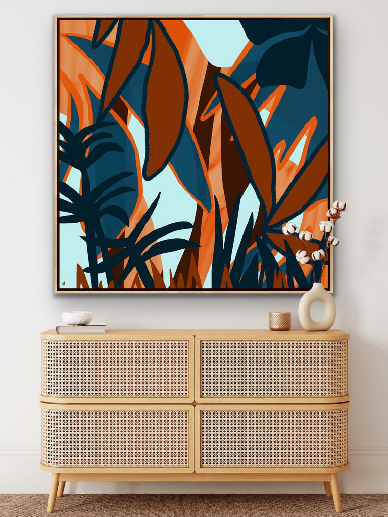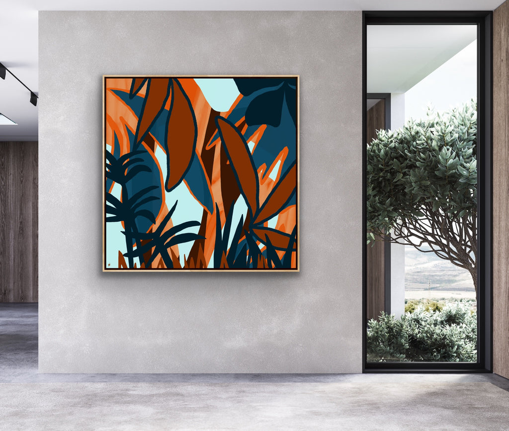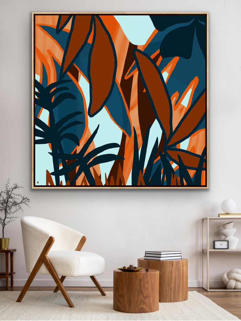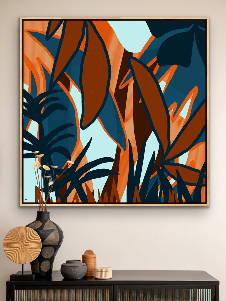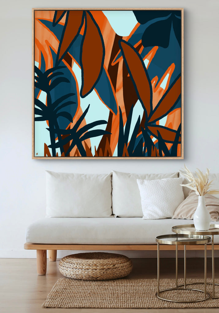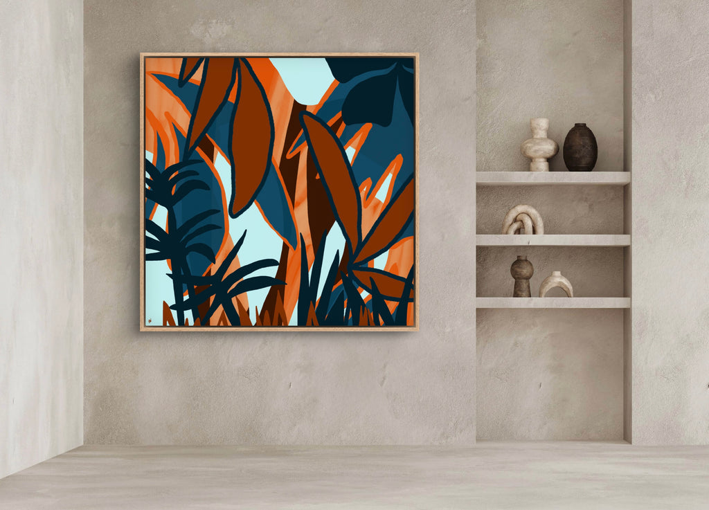 Float framed in premium 1 cm wide x 5.5 cm deep Oak, White or Black Frame with a ‘shadow’ line between frame and canvas. Ready to hang.