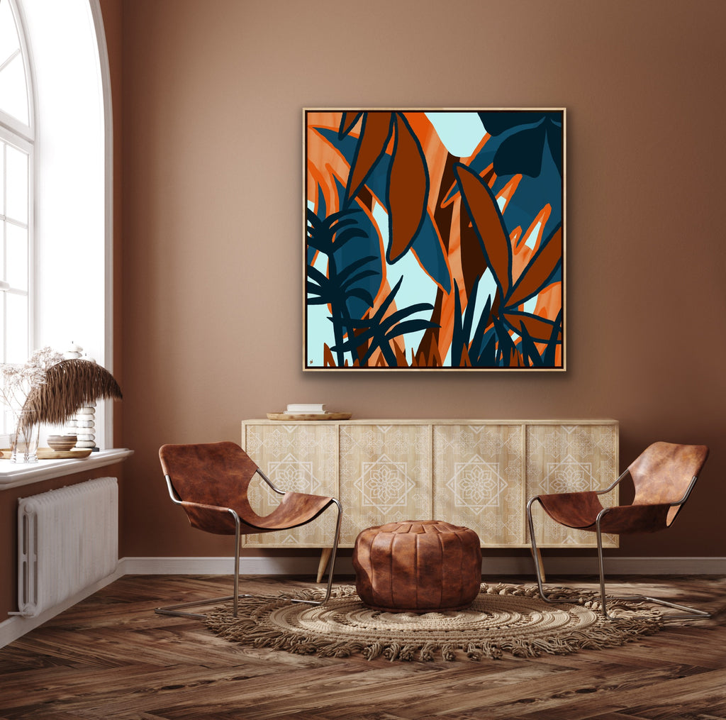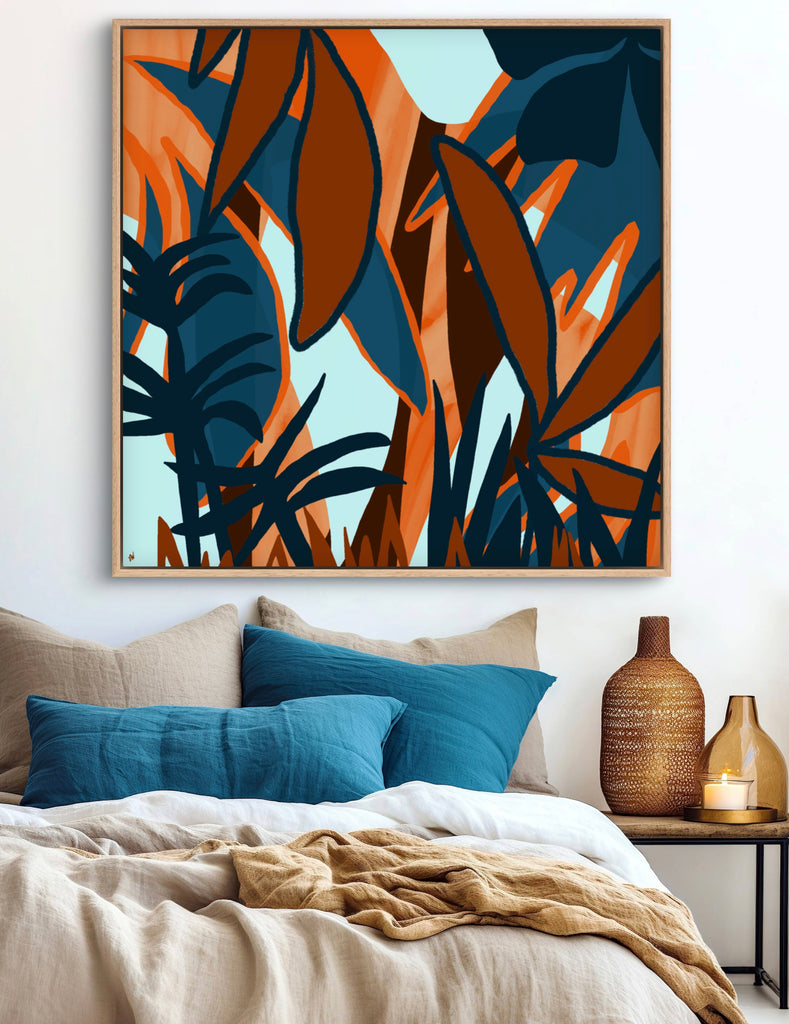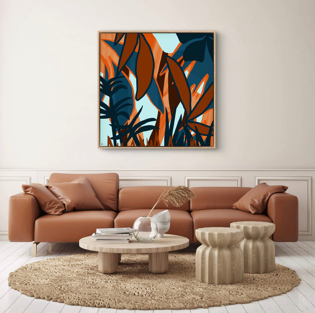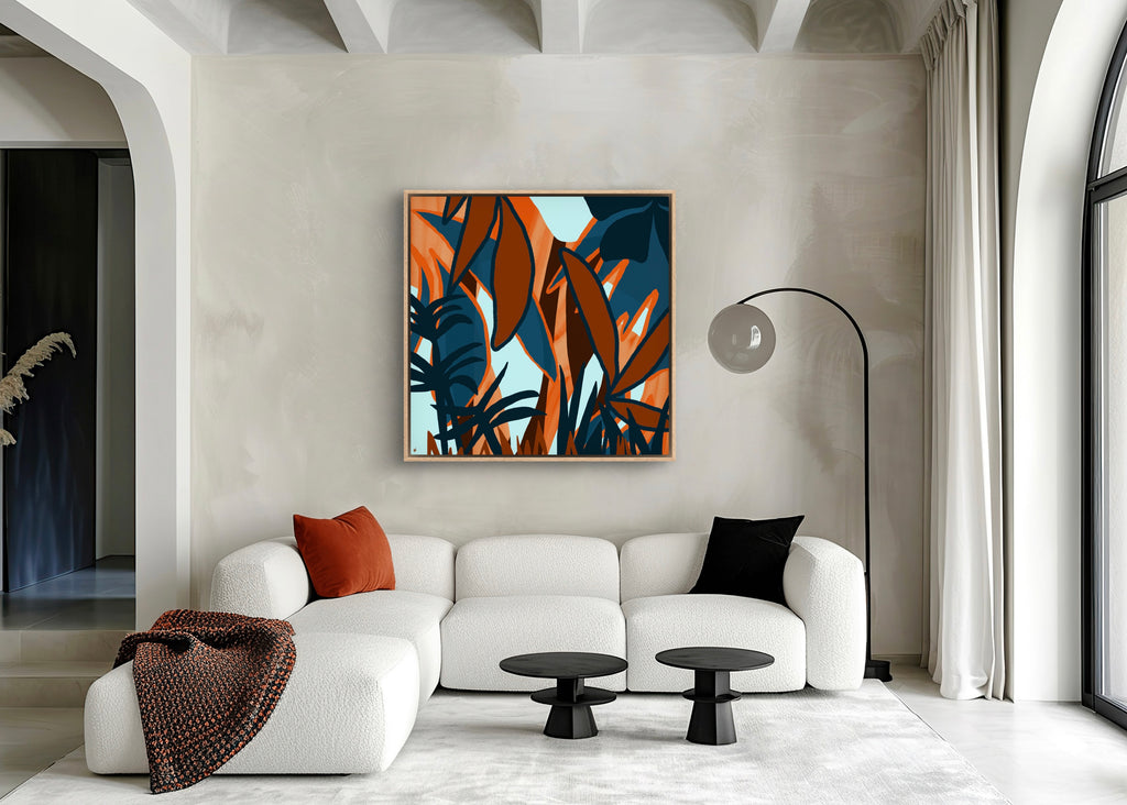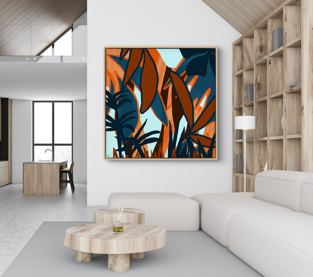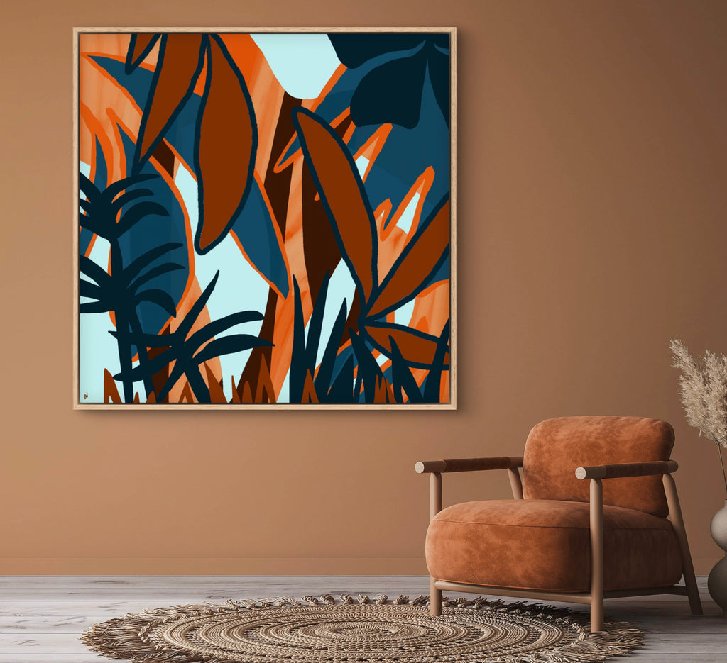 Float framed in premium 1 cm wide x 5.5 cm deep Oak, White or Black Frame with a ‘shadow’ line between frame and canvas. Ready to hang.