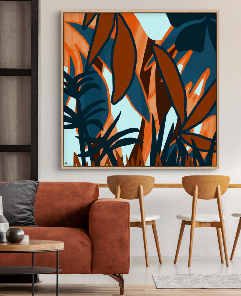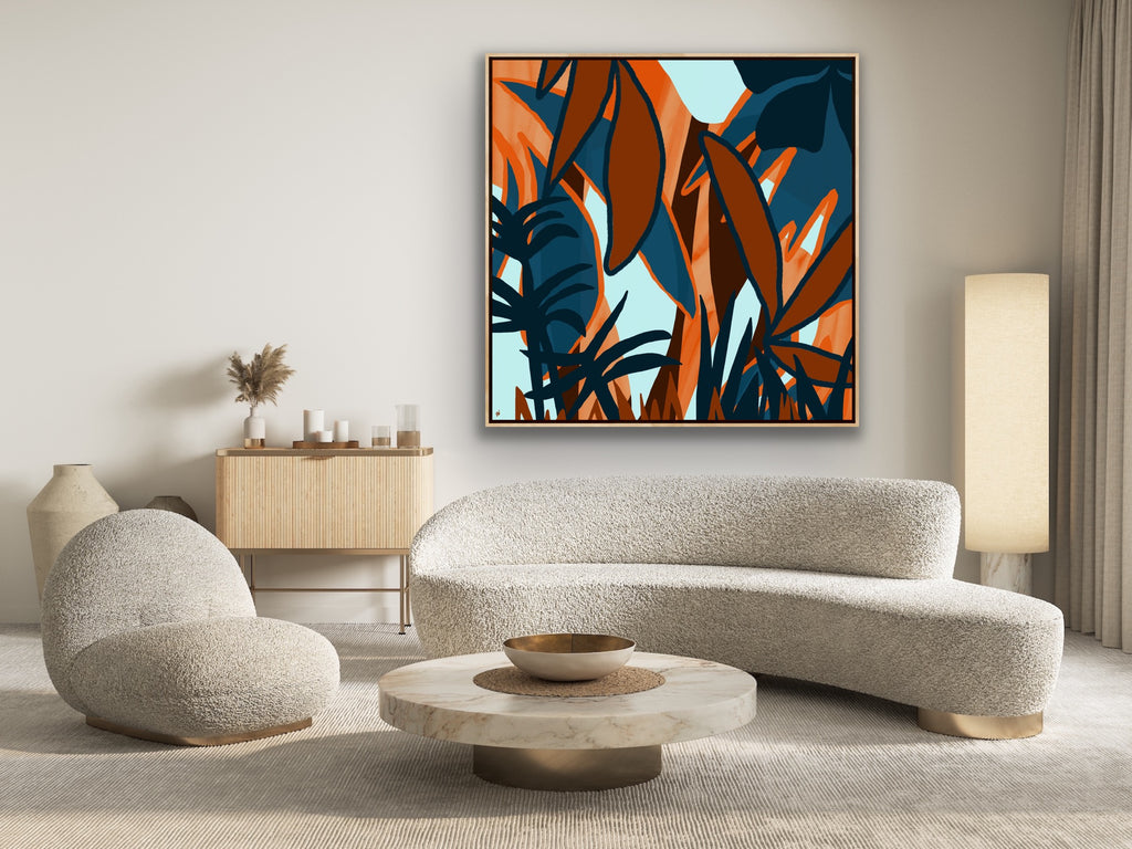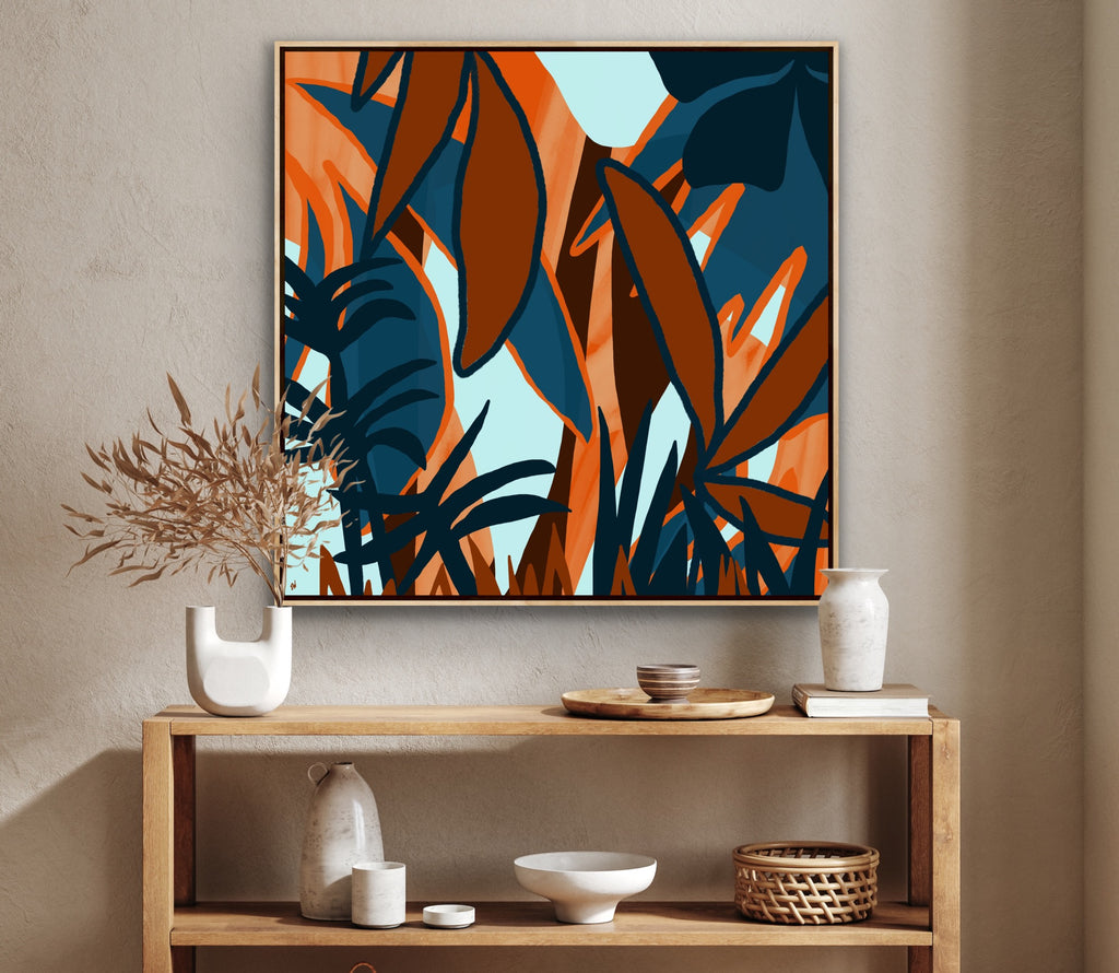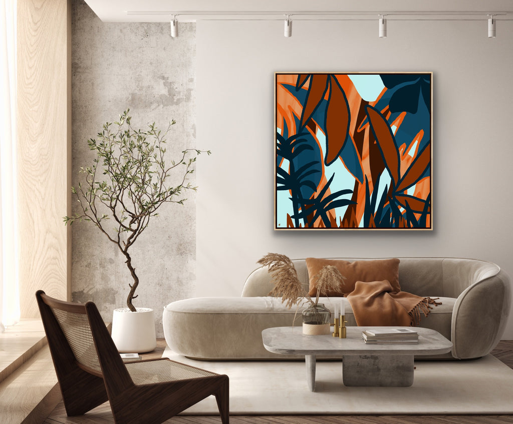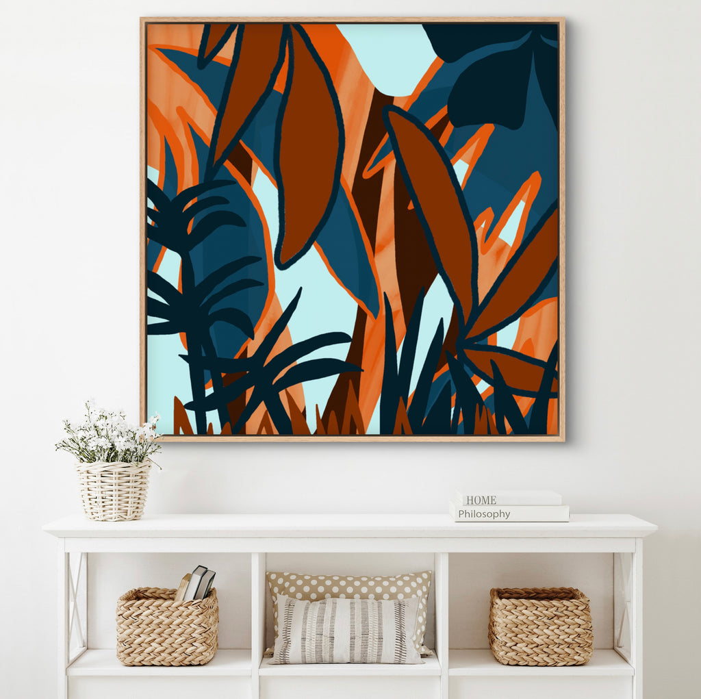 Float framed in premium 1 cm wide x 5.5 cm deep Oak, White or Black Frame with a ‘shadow’ line between frame and canvas. Ready to hang.