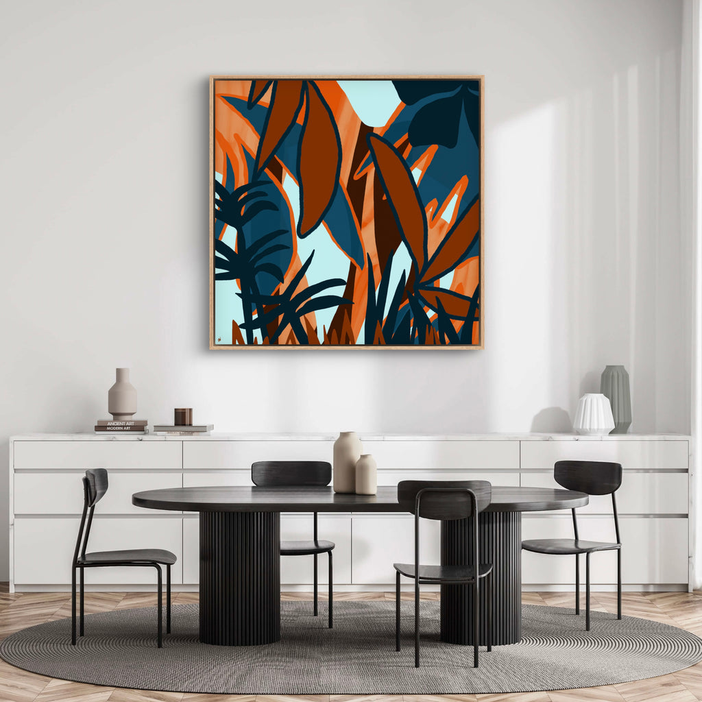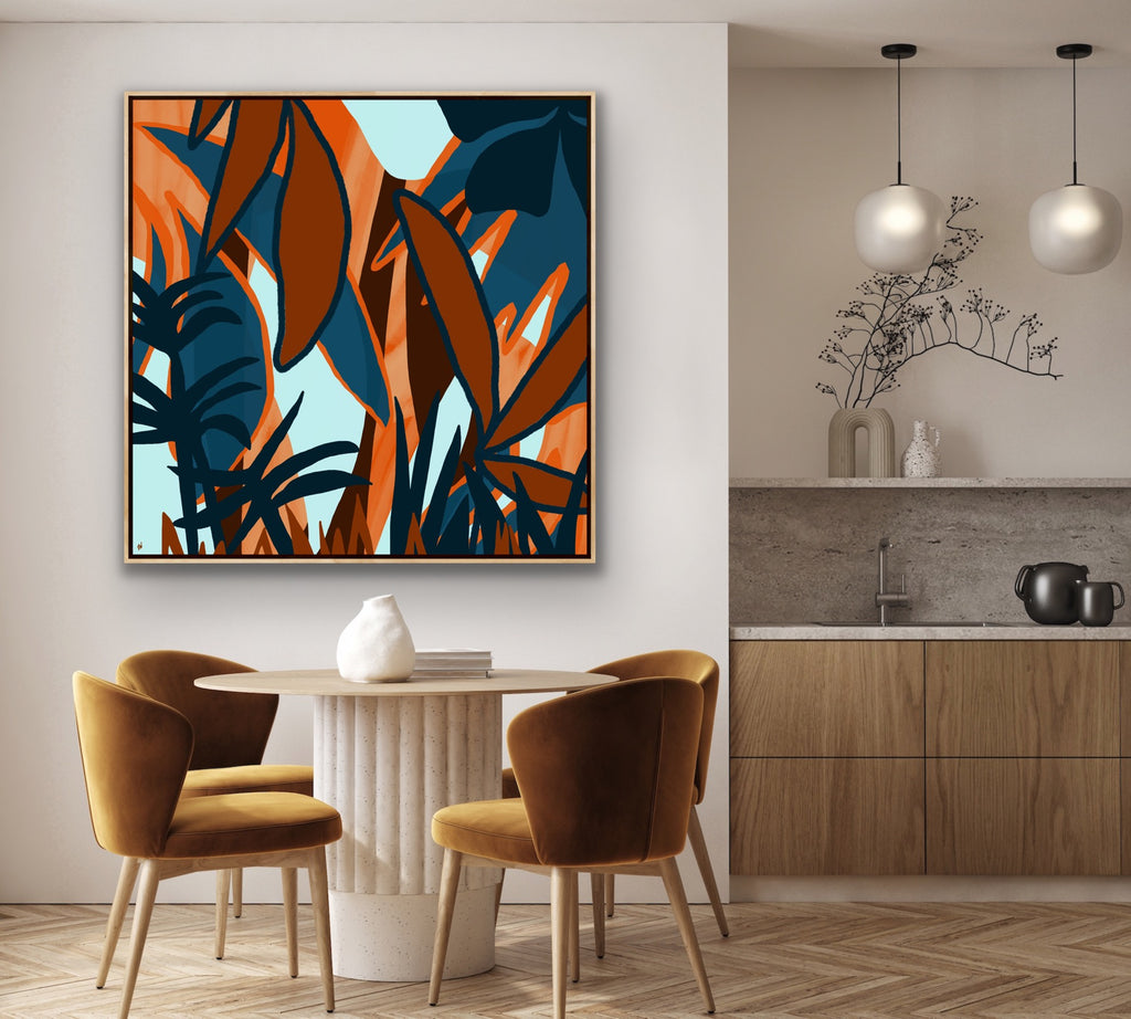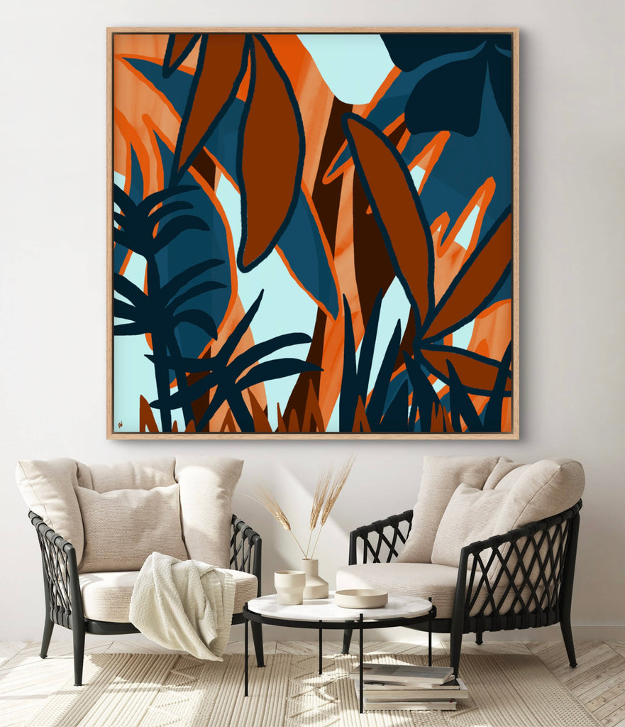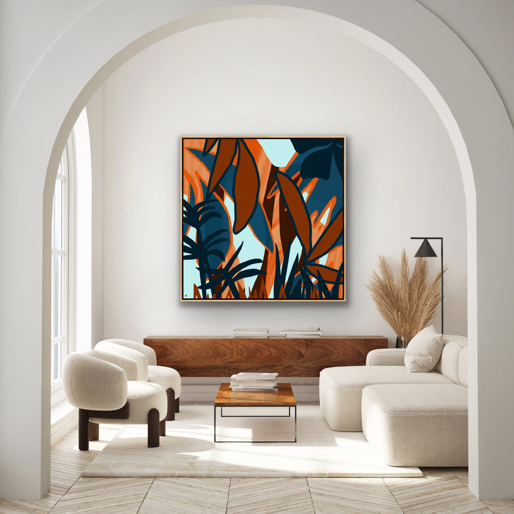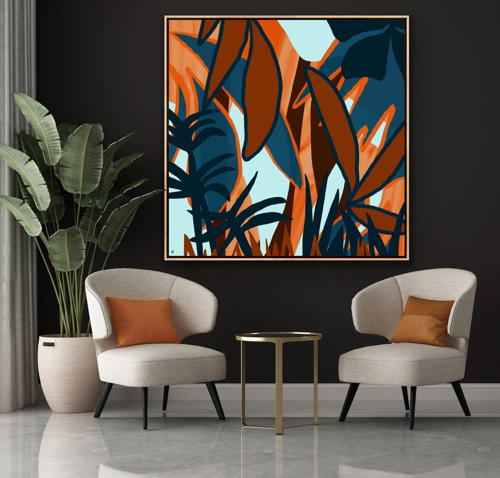 Float framed in premium 1 cm wide x 5.5 cm deep Oak, White or Black Frame with a ‘shadow’ line between frame and canvas. Ready to hang.