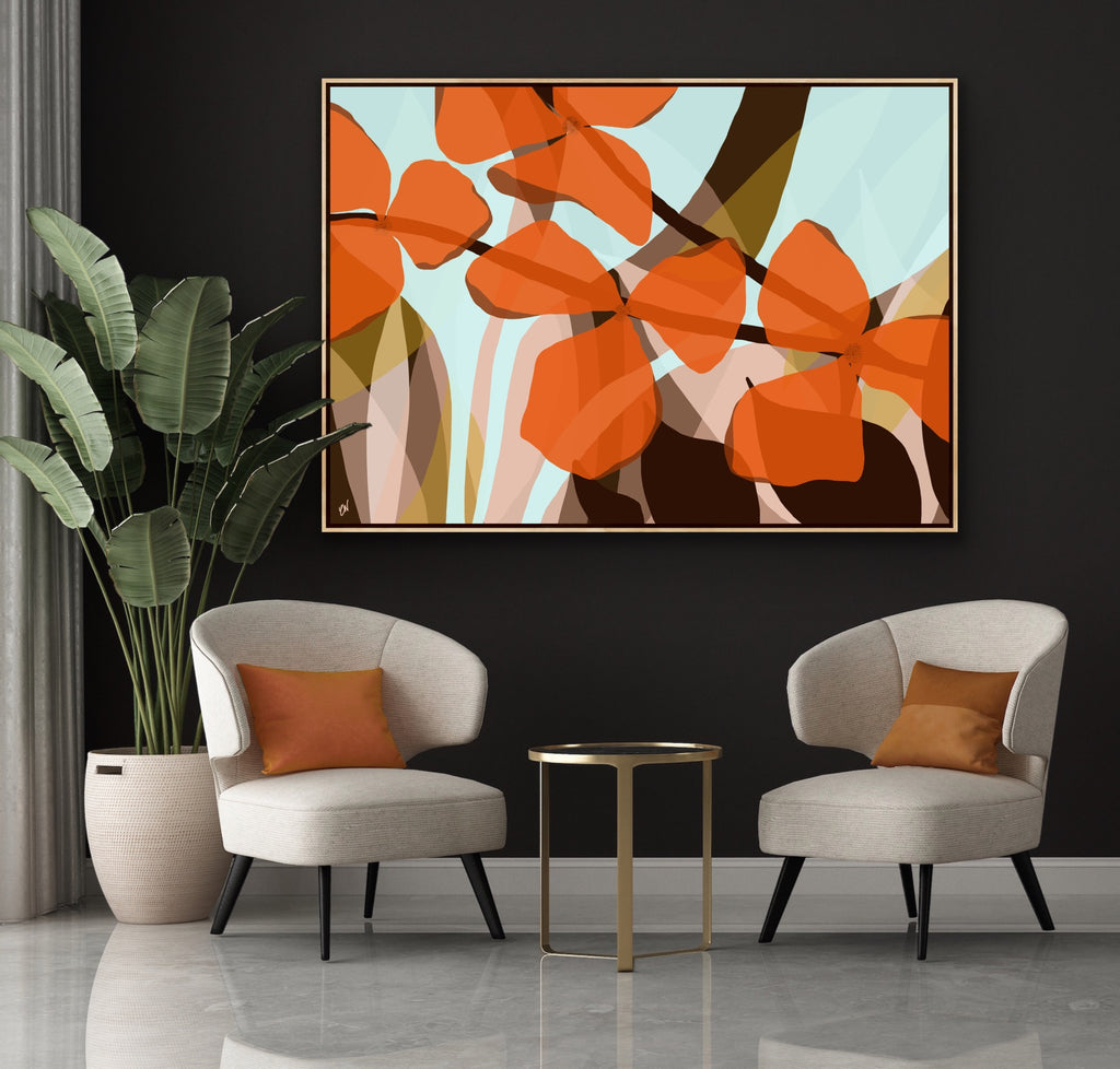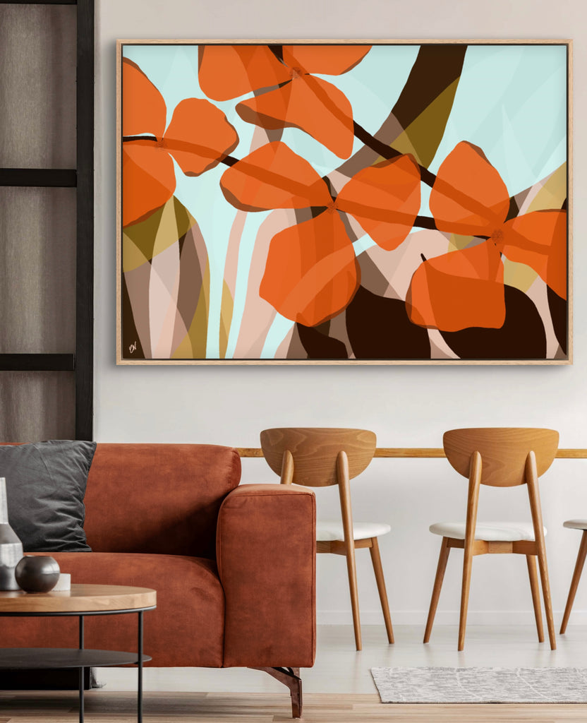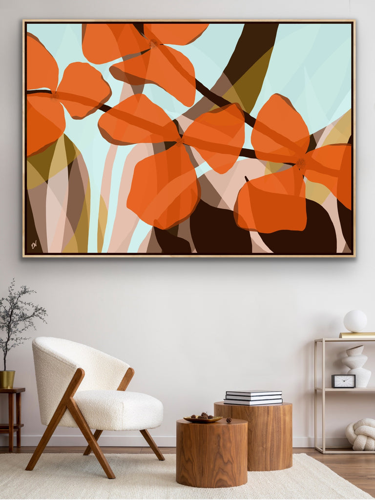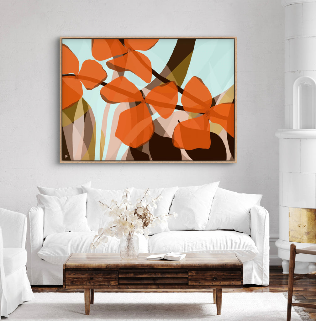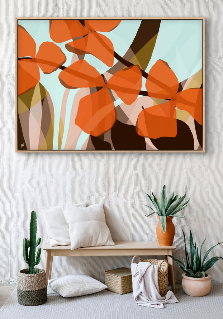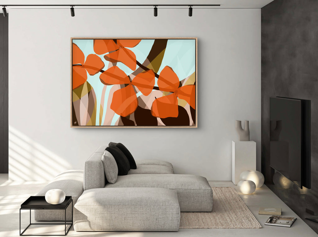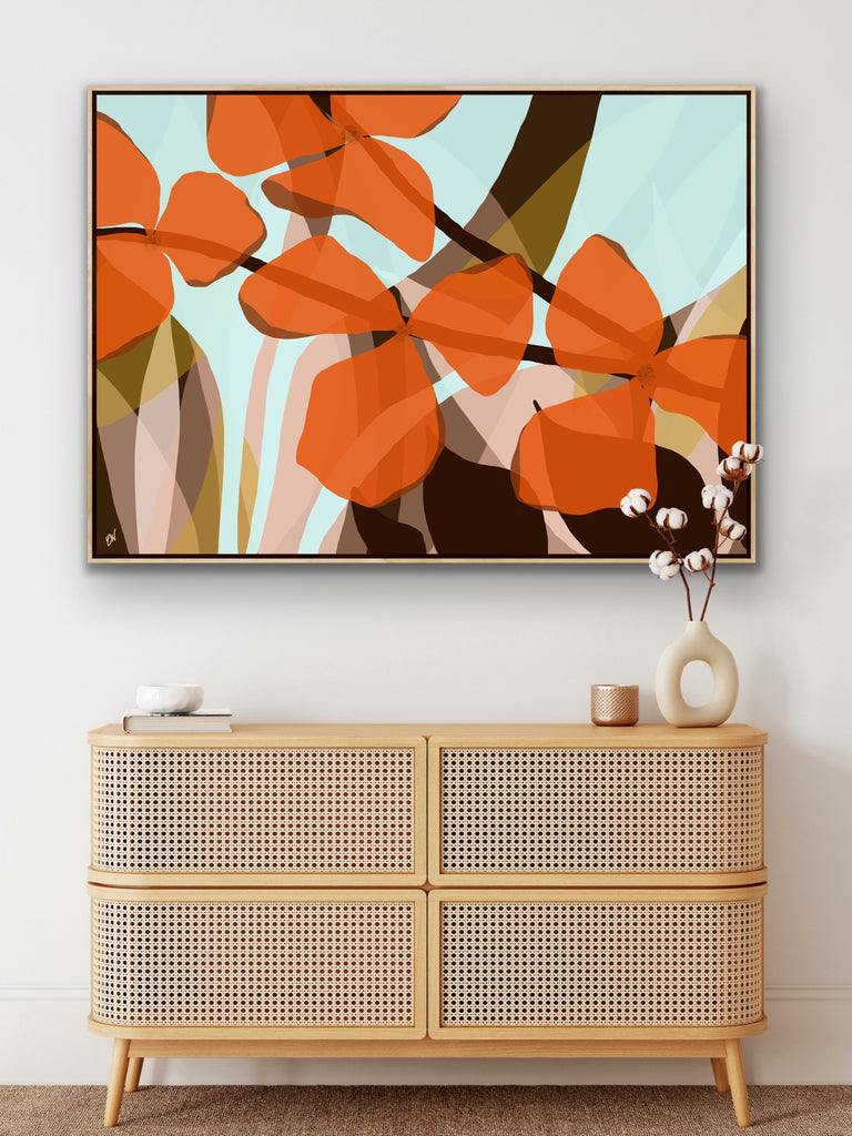 Float framed in premium 1cm wide x 5.5cm deep Tasmanian Oak, Matte White or Matte Black Frame, with a 5mm ‘shadow’ line between frame and canvas. Ready to hang.
