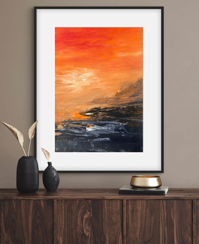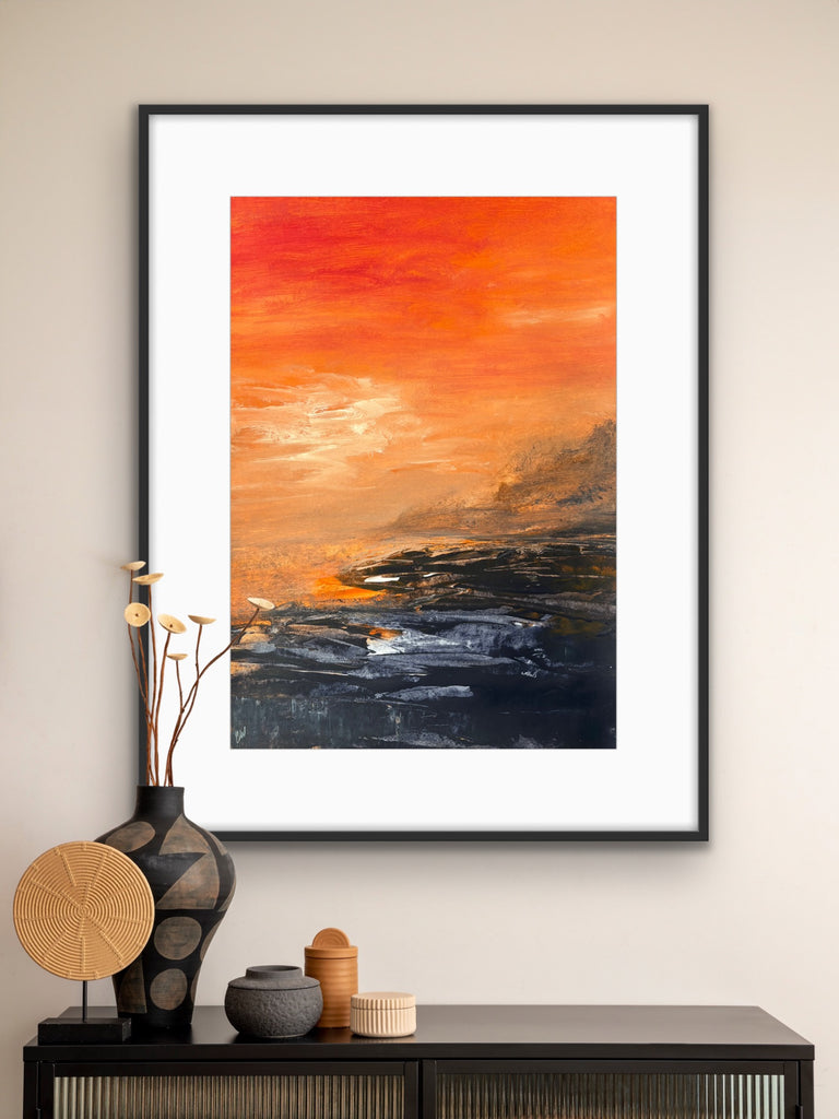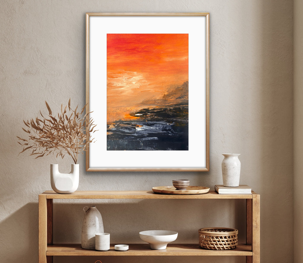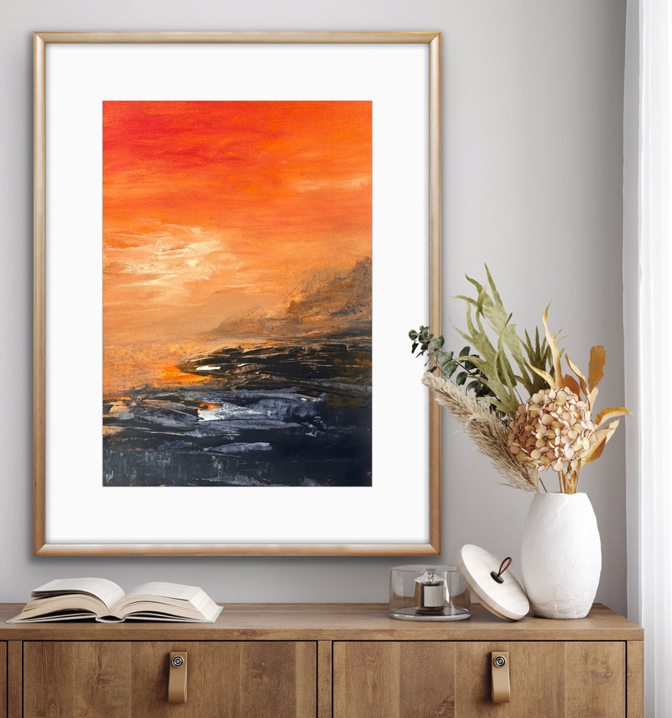 Beneath The Last Light is a beautiful abstract seascape painting. 59.4 x 42 cm (A2 size). Acrylic on paper. Frame not included. Requires framing. No returns on original artworks for change of mind so please choose carefully.