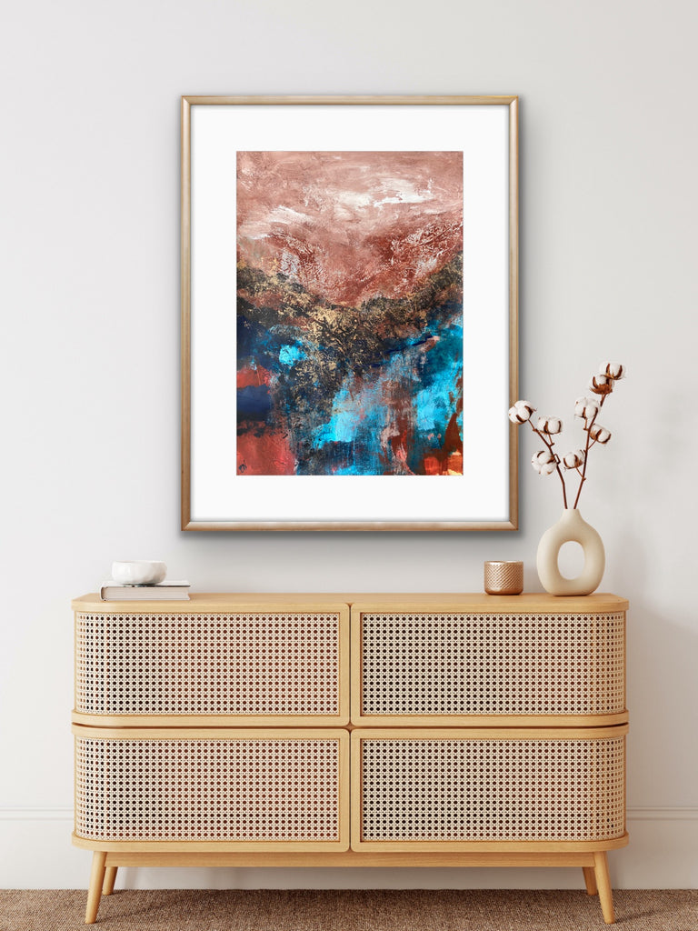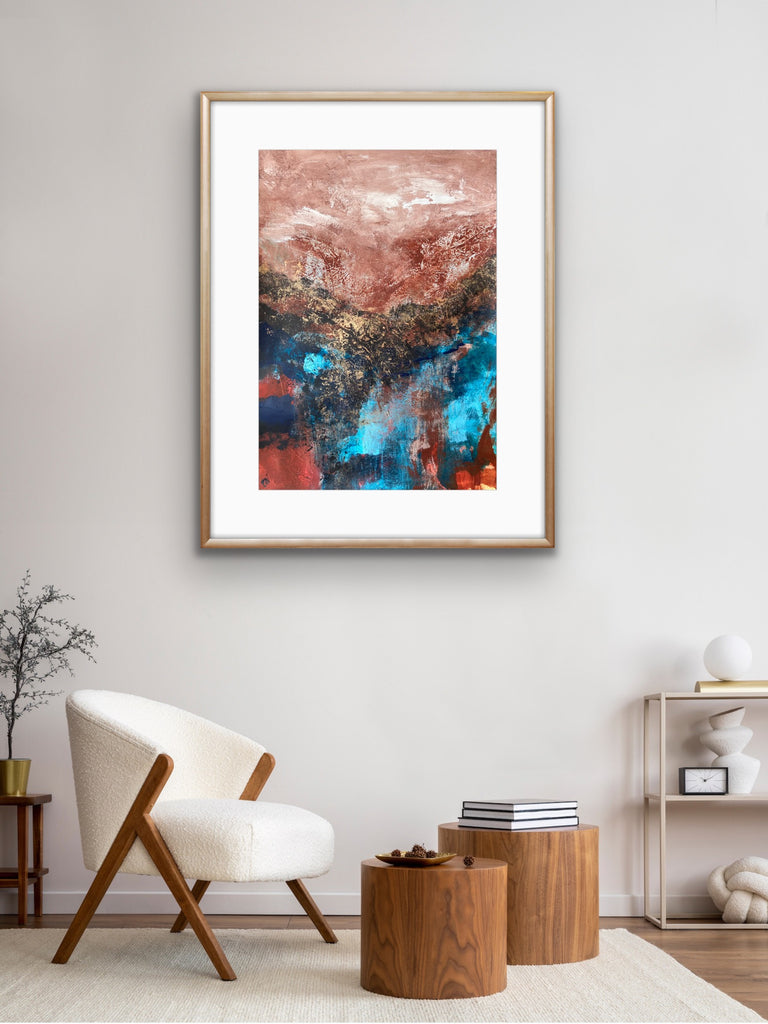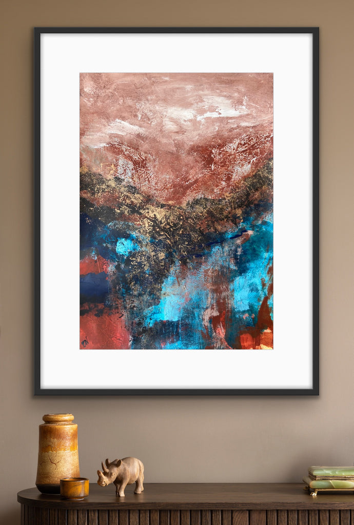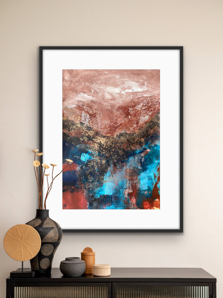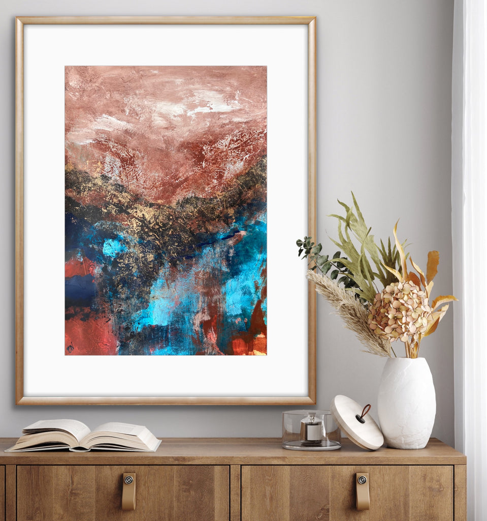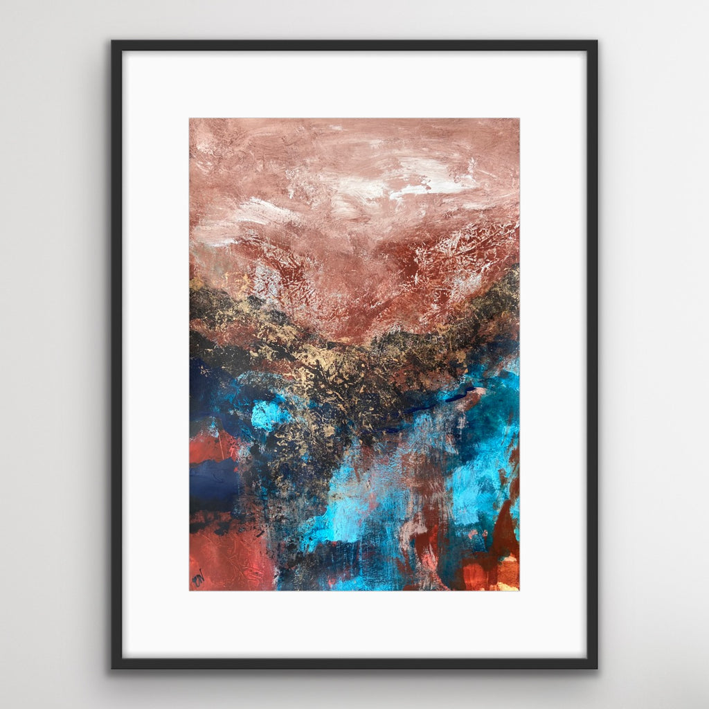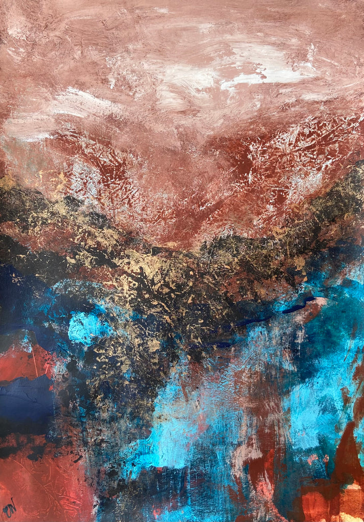 Beyond The Horizon is a beautiful abstract landscape with shimmering metallics. 59.4 x 42 cm (A2 size). Acrylic on paper. Frame not included . Requires framing. No returns on original artworks so please choose carefully.