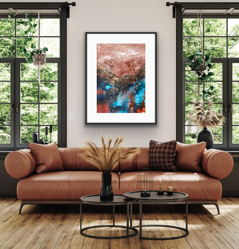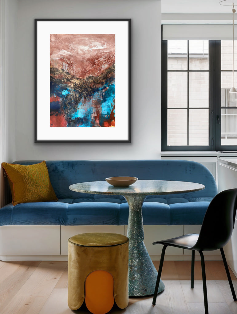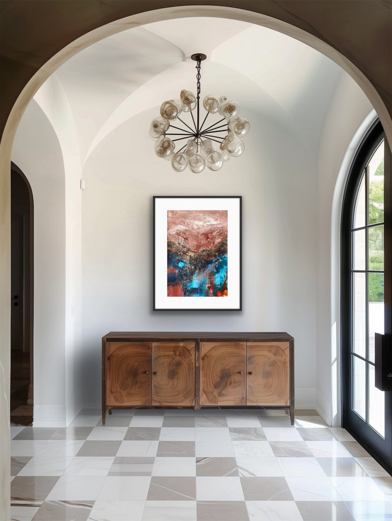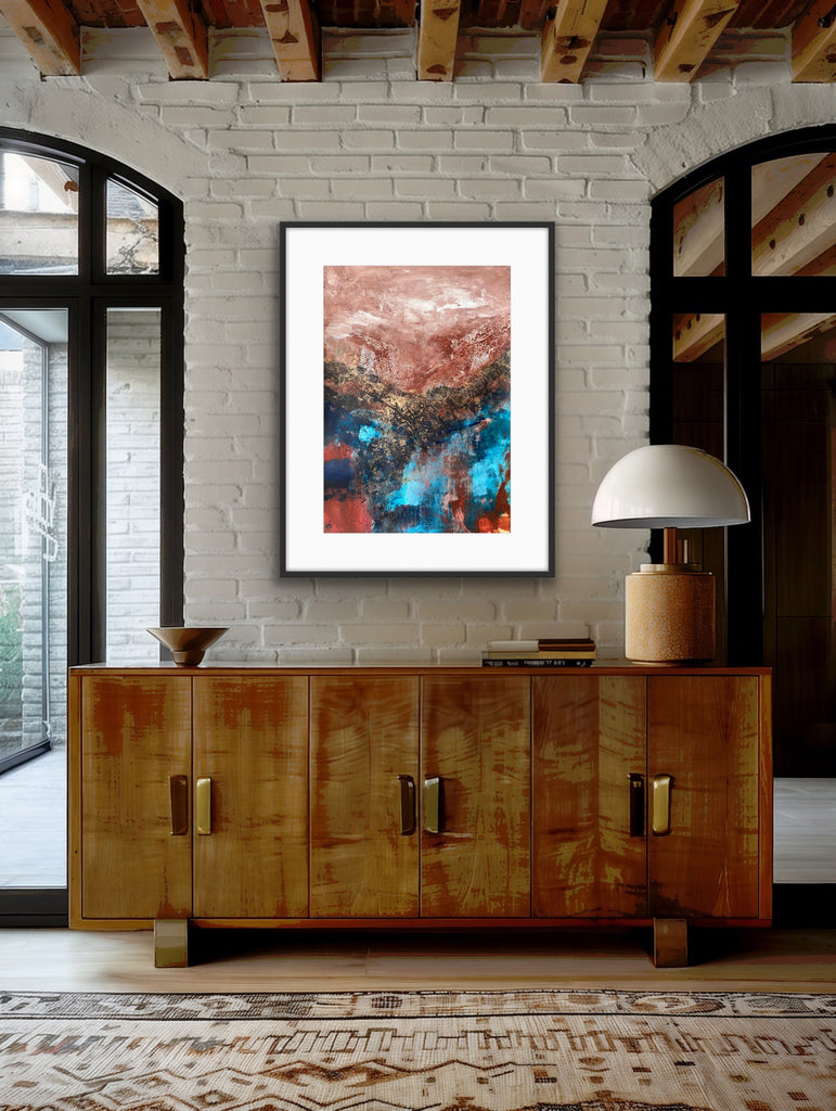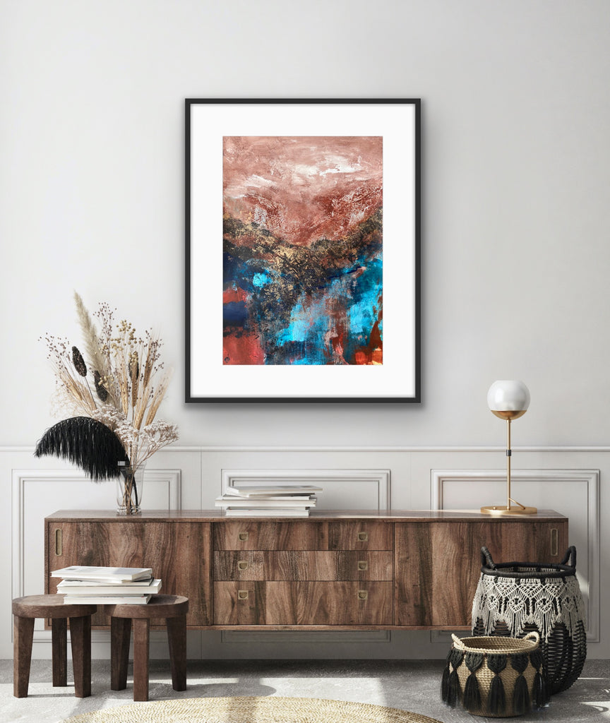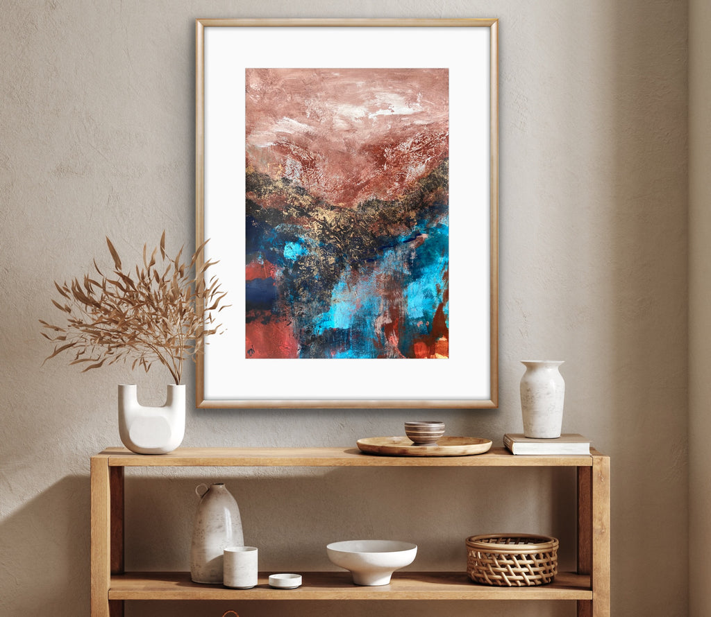Beyond The Horizon is a beautiful abstract landscape with shimmering metallics. 59.4 x 42 cm (A2 size). Acrylic on paper. Frame not included . Requires framing. No returns on original artworks so please choose carefully.