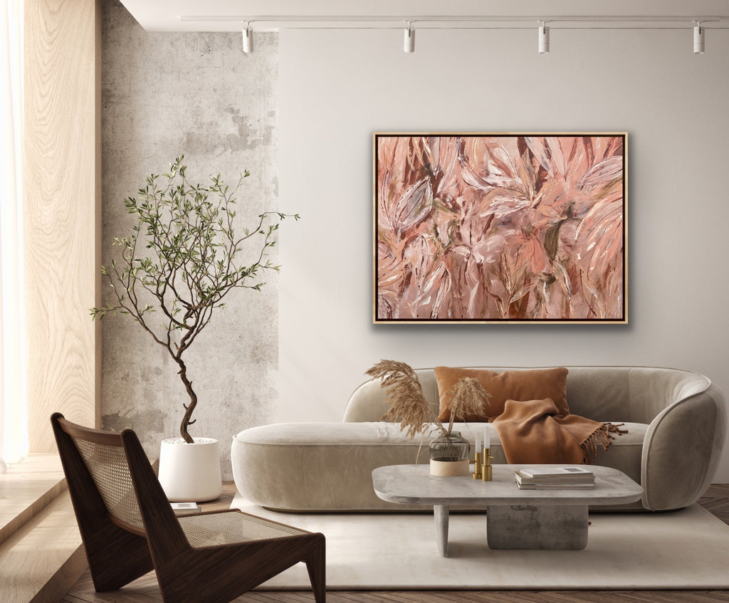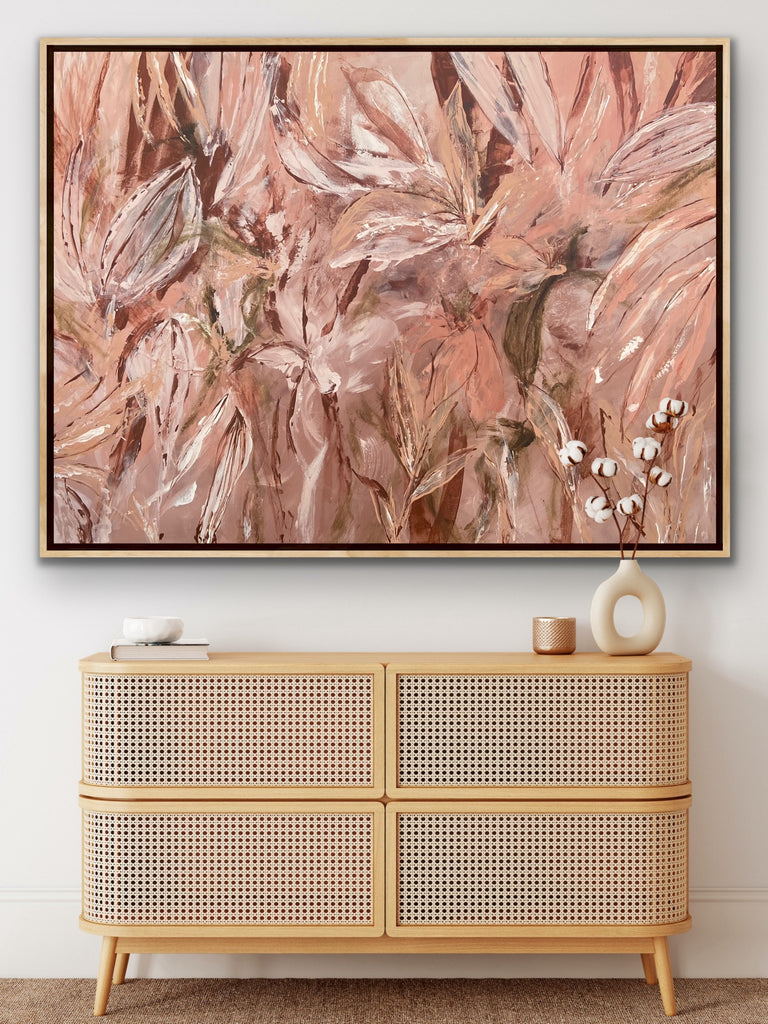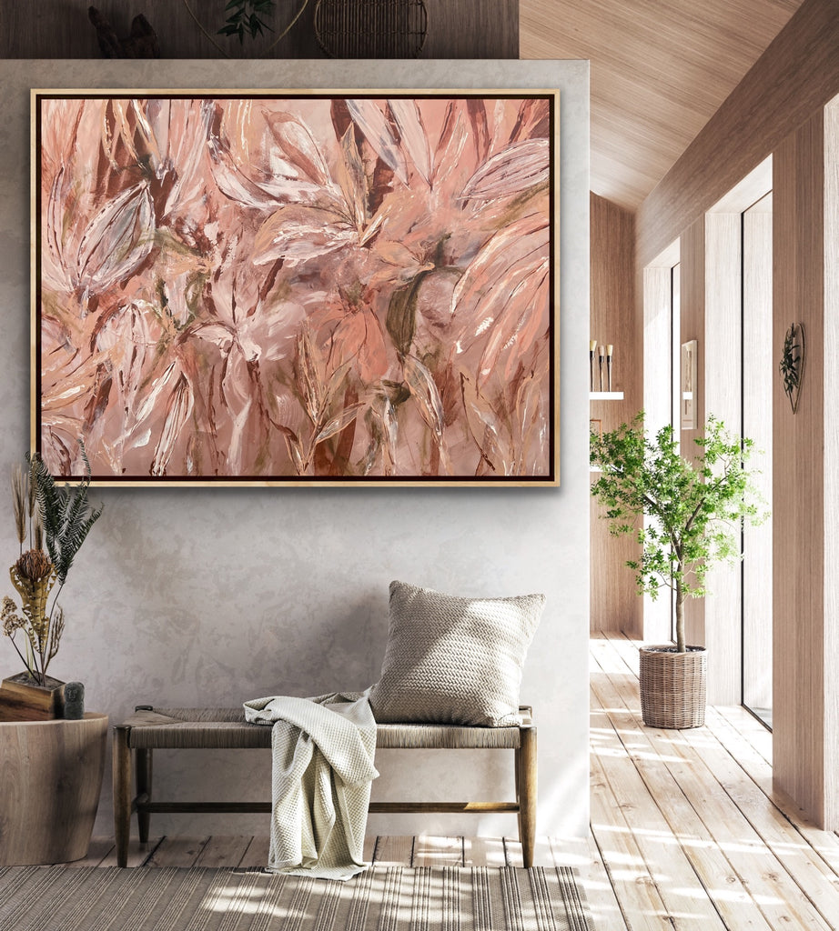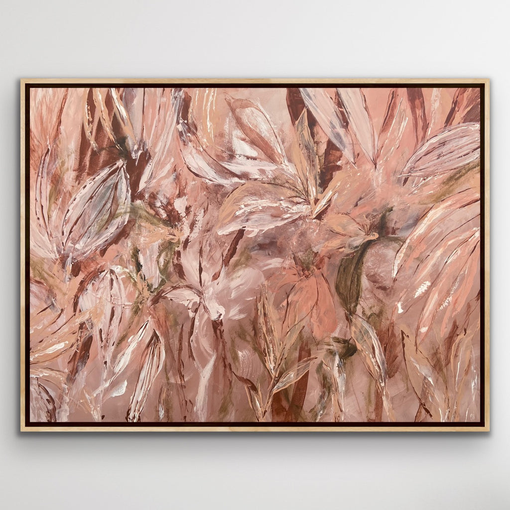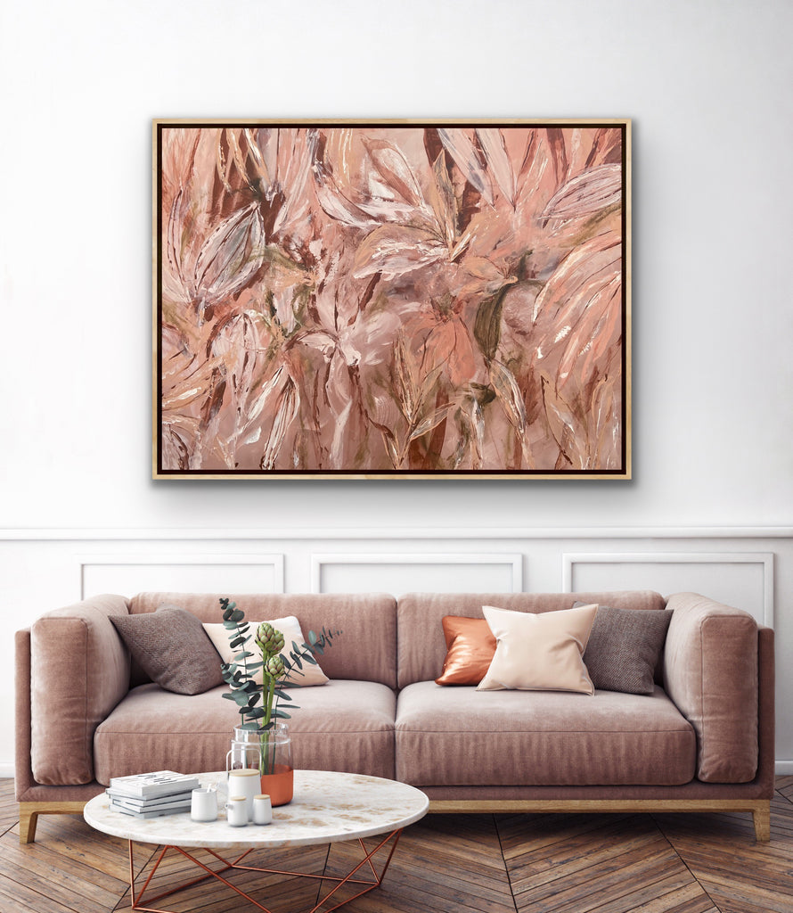 Blush Tropics is a beautiful abstract botanical painting. 121.9 x 91.4 x 2 cm. Acrylic on canvas, ready to hang. Frame not included. No returns on original artworks so please choose carefully.