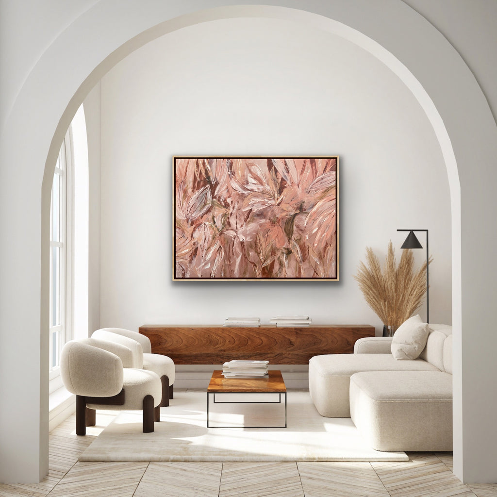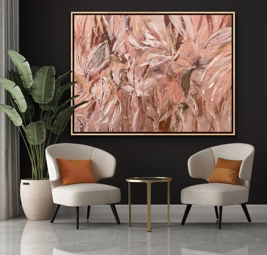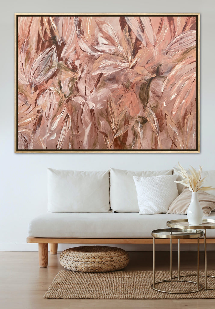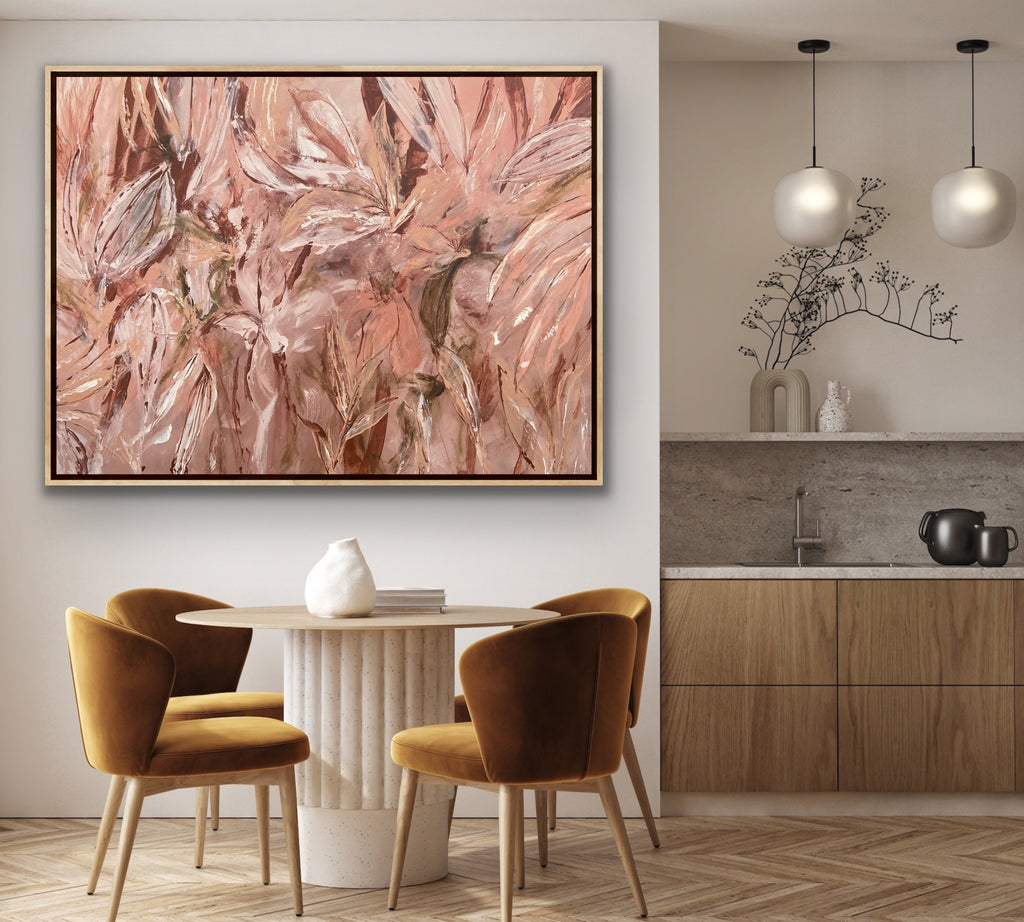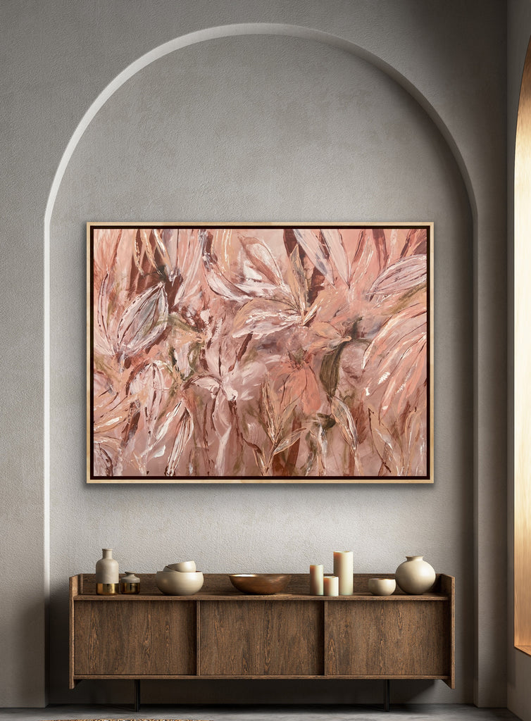 Blush Tropics is a beautiful abstract botanical painting. 121.9 x 91.4 x 2 cm. Acrylic on canvas, ready to hang. Frame not included. No returns on original artworks so please choose carefully.