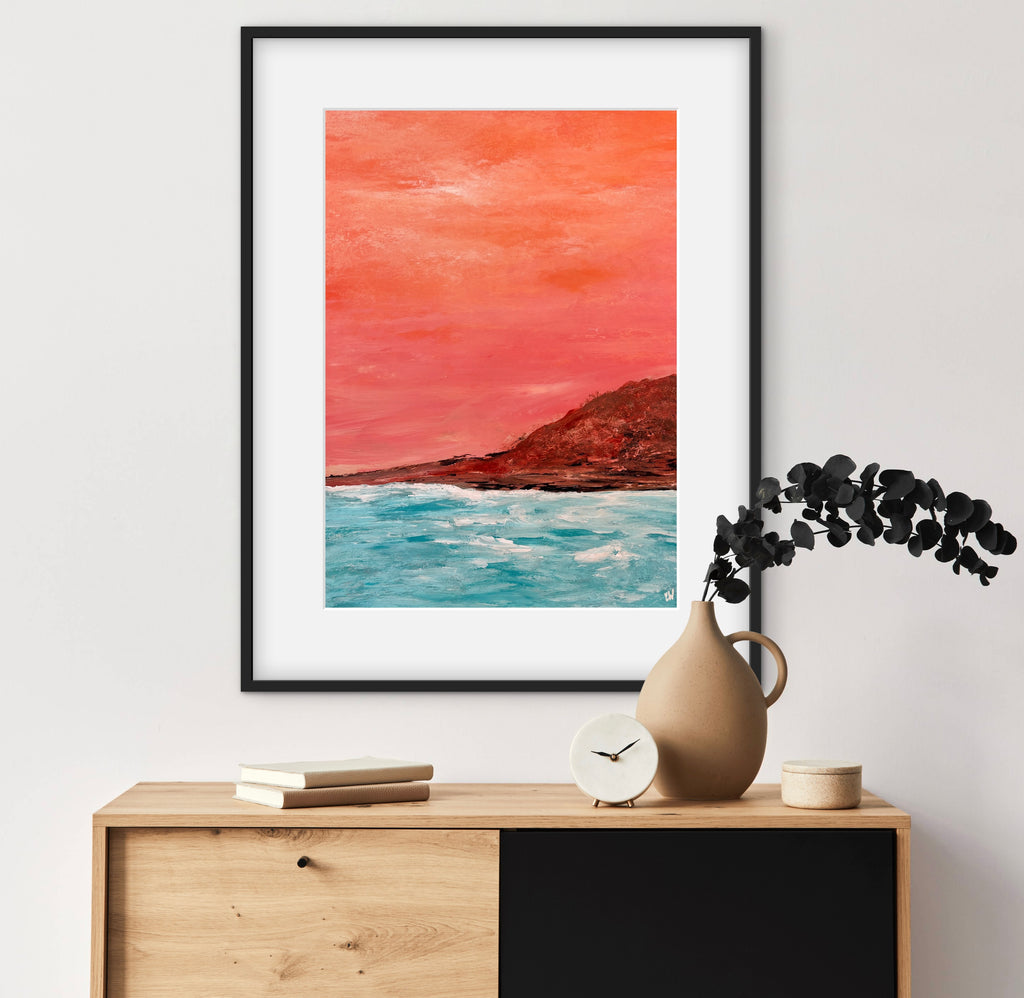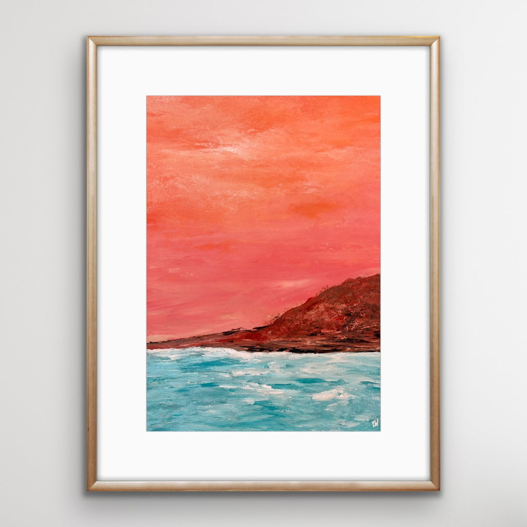 Coast At Sunset is a beautiful abstract seascape painting. 59.4 x 42 cm (A2 size). Acrylic on paper. Frame not included. Requires framing. No returns on original artworks for change of mind so please choose carefully.