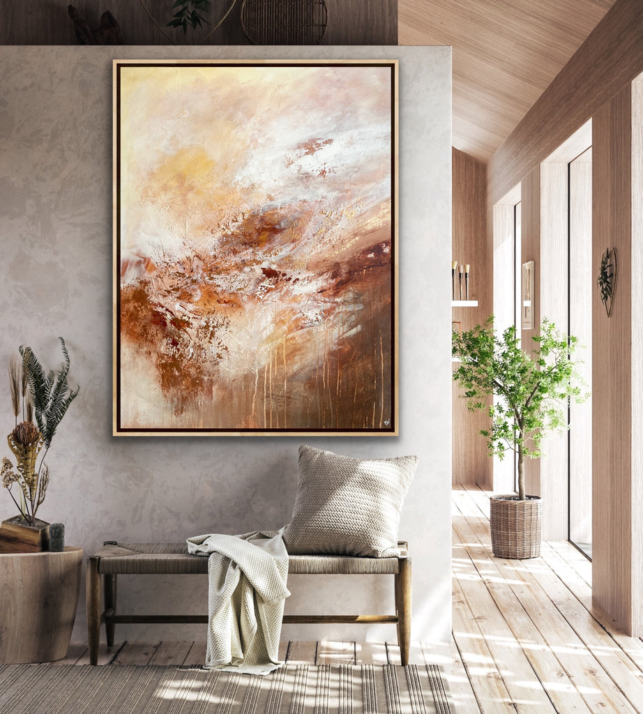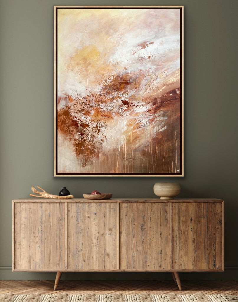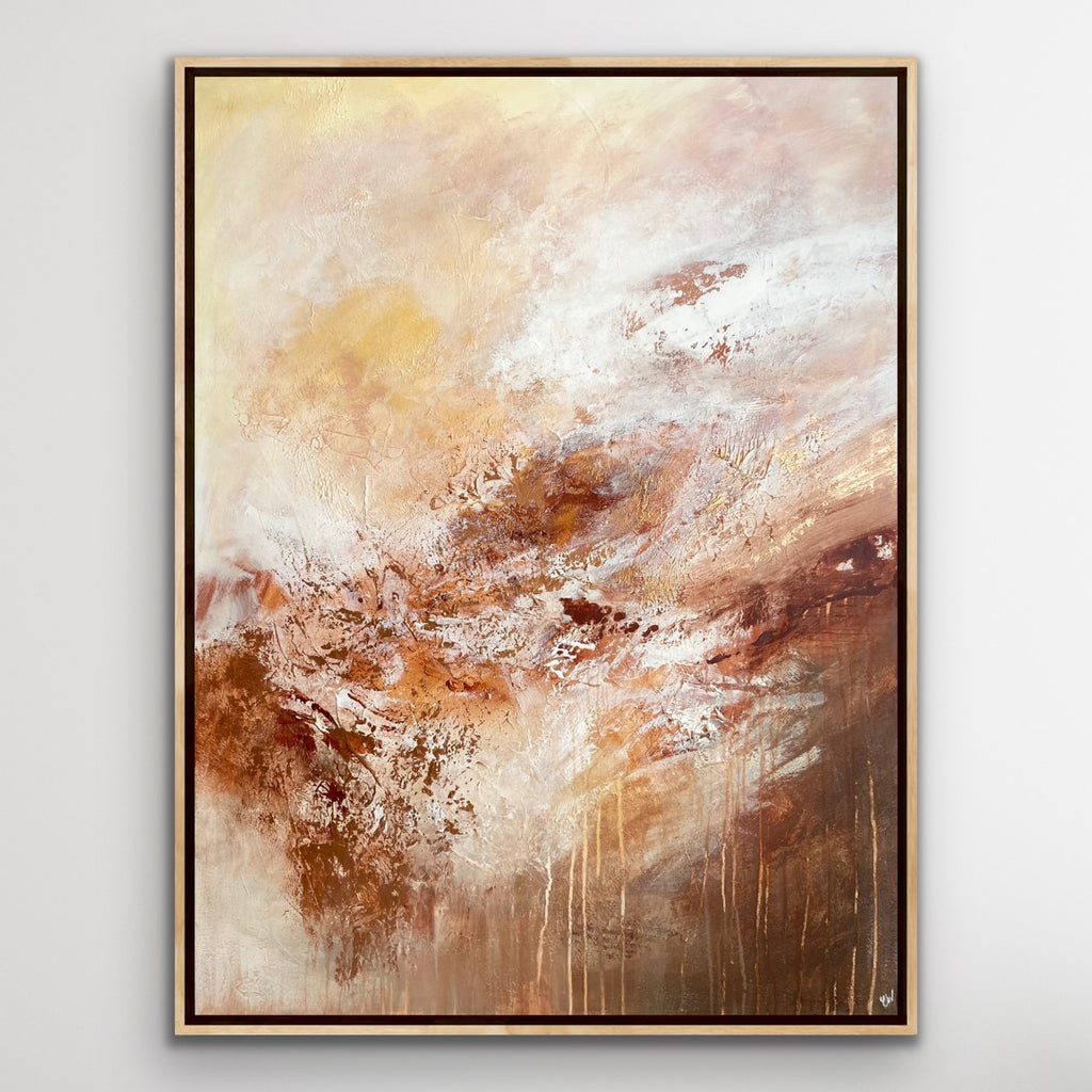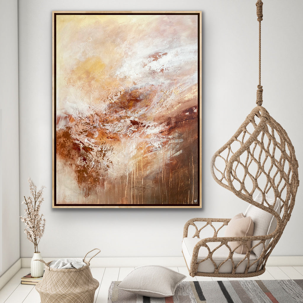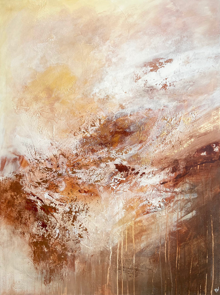 Golden Days is a beautifully textured abstract landscape painting that has shimmering metallic accents. 121.9 x 91.4 x 2 cm. Acrylic on canvas, ready to hang. Frame not included. No returns on original artworks so please choose carefully.