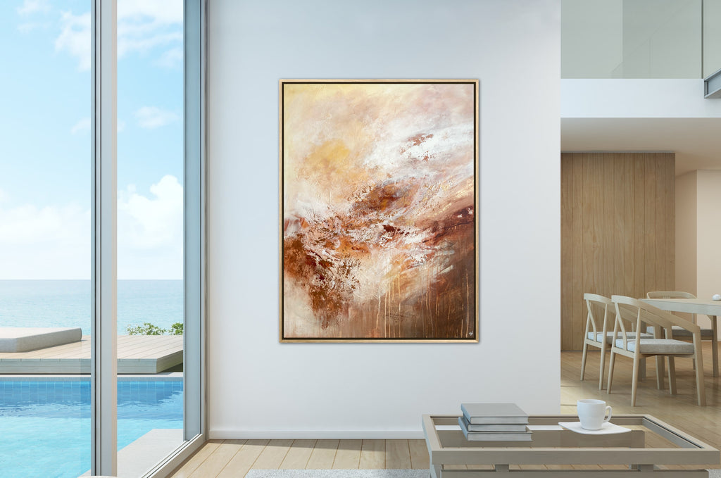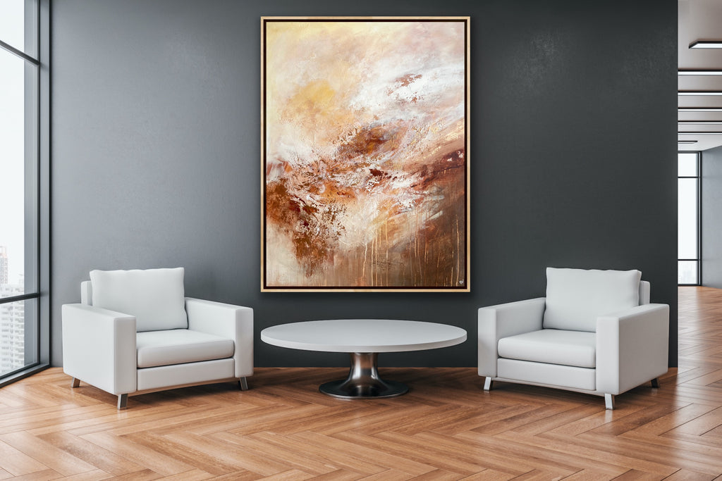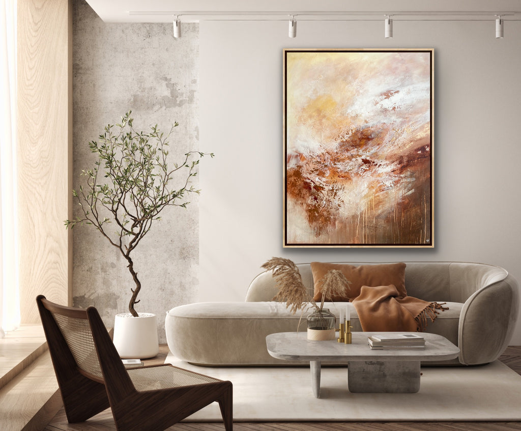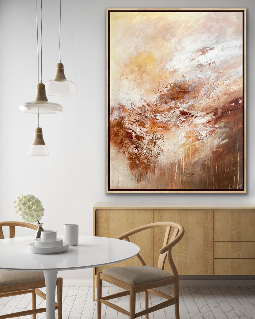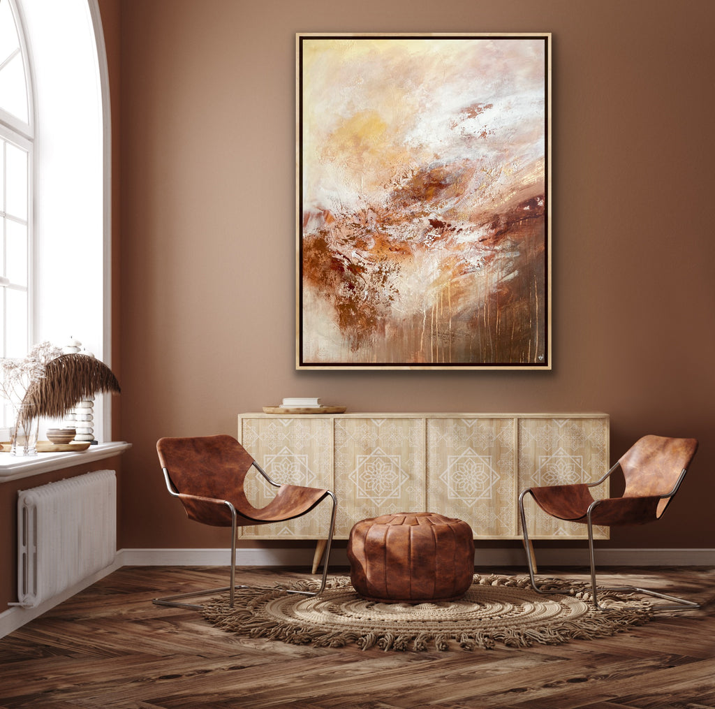 Golden Days is a beautifully textured abstract landscape painting that has shimmering metallic accents. 121.9 x 91.4 x 2 cm. Acrylic on canvas, ready to hang. Frame not included. No returns on original artworks so please choose carefully.