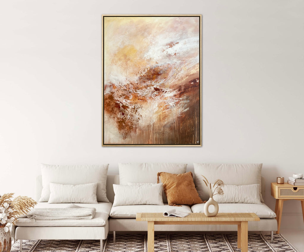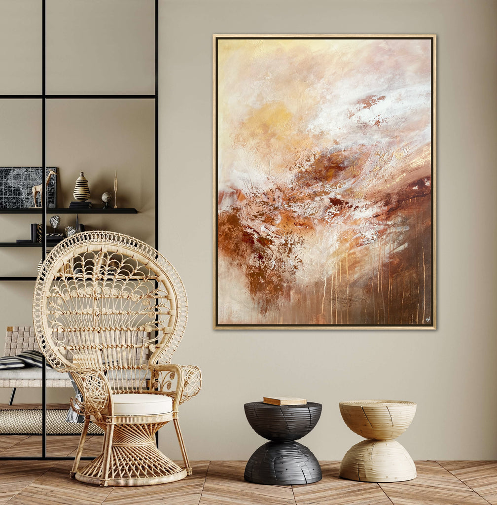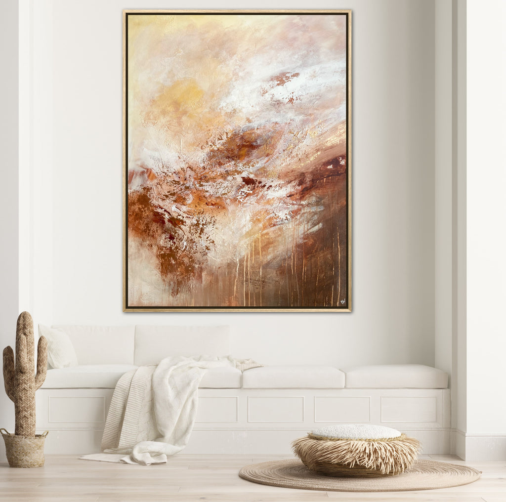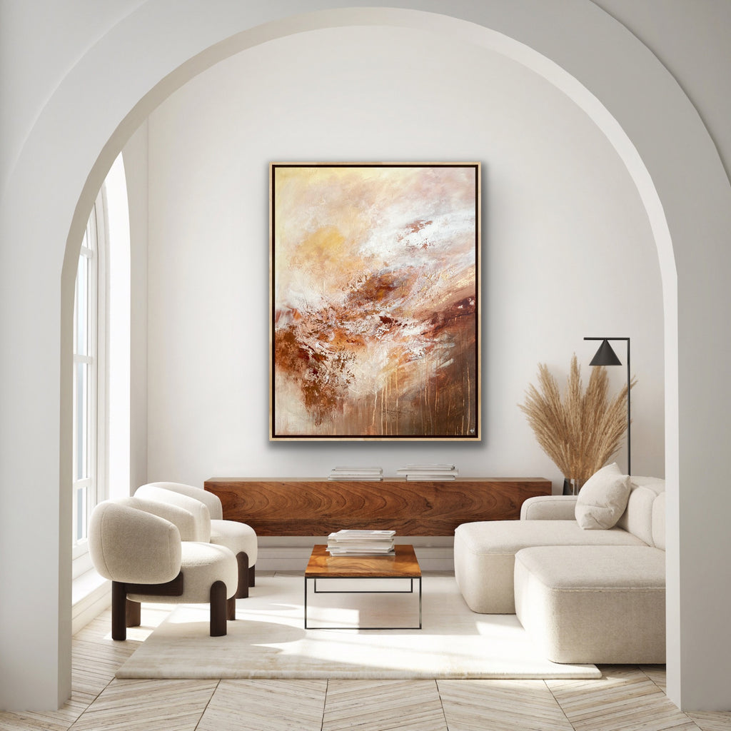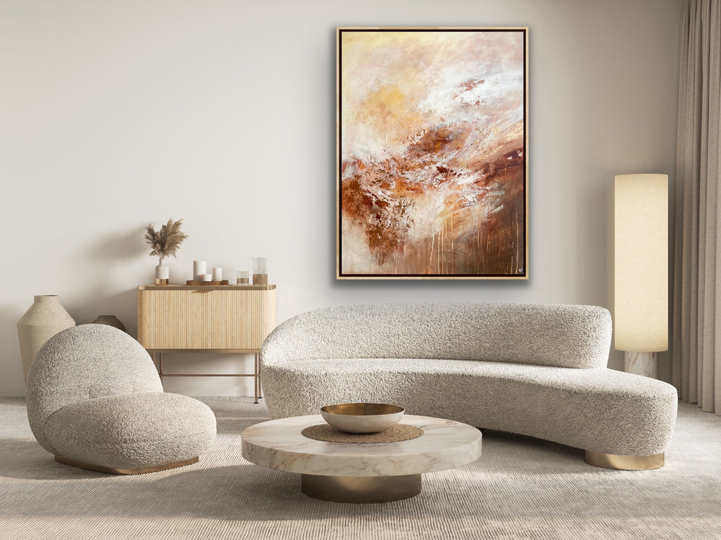 Golden Days is a beautifully textured abstract landscape painting that has shimmering metallic accents. 121.9 x 91.4 x 2 cm. Acrylic on canvas, ready to hang. Frame not included. No returns on original artworks so please choose carefully.