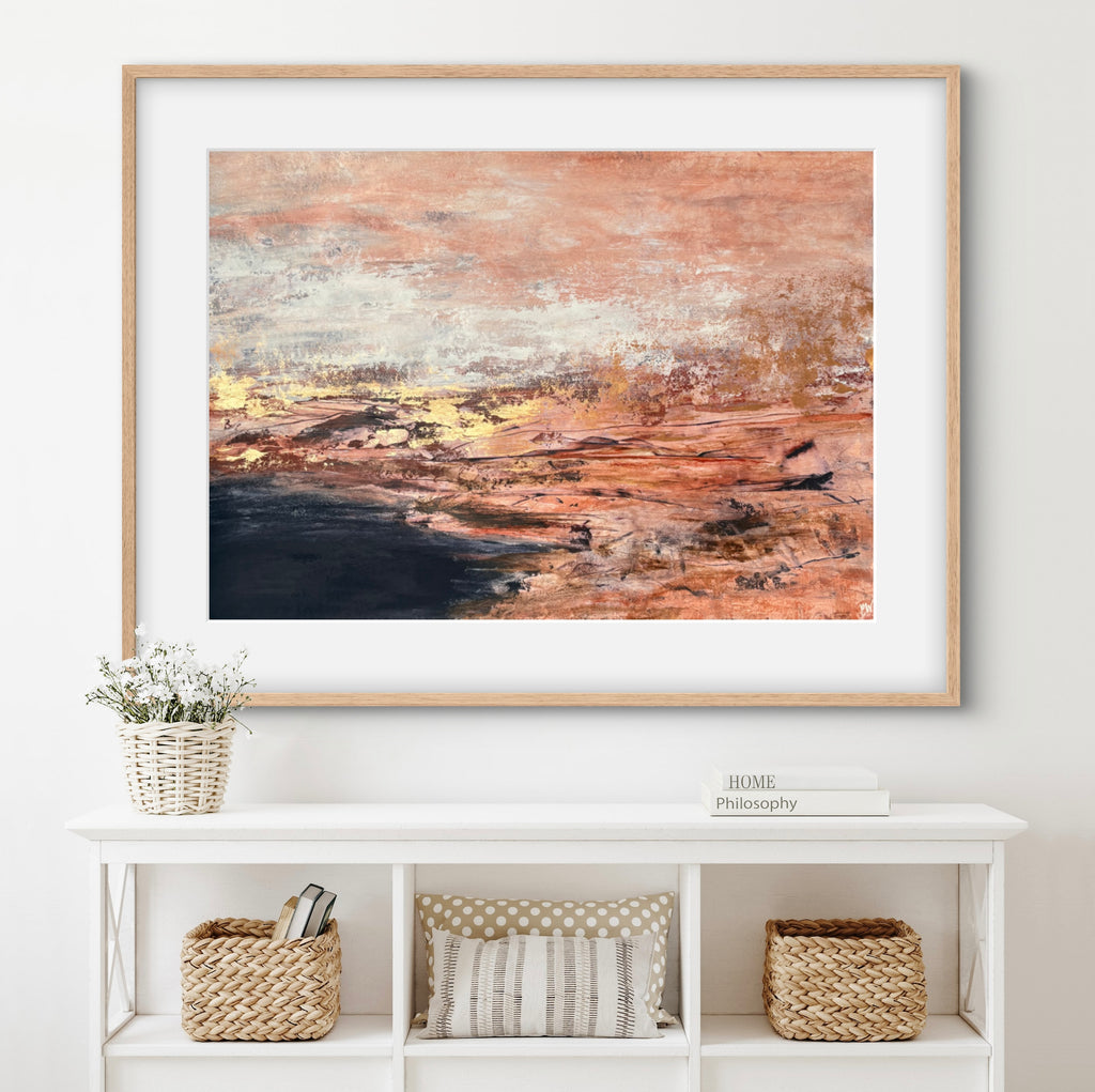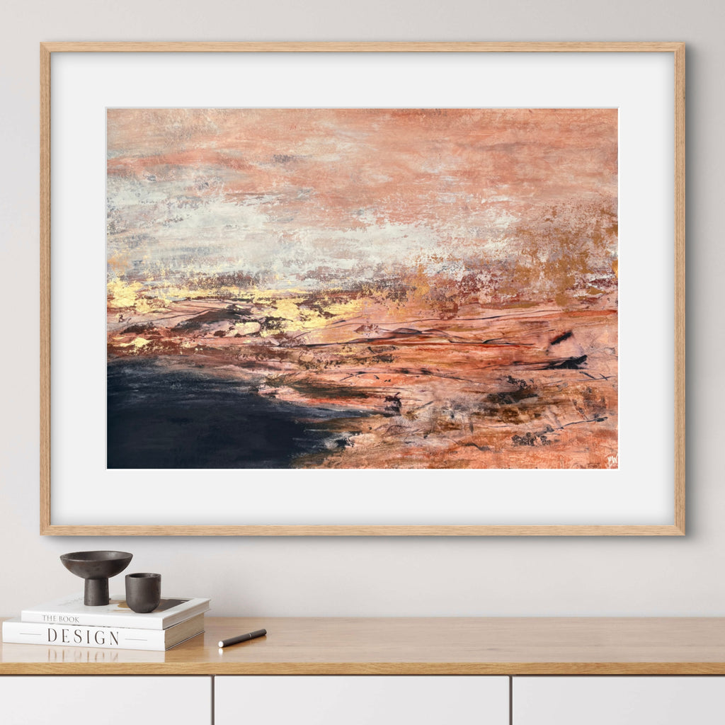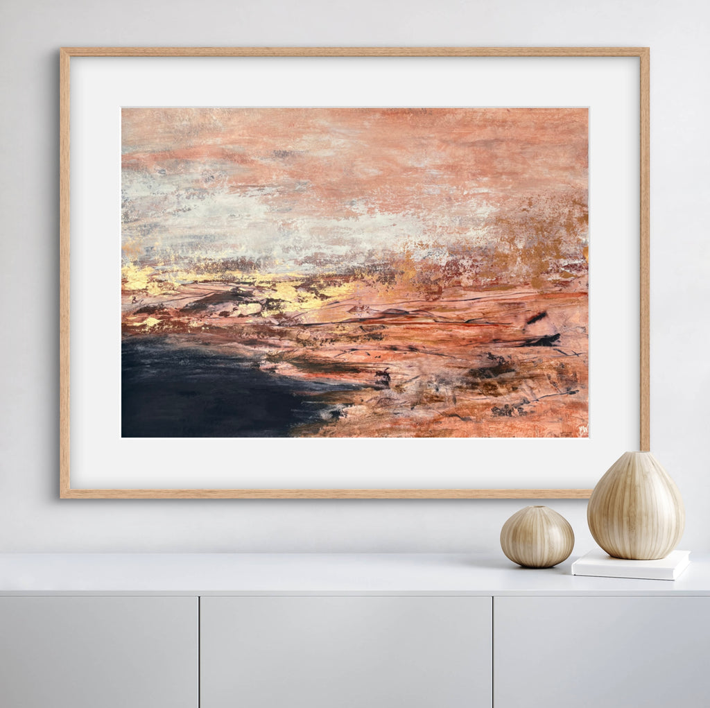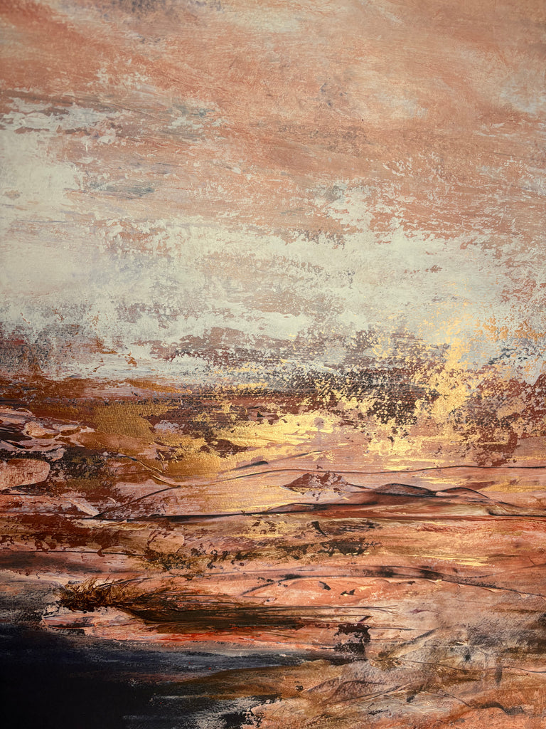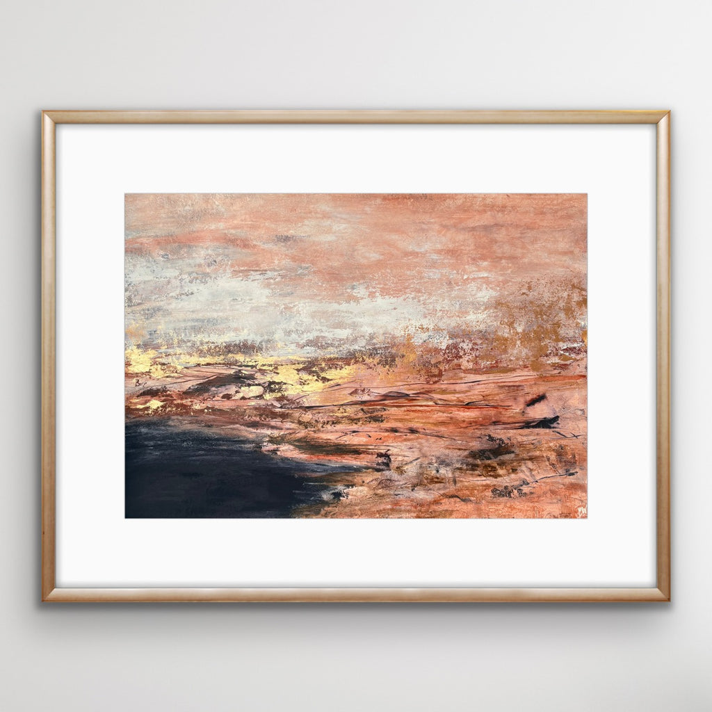 Golden Dusk is a beautiful abstract landscape/seascape with shimmering gold details. 59.4 x 84.1 cm (A1 size). Acrylic on paper. Frame not included. Requires framing. No returns on original artworks for change of mind so please choose carefully.