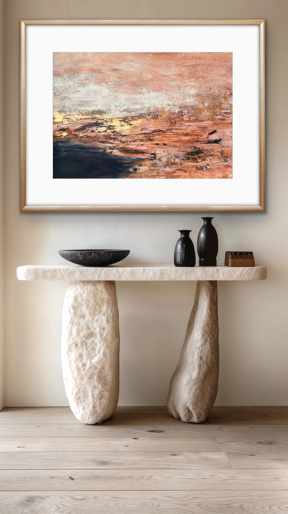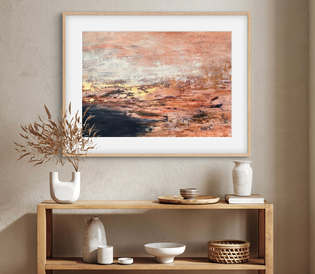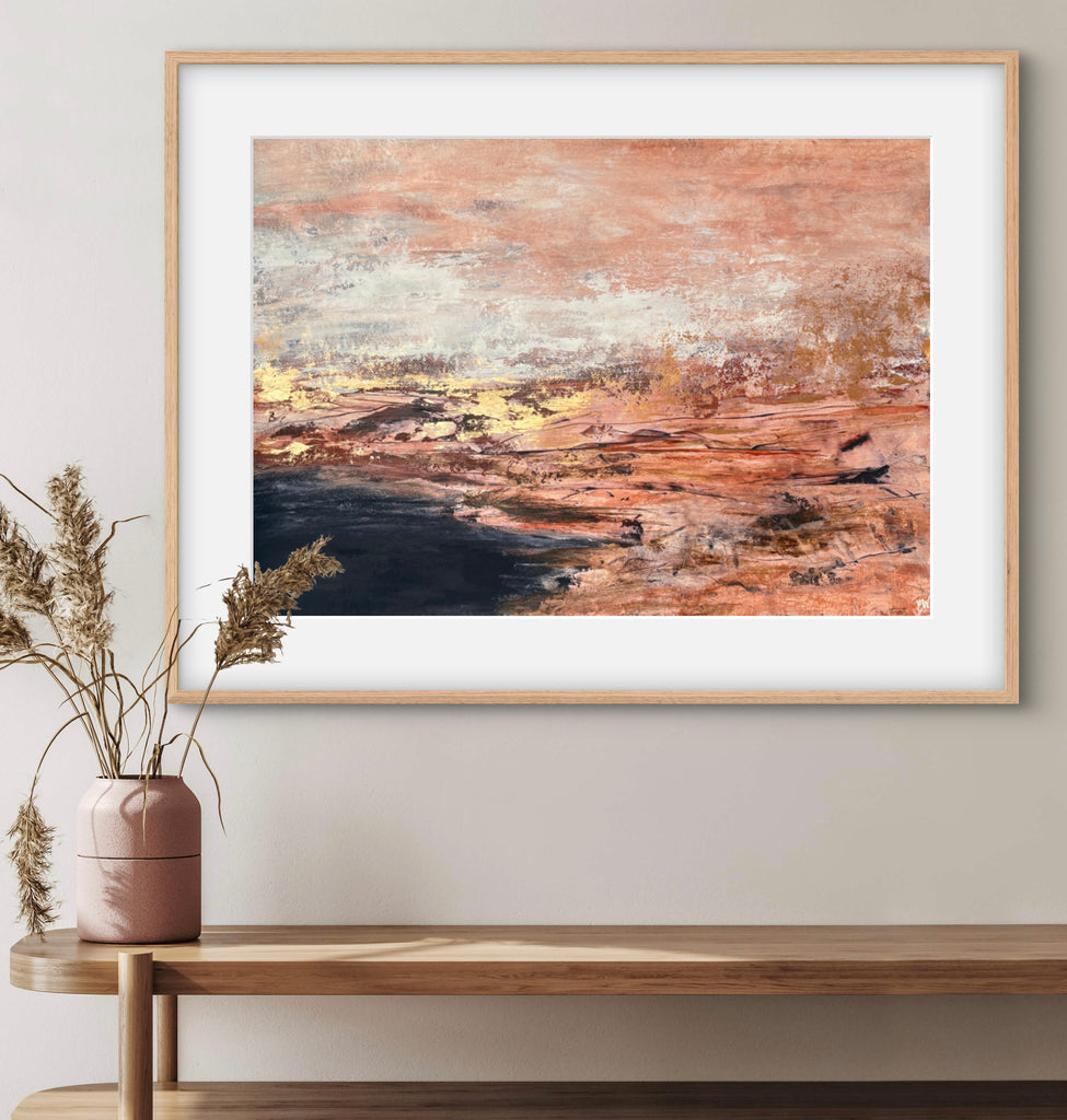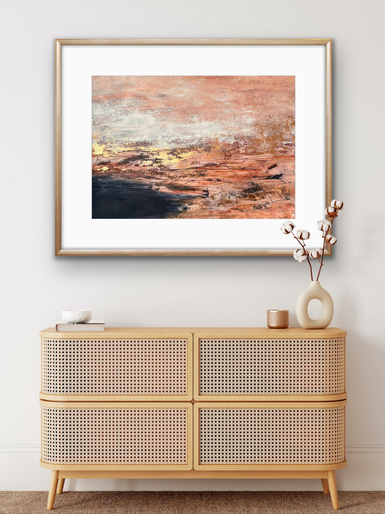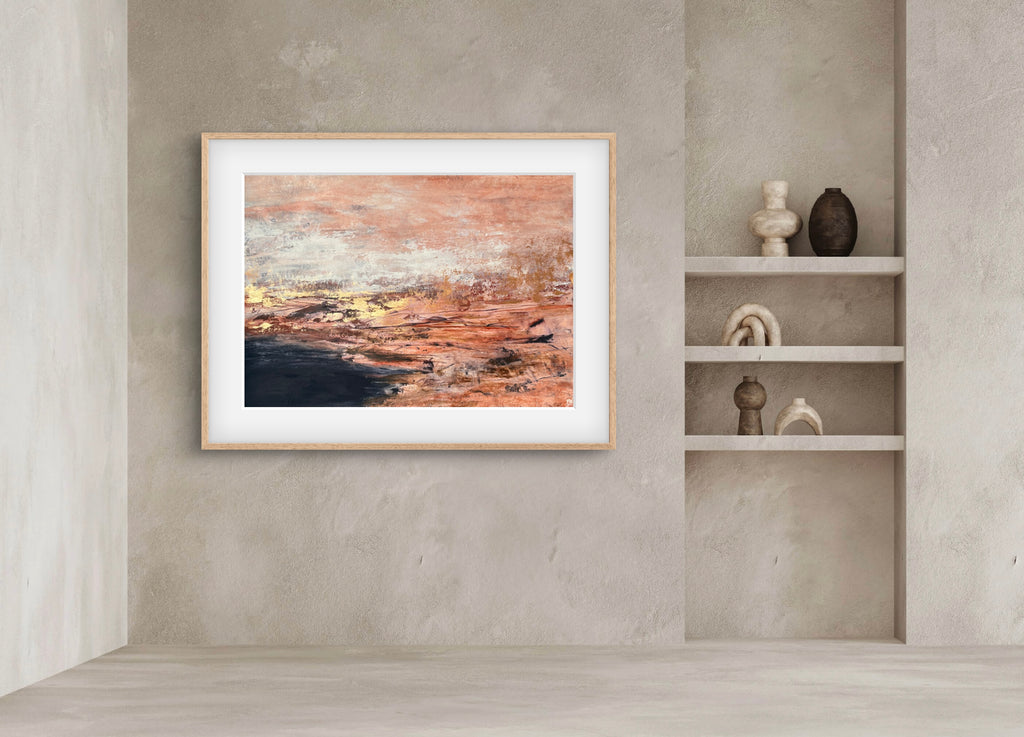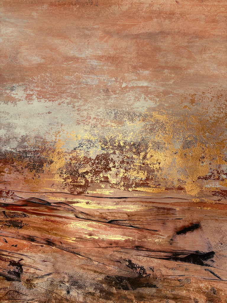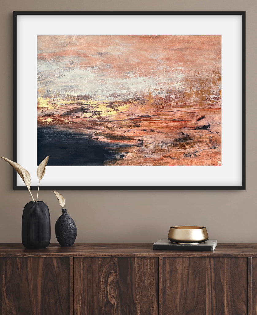 Golden Dusk is a beautiful abstract landscape/seascape with shimmering gold details. 59.4 x 84.1 cm (A1 size). Acrylic on paper. Frame not included. Requires framing. No returns on original artworks for change of mind so please choose carefully.