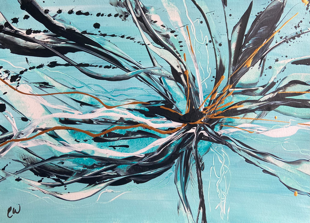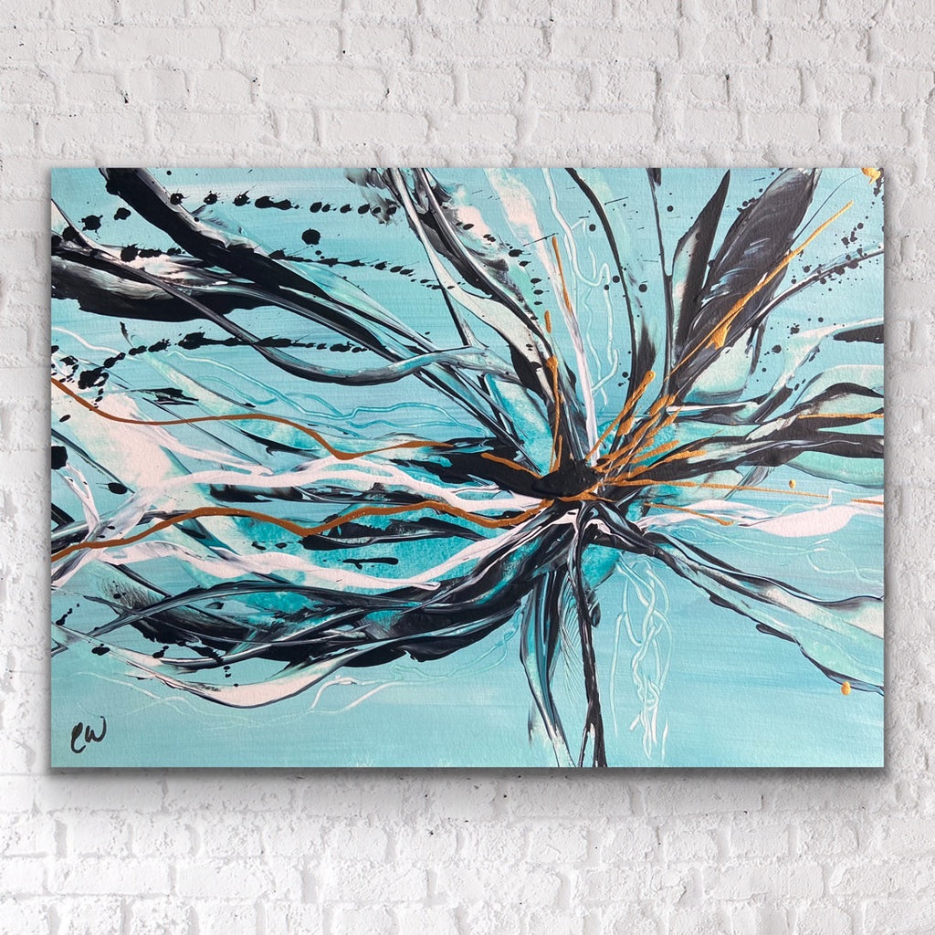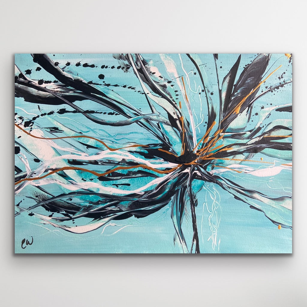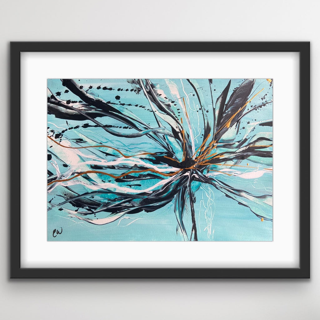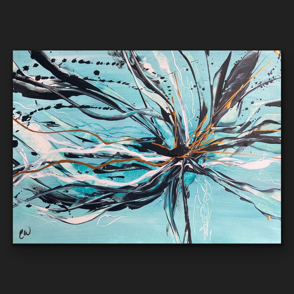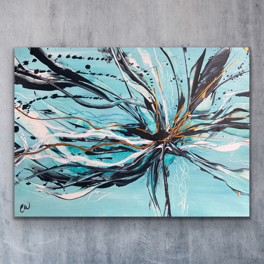 Luminous is a beautiful and peaceful abstract that has a gorgeous colour palette of aqua, black, white and gold. 29.7 x 42 cm (A3 size) Acrylic on paper. Requires framing. (One image shows what this piece looks like framed. Frame not included) Watch how this painting was made on my YouTube channel! Link to my YouTube is on the home page. No returns on original artworks so please choose carefully.