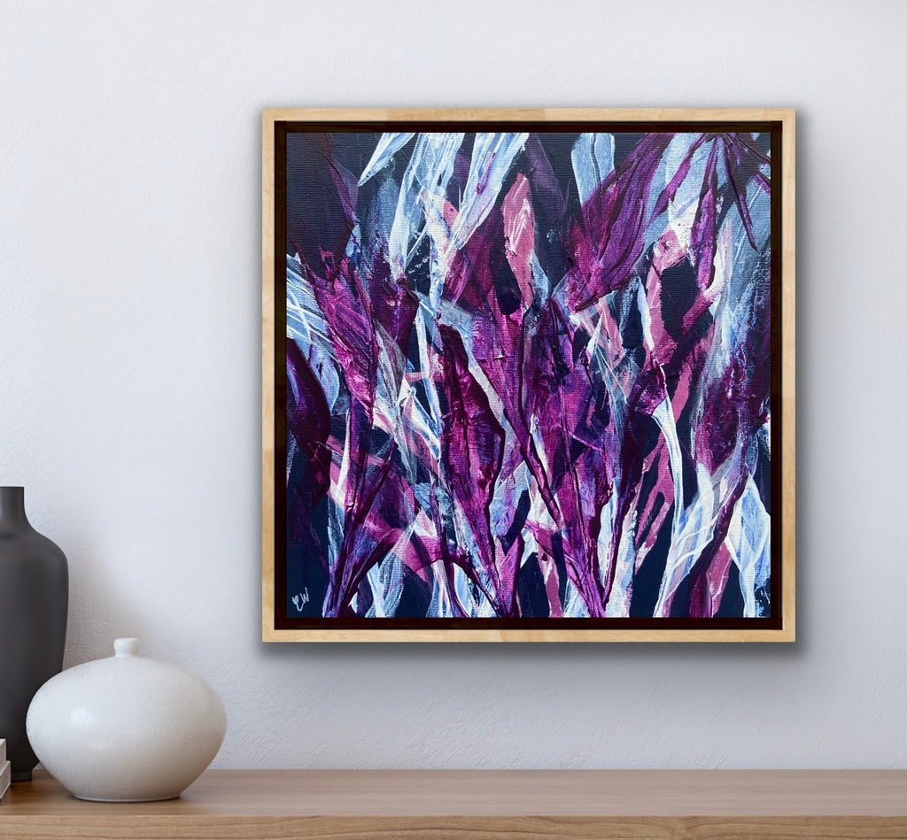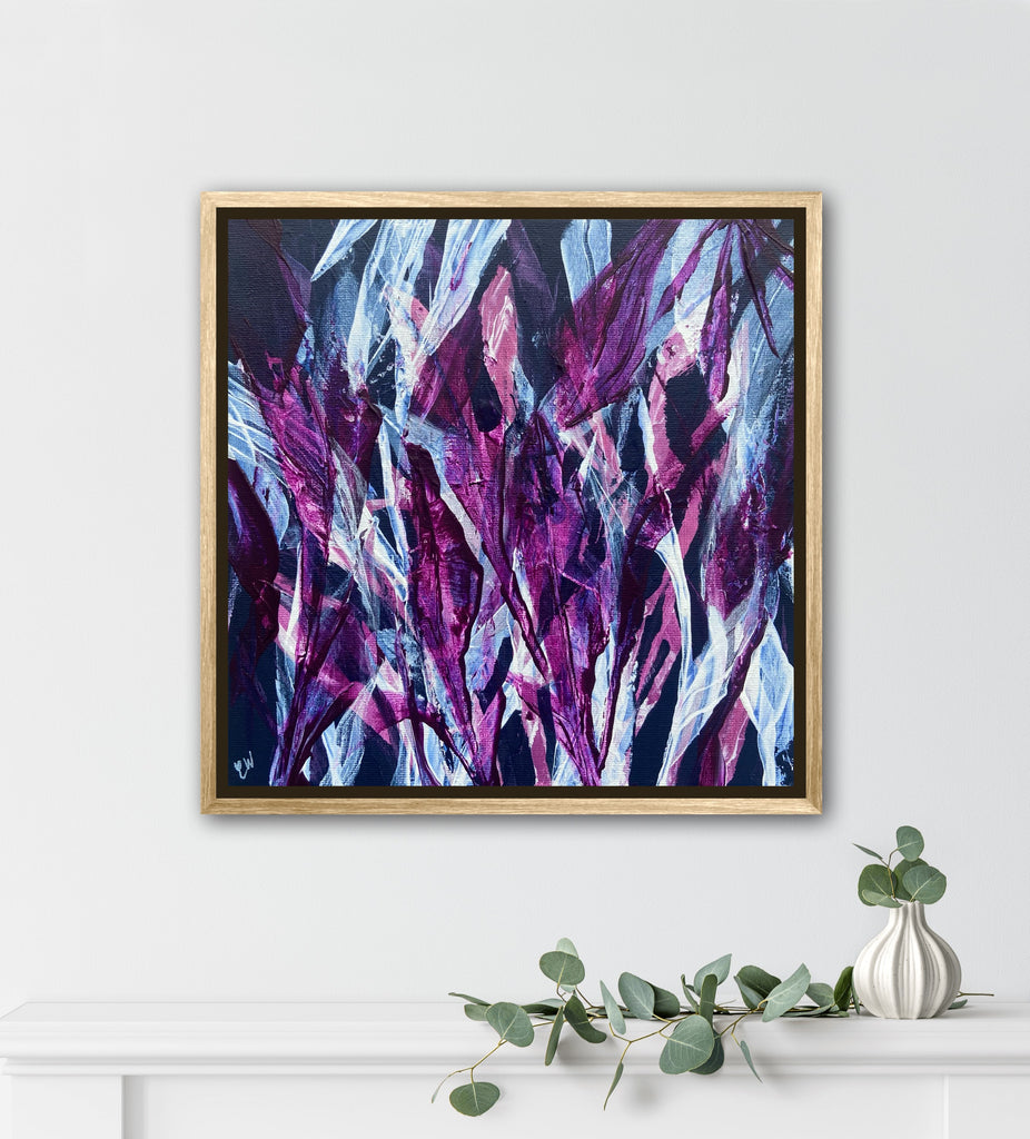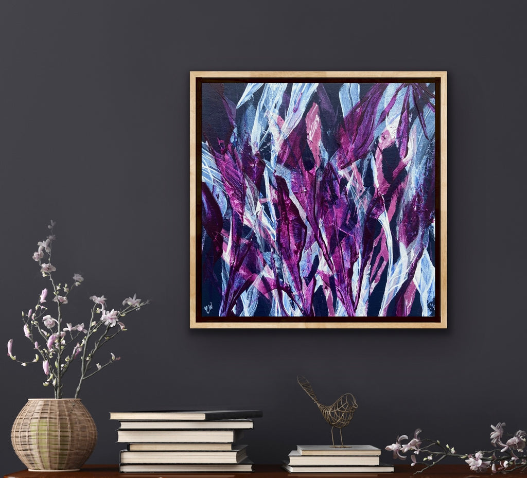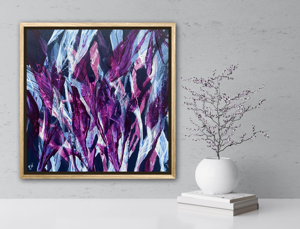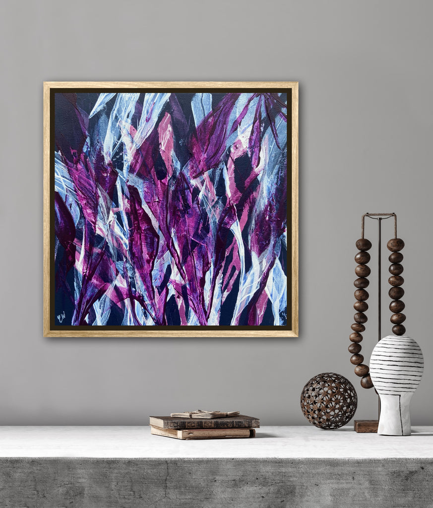 Midnight Tropics is a beautiful abstract botanical piece.  25 x 25 cm. Acrylic on canvas, ready to hang. Frame not included. No returns on original artworks so please choose carefully.