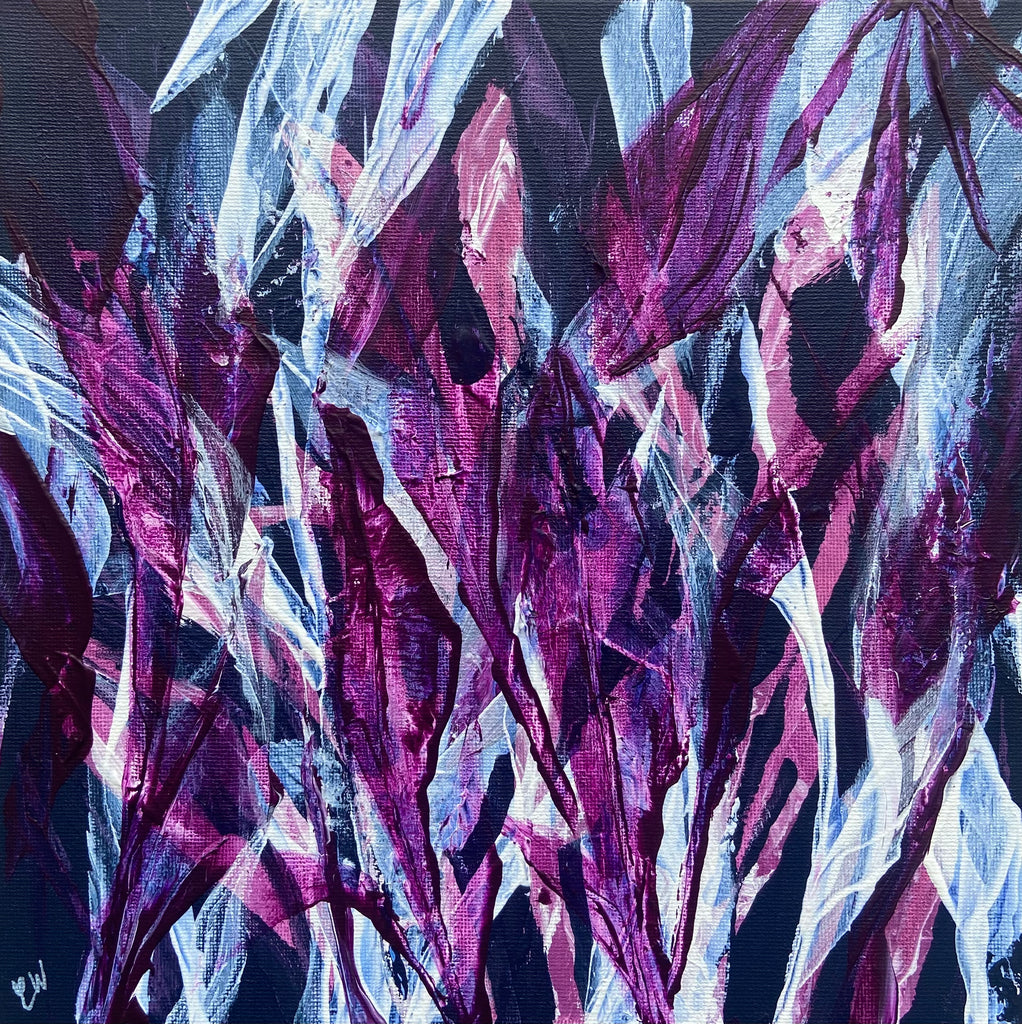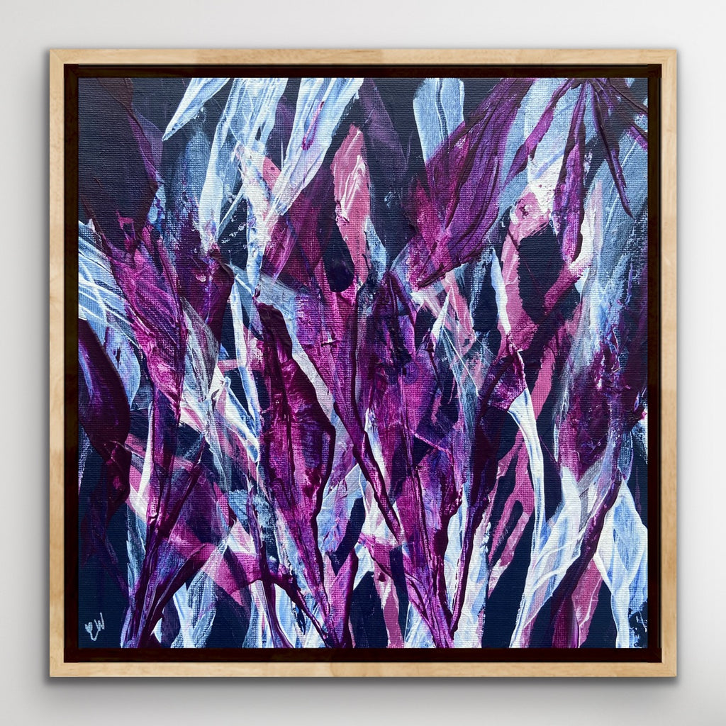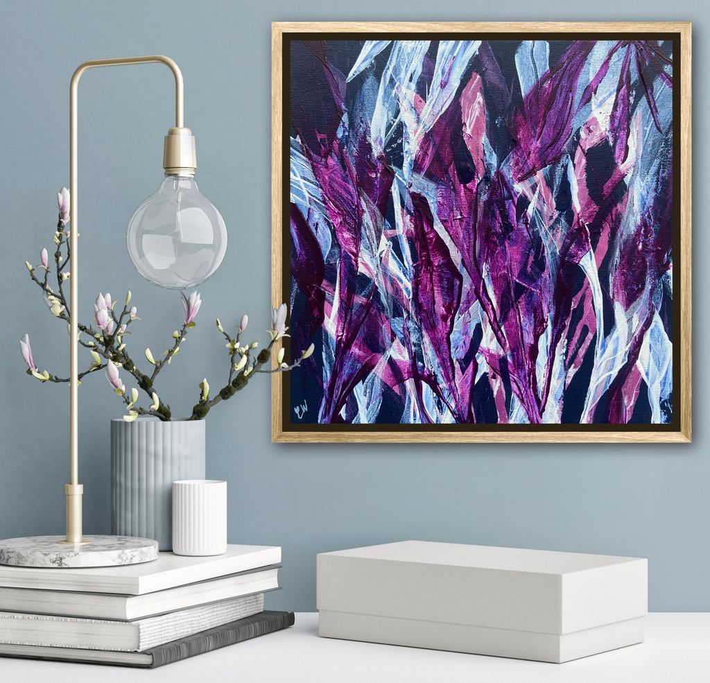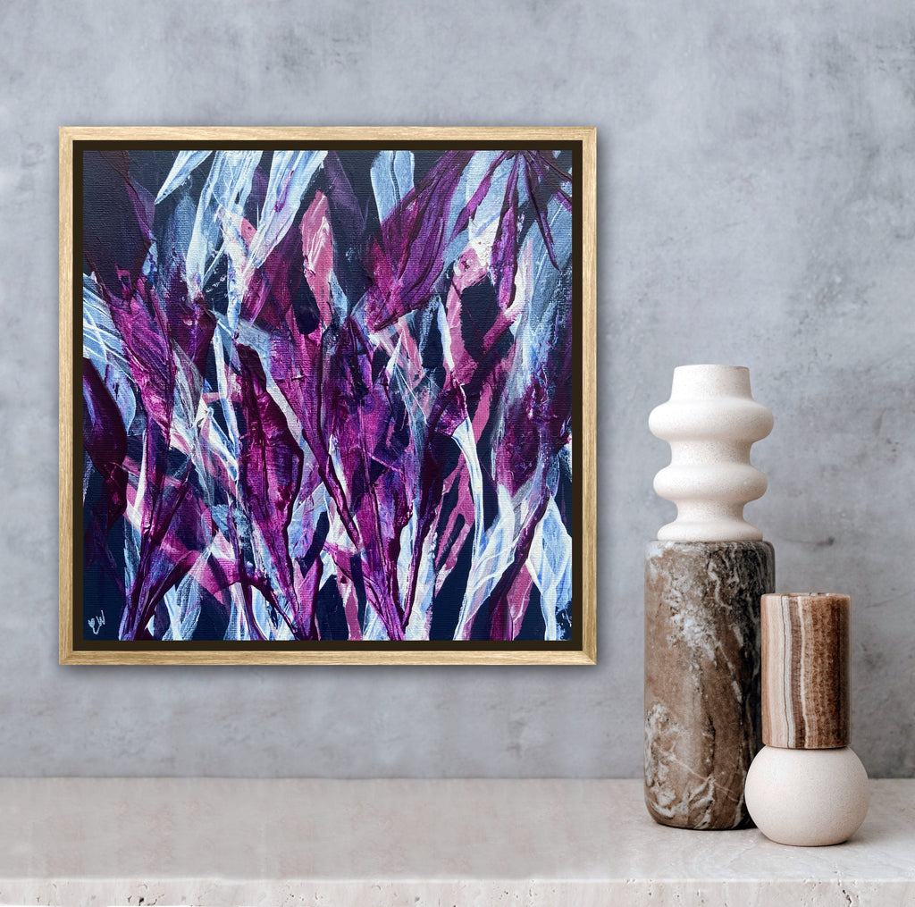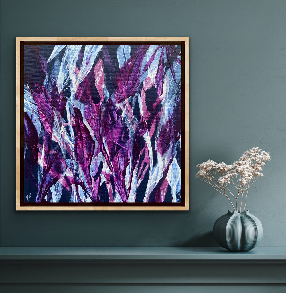 Midnight Tropics is a beautiful abstract botanical piece.  25 x 25 cm. Acrylic on canvas, ready to hang. Frame not included. No returns on original artworks so please choose carefully.