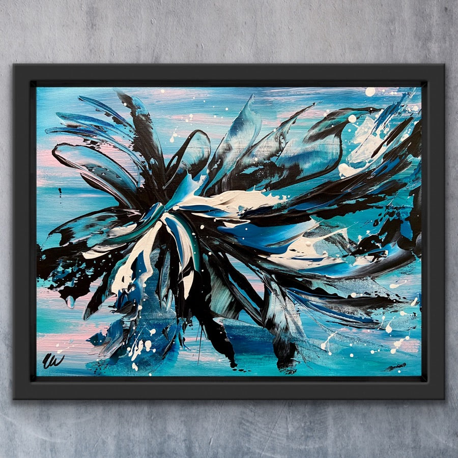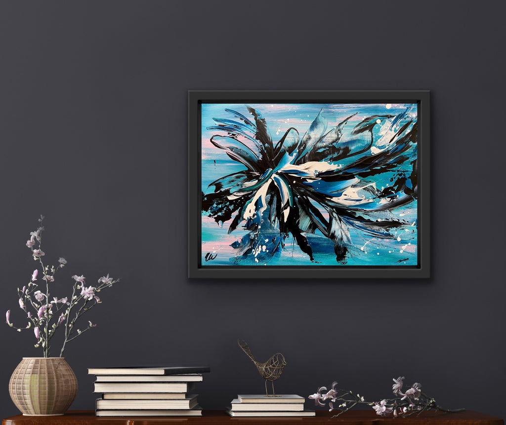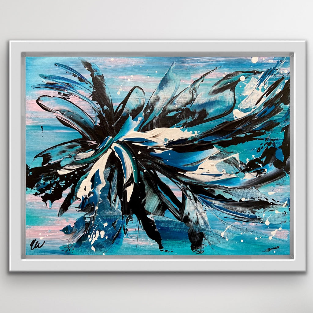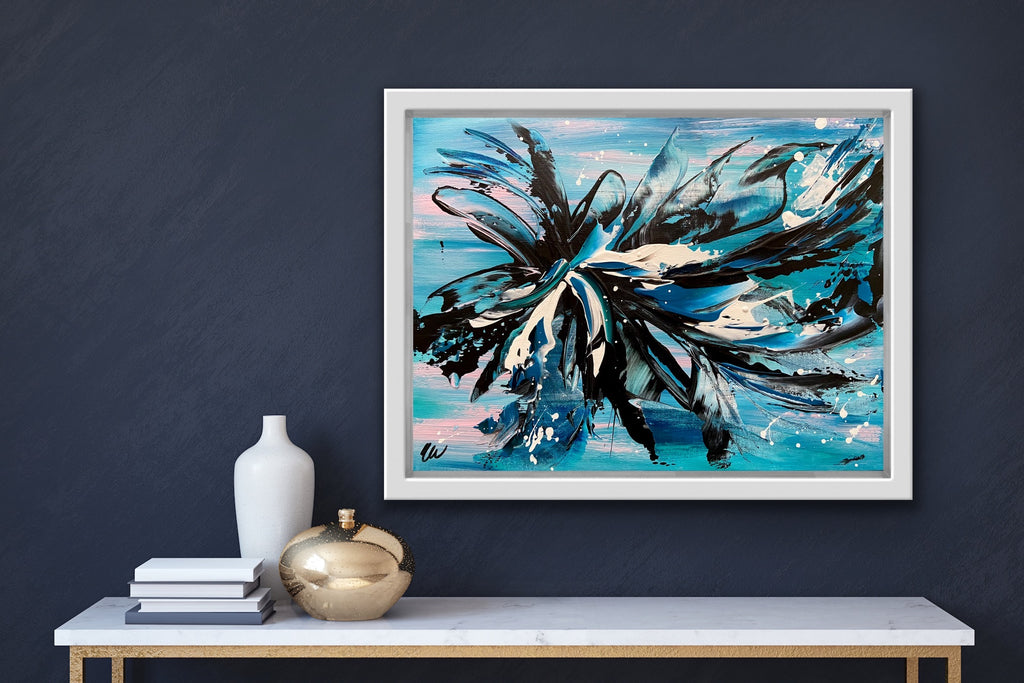 Oceans Away is a beautiful abstract piece that will brighten up any corner in your home. 41 x 30 cm. Acrylic on canvas board. Requires framing. Some images show what this painting will look like framed. Frames not included. See how this painting was made on my YouTube channel. No returns on original artworks so please choose carefully.