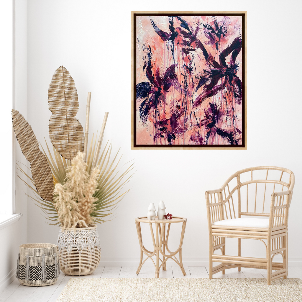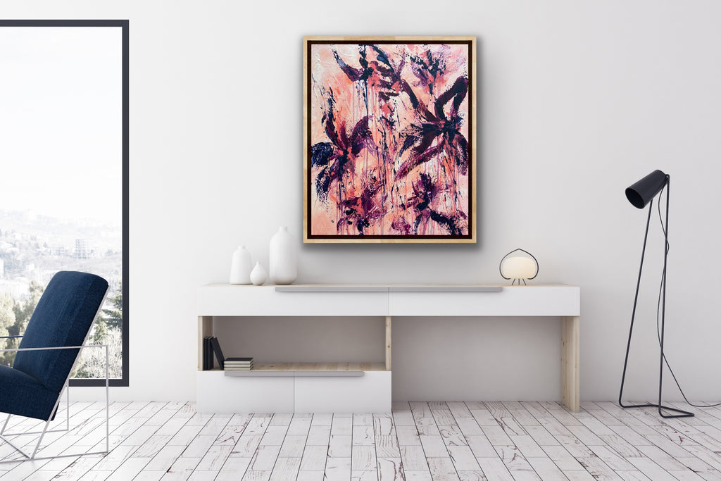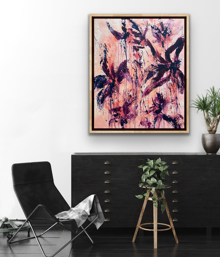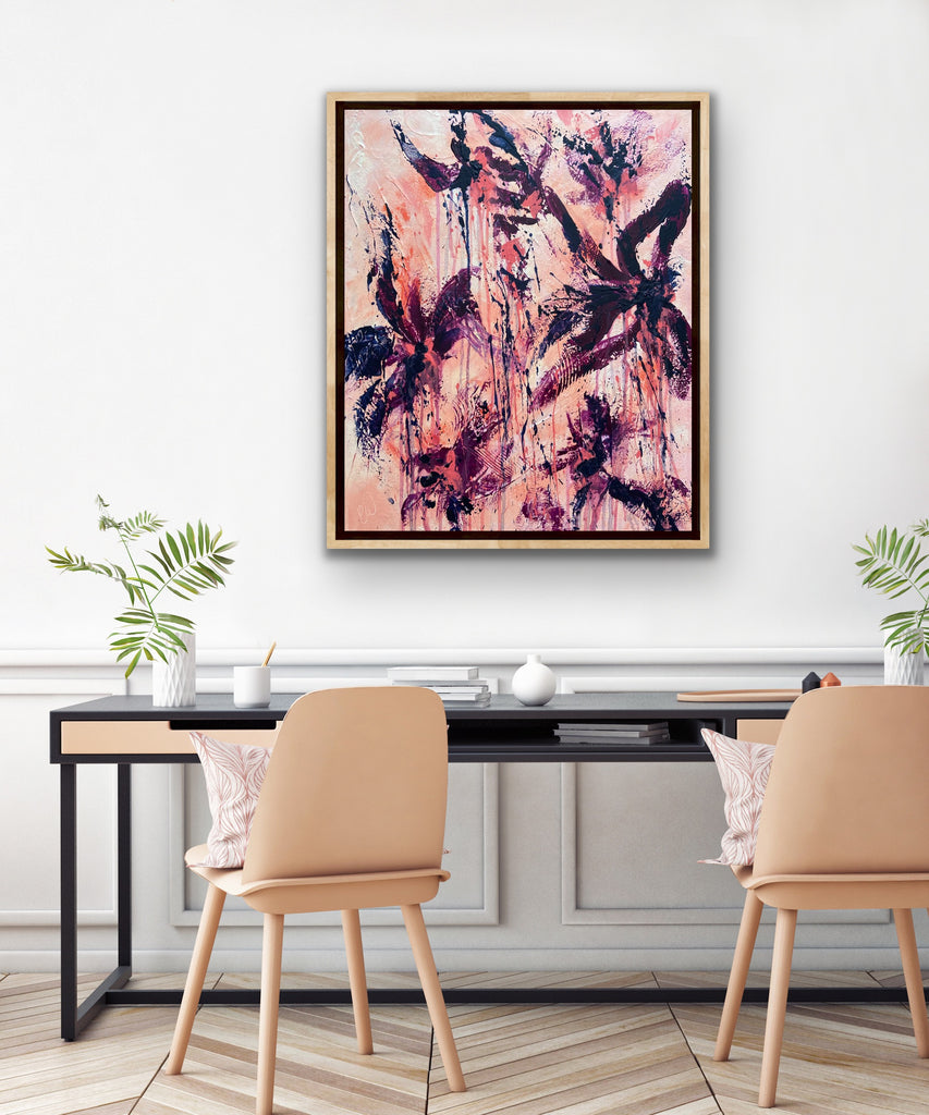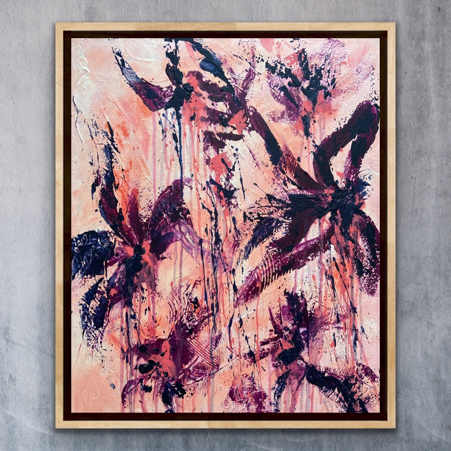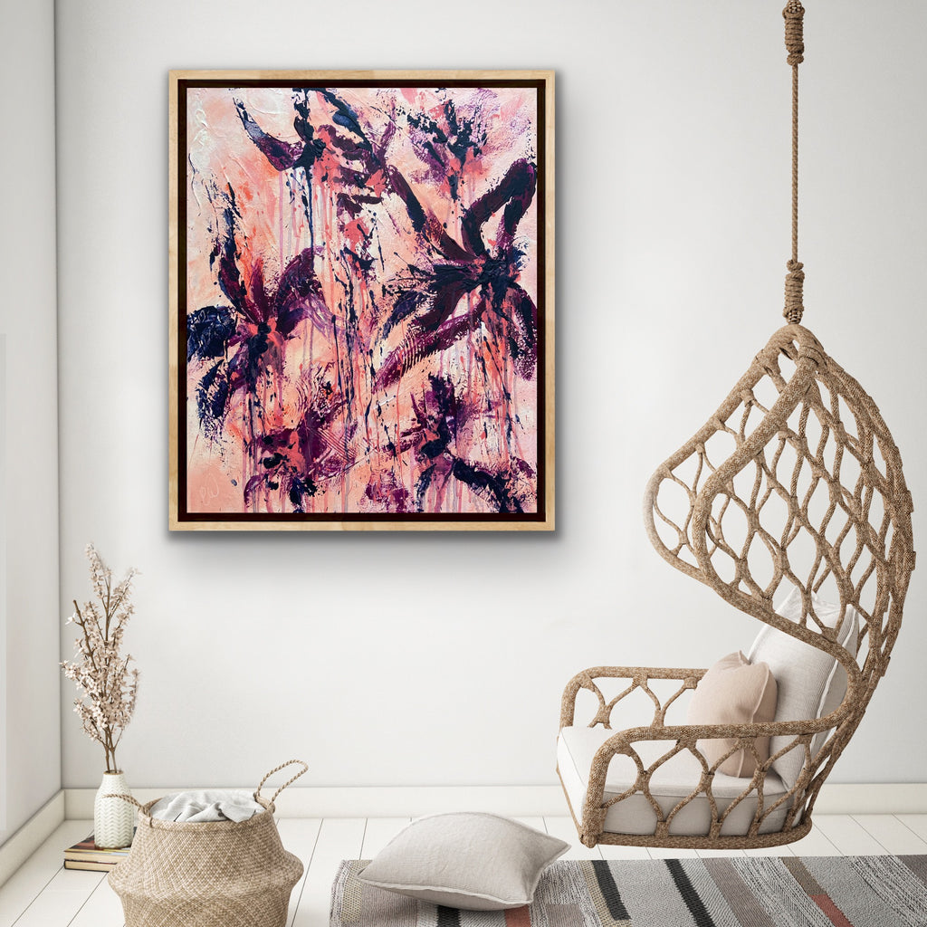 Peachy Keen is an abstract botanical piece with lots of texture and a beautiful colour palette. 50 x 60 cm. Acrylic on canvas, ready to hang. Some images show what this piece looks like framed. Frames not included. No returns on original artworks so please choose carefully.