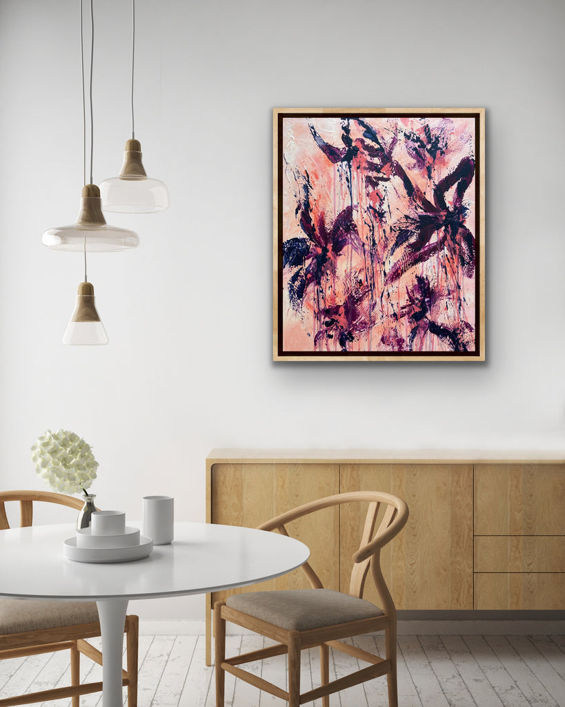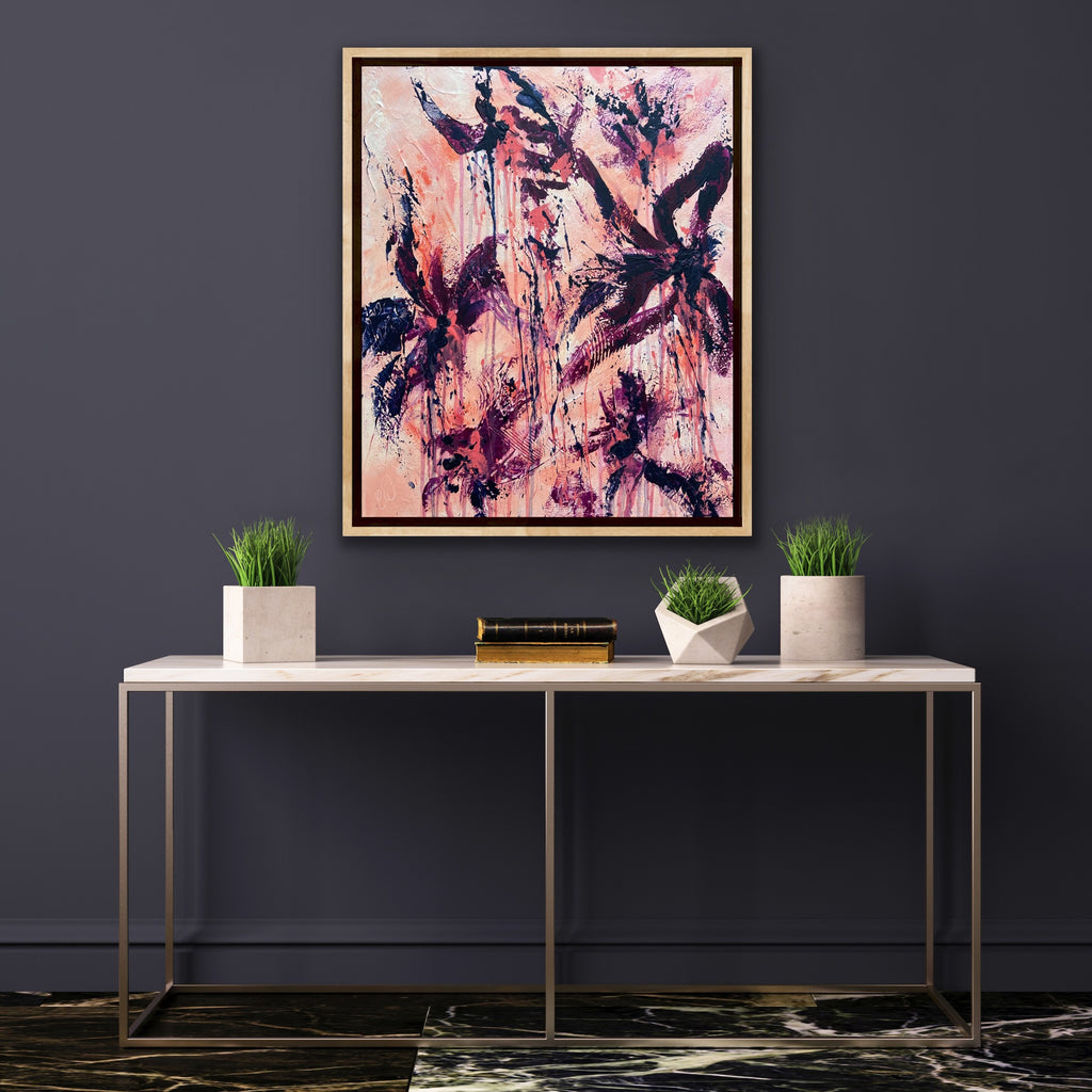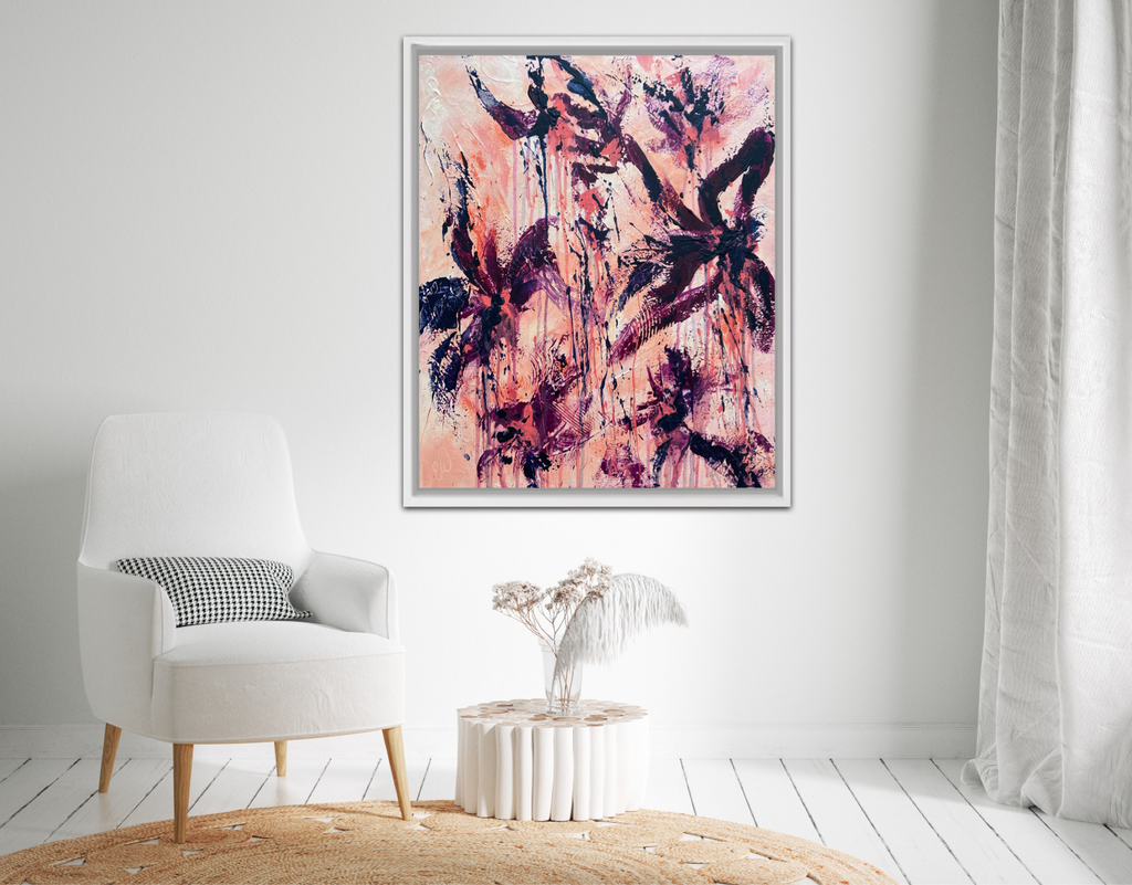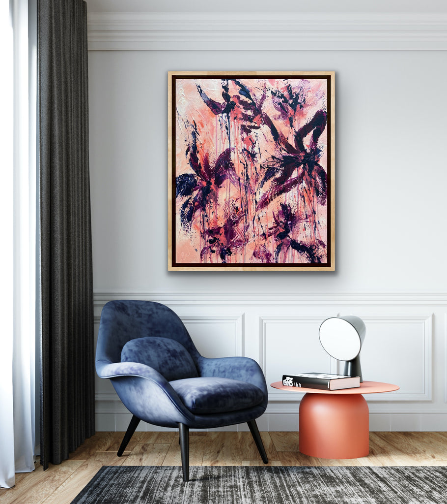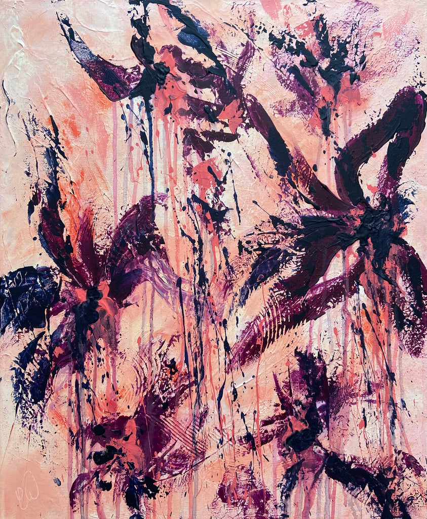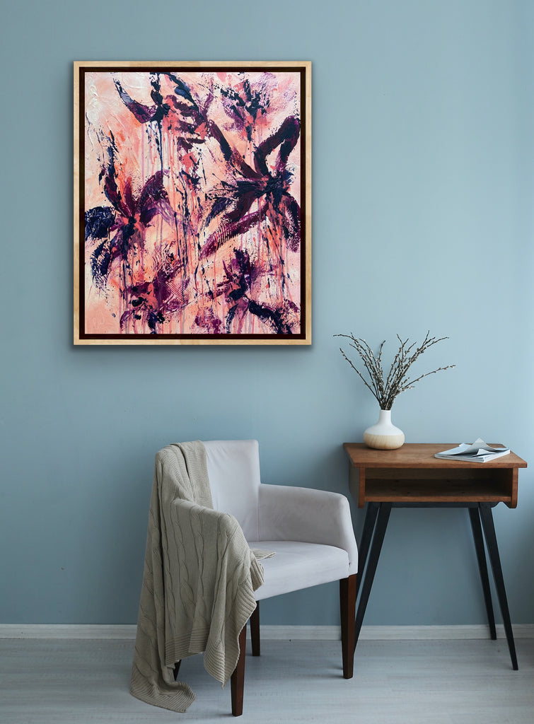 Peachy Keen is an abstract botanical piece with lots of texture and a beautiful colour palette. 50 x 60 cm. Acrylic on canvas, ready to hang. Some images show what this piece looks like framed. Frames not included. No returns on original artworks so please choose carefully.