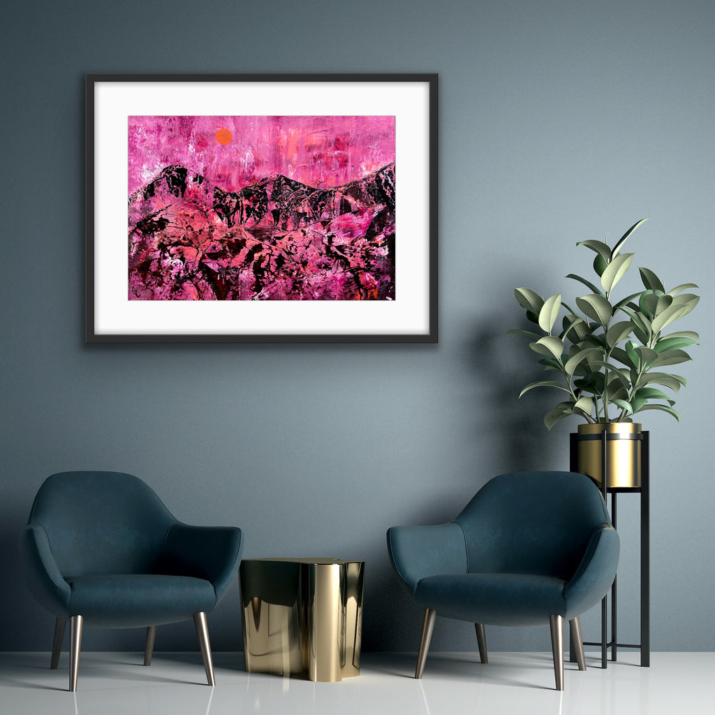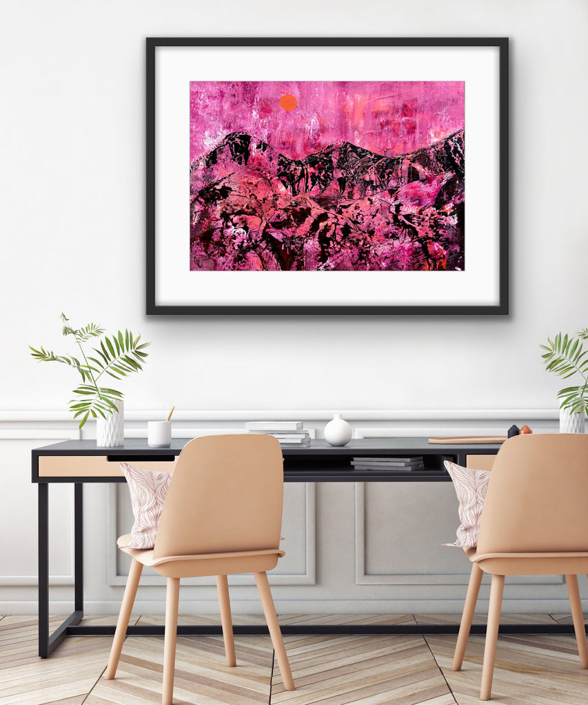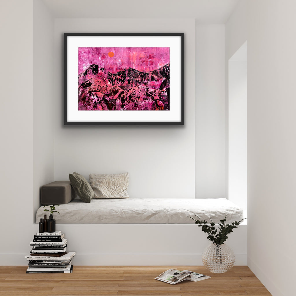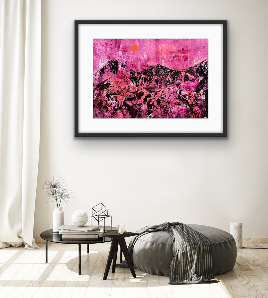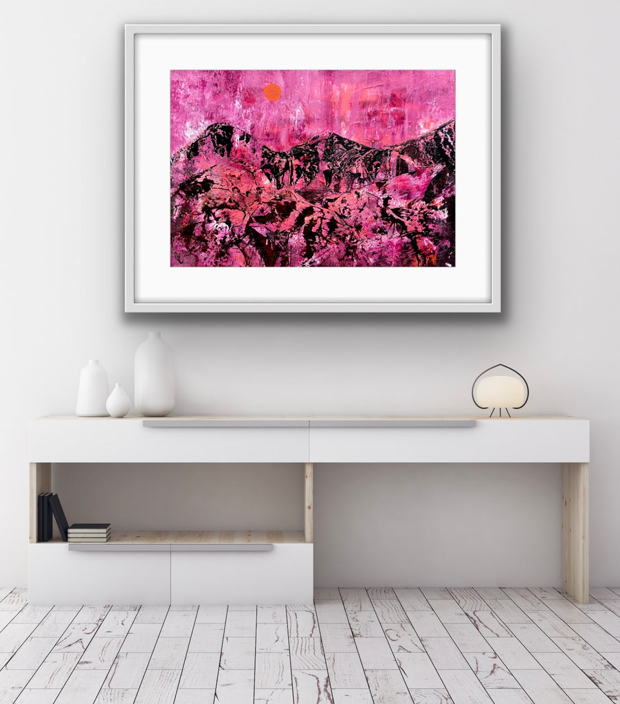 Pink Sunset is a beautifully textured abstract landscape. Some images show what this piece looks like framed. Frames not included. 59.4 x 42 cm (A2 size) Acrylic on paper. Requires framing. No returns on original artworks so please choose carefully.
