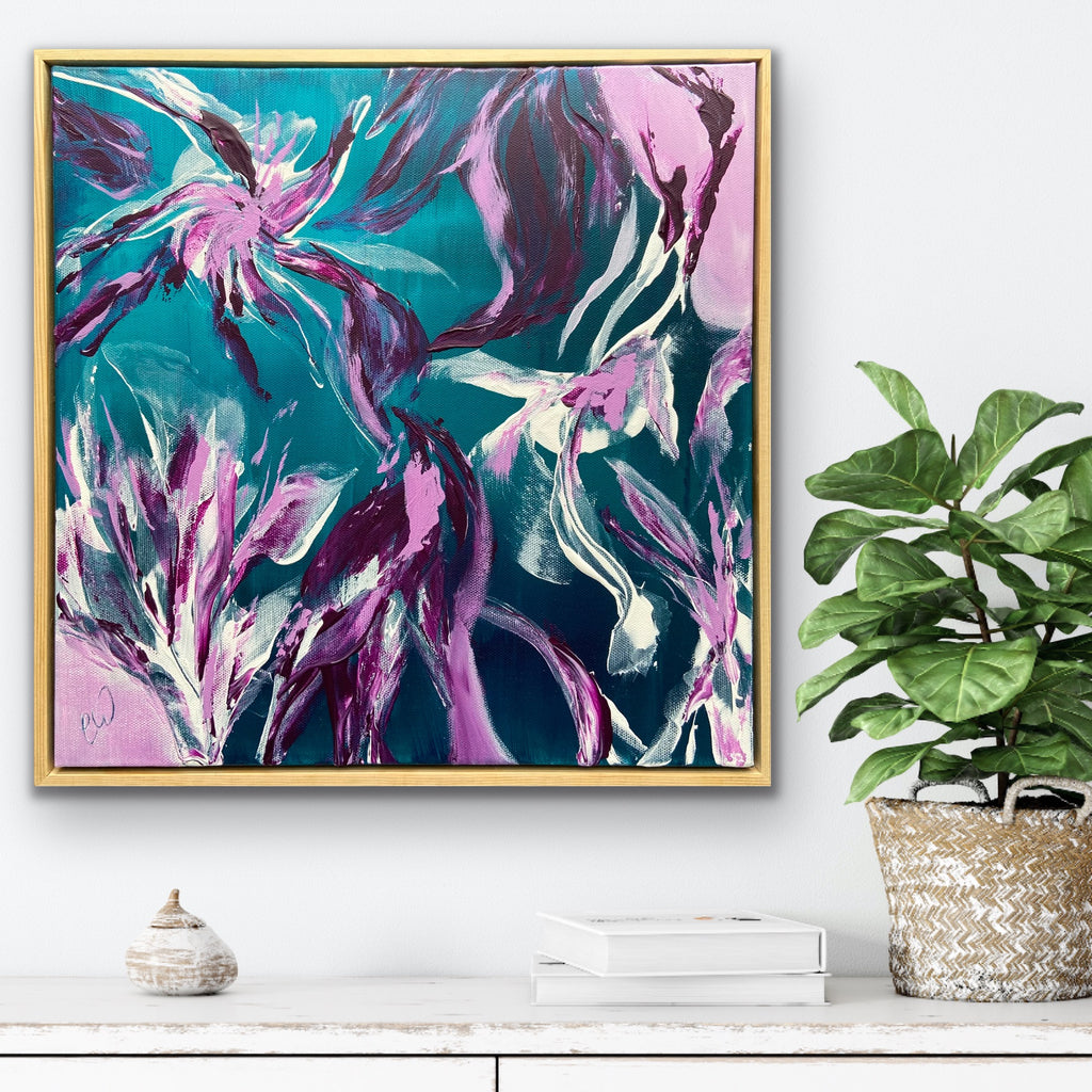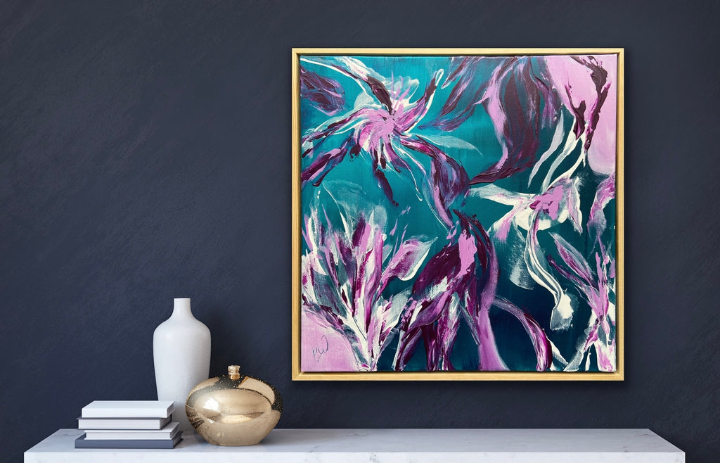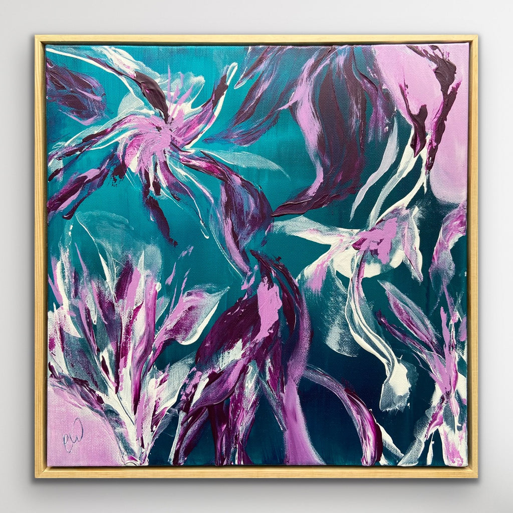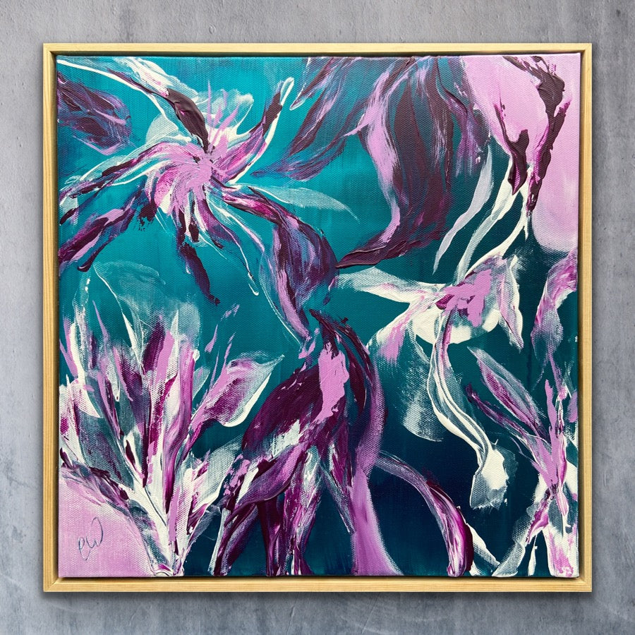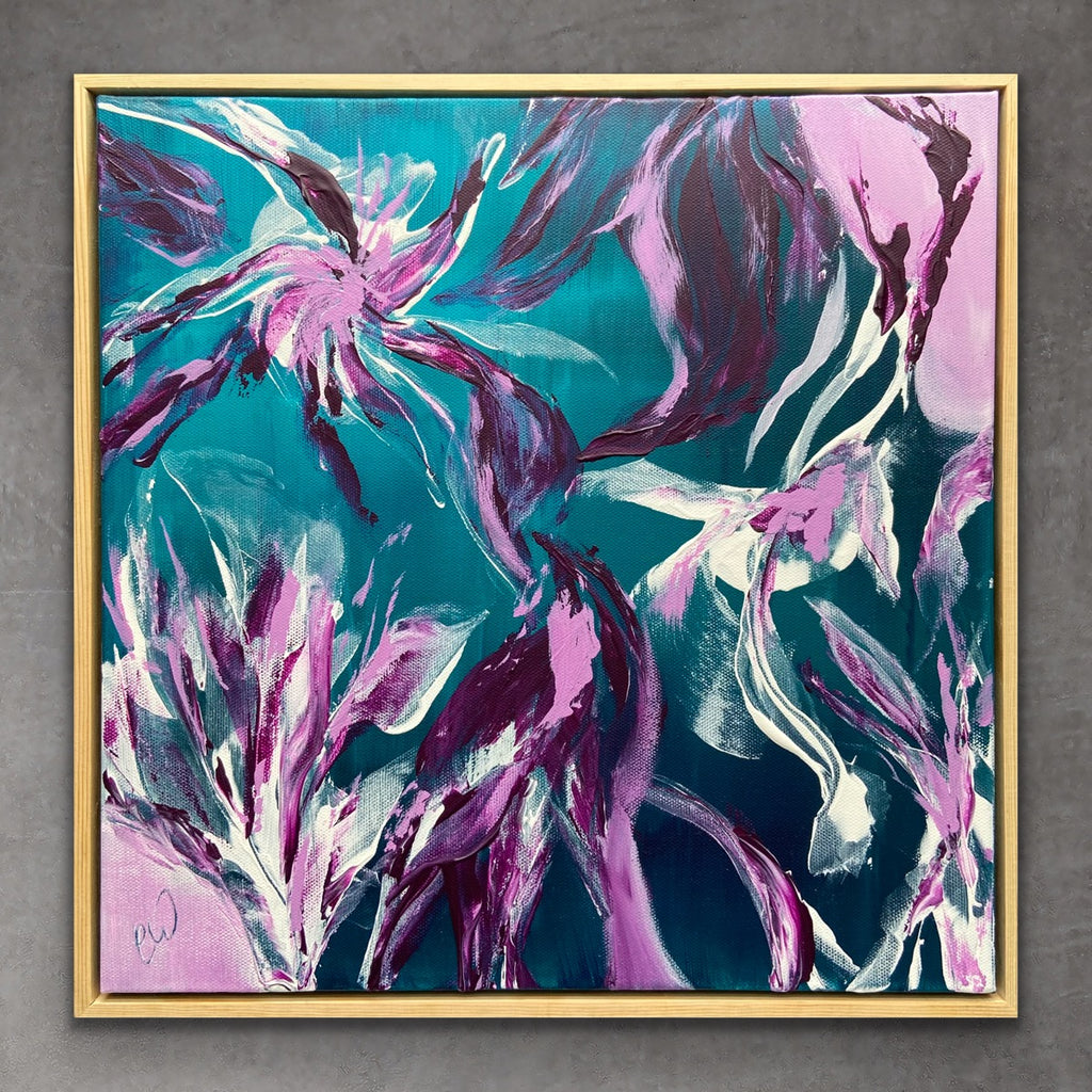 Quiet Moments is a pretty abstract botanical piece. This painting will bring life to any space. Canvas is 35.5 x 35.5 x 5 cm. Acrylic on canvas with wooden frame. Ready to hang. (Measurements with frame are: 38 x 38 x 6 cm). No returns on original artworks so please choose carefully.