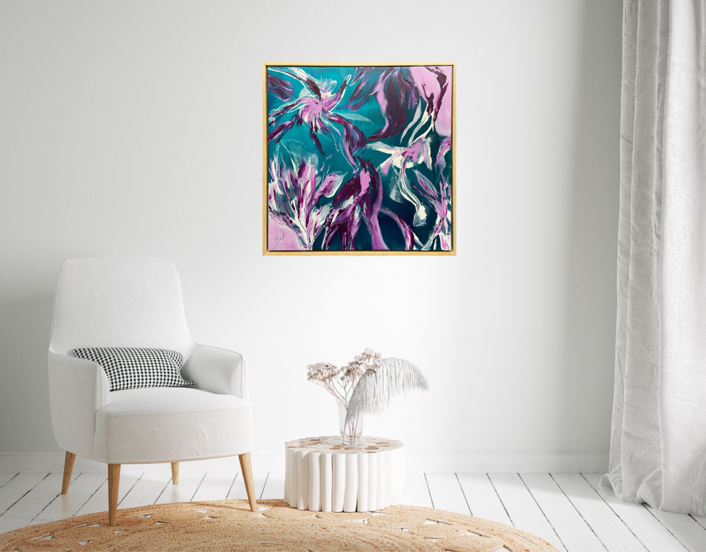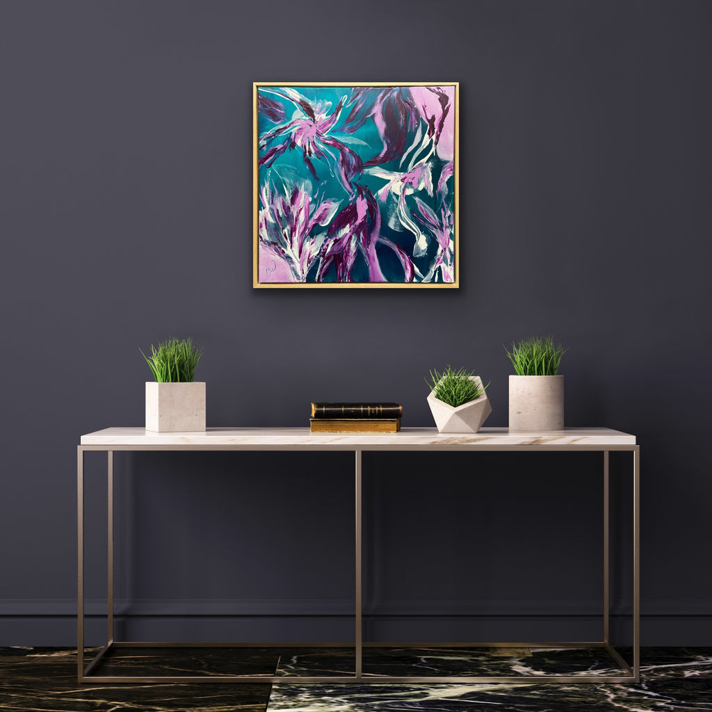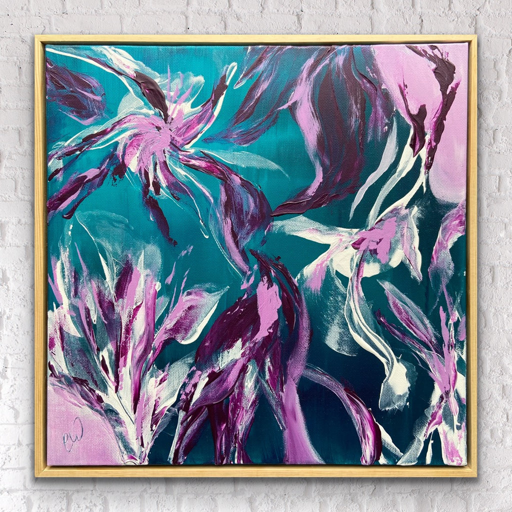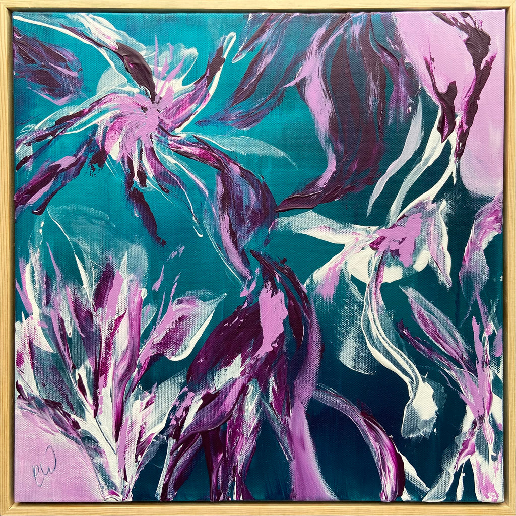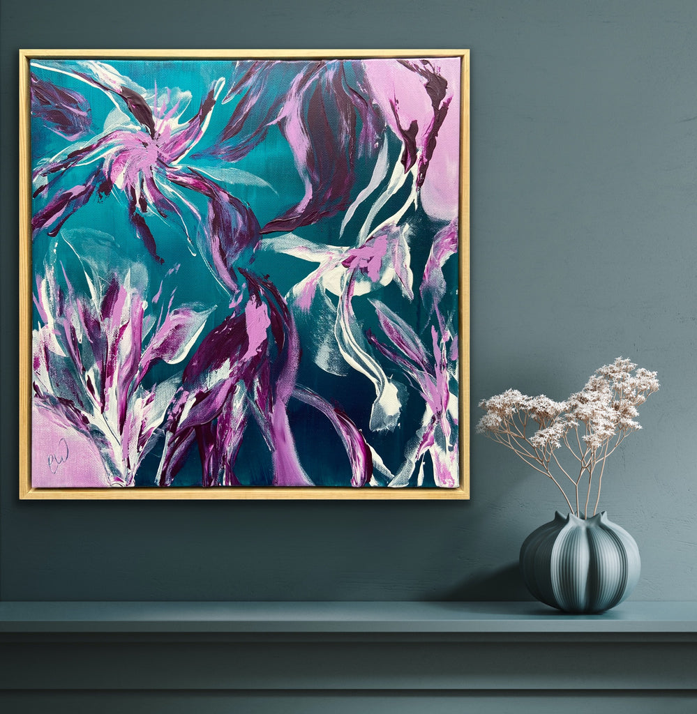 Quiet Moments is a pretty abstract botanical piece. This painting will bring life to any space. Canvas is 35.5 x 35.5 x 5 cm. Acrylic on canvas with wooden frame. Ready to hang. (Measurements with frame are: 38 x 38 x 6 cm). No returns on original artworks so please choose carefully.