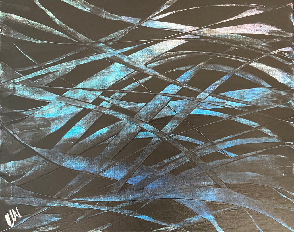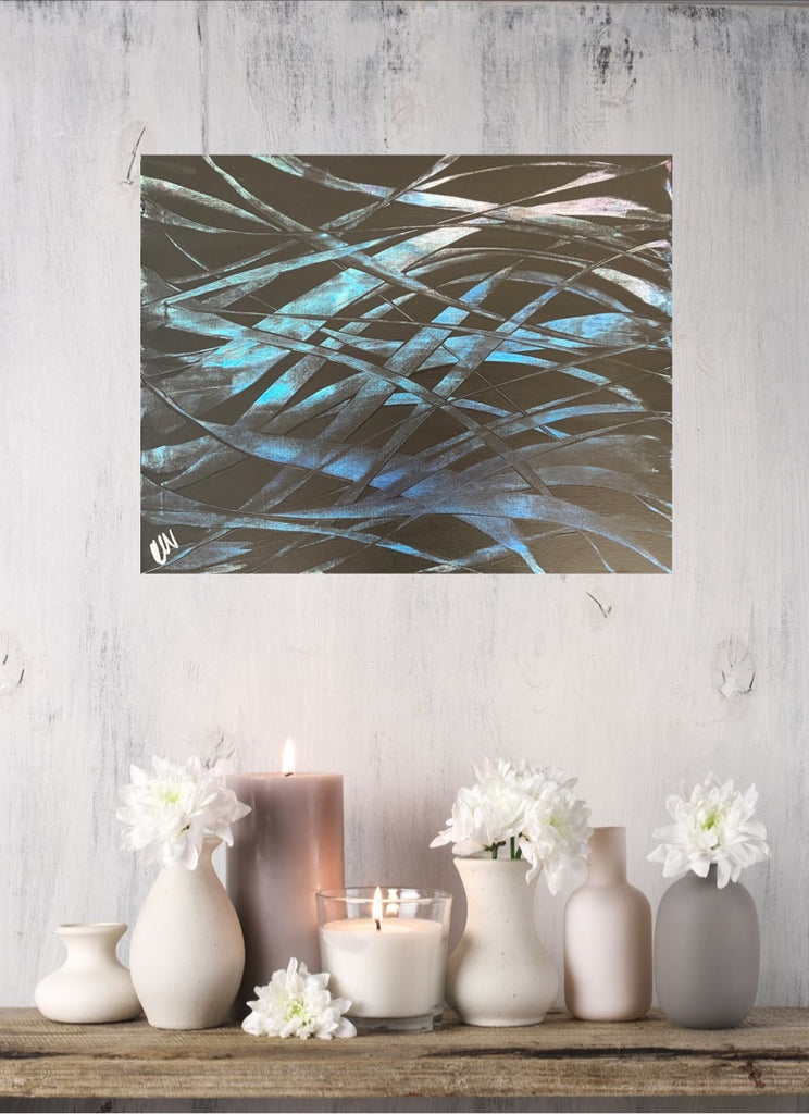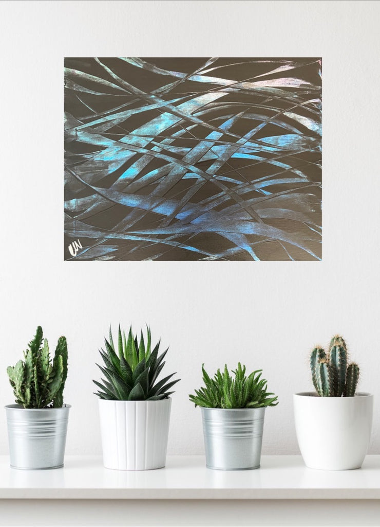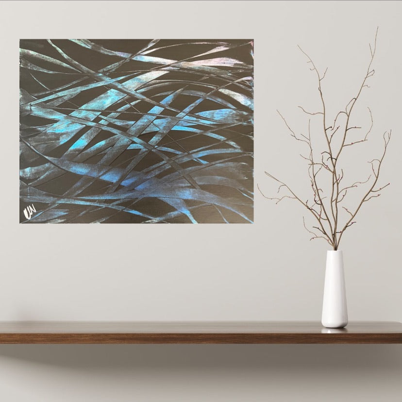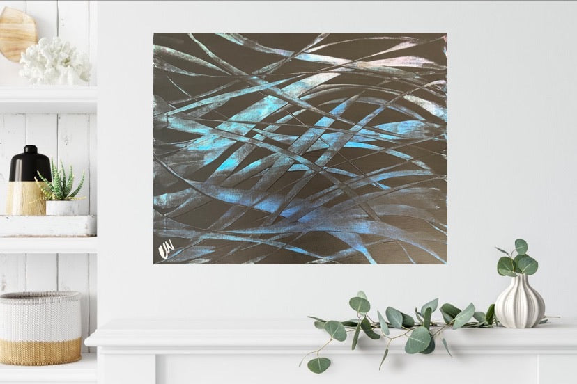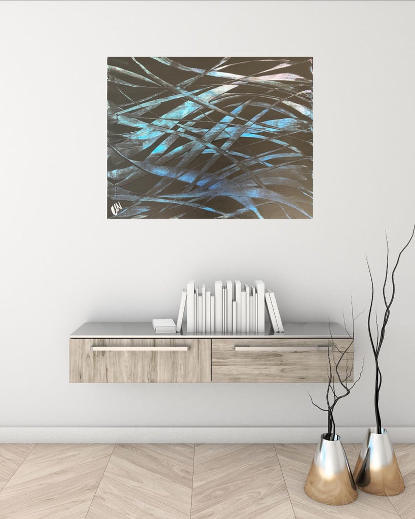 Read between the lines has a dark moody feel with light coming through also which represents the weaving through life, looking for more than what is only on the surface and skin deep. Discovering true meaning. 40.6 x 50.8 x 2 cm. Acrylic on canvas, ready to hang. No returns on original artworks so please choose carefully.