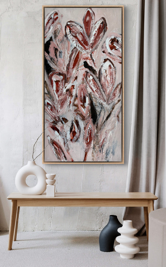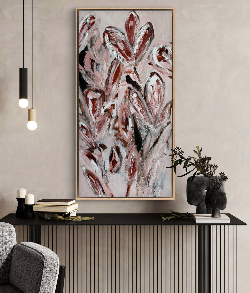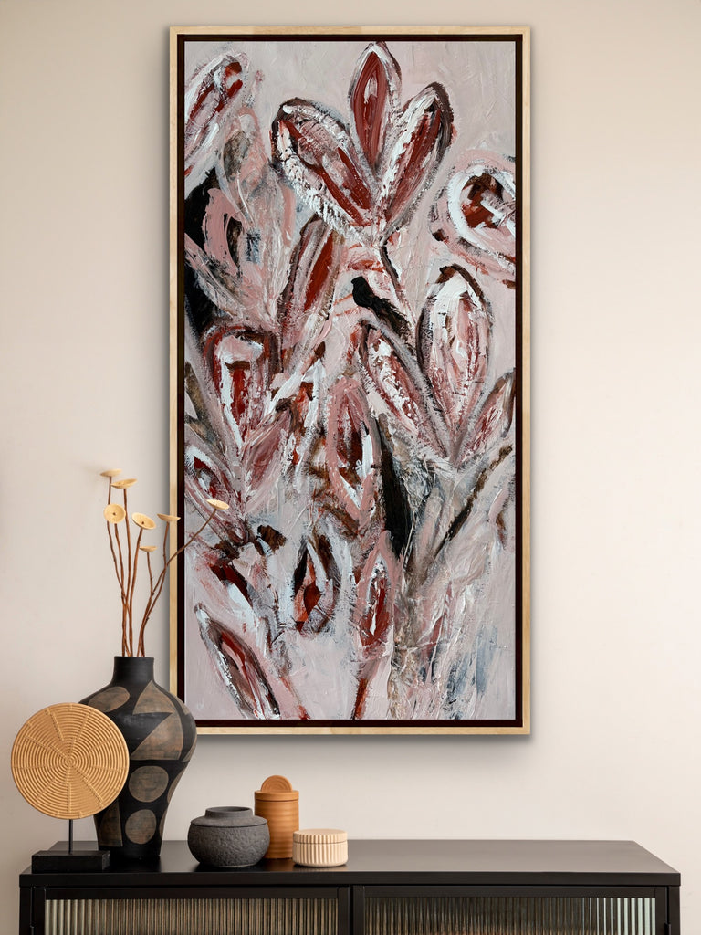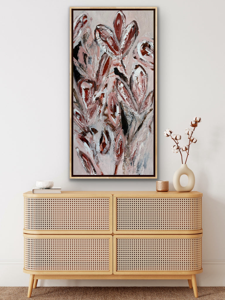 Summer Bloom is a beautifully textured abstract botanical painting. 101.6 x 50.8 cm. Acrylic on canvas, ready to hang. Frame not included. No returns on original artworks so please choose carefully.
