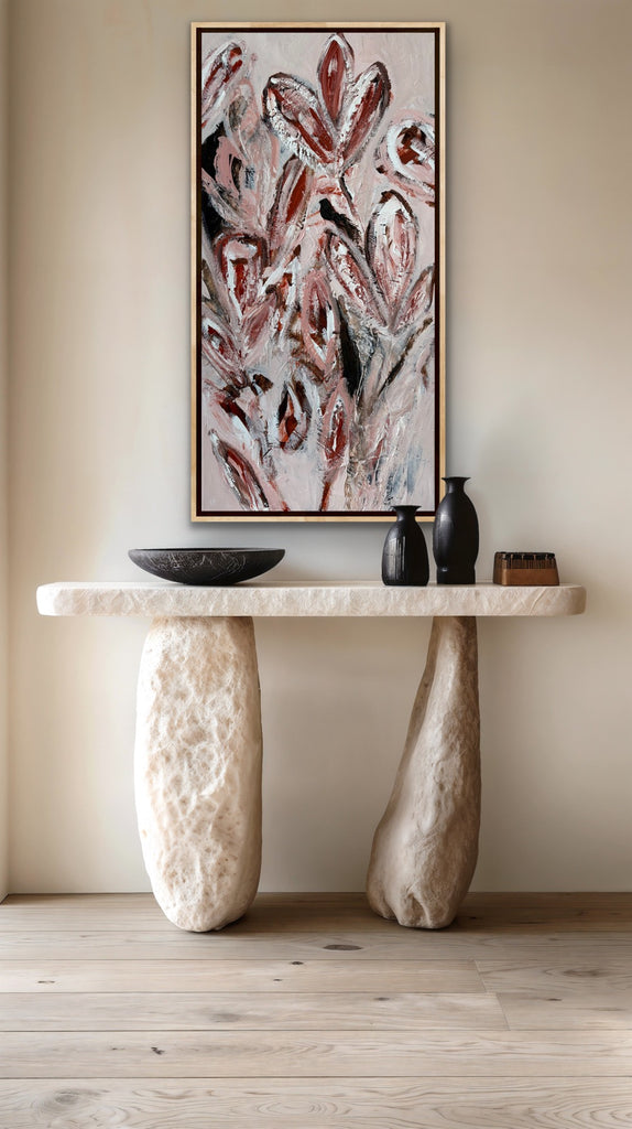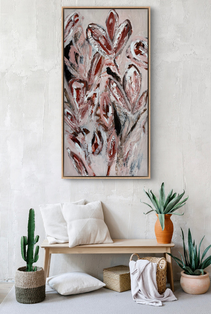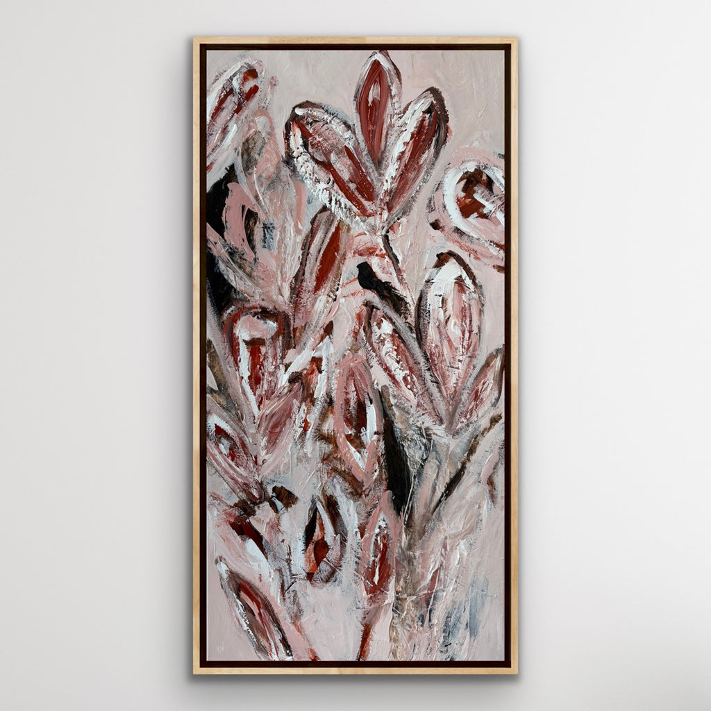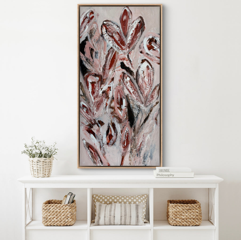 Summer Bloom is a beautifully textured abstract botanical painting. 101.6 x 50.8 cm. Acrylic on canvas, ready to hang. Frame not included. No returns on original artworks so please choose carefully.