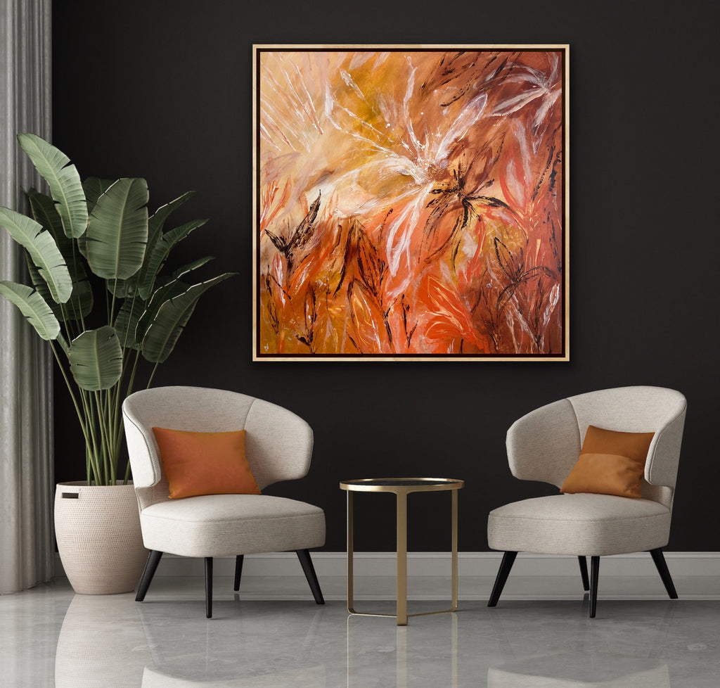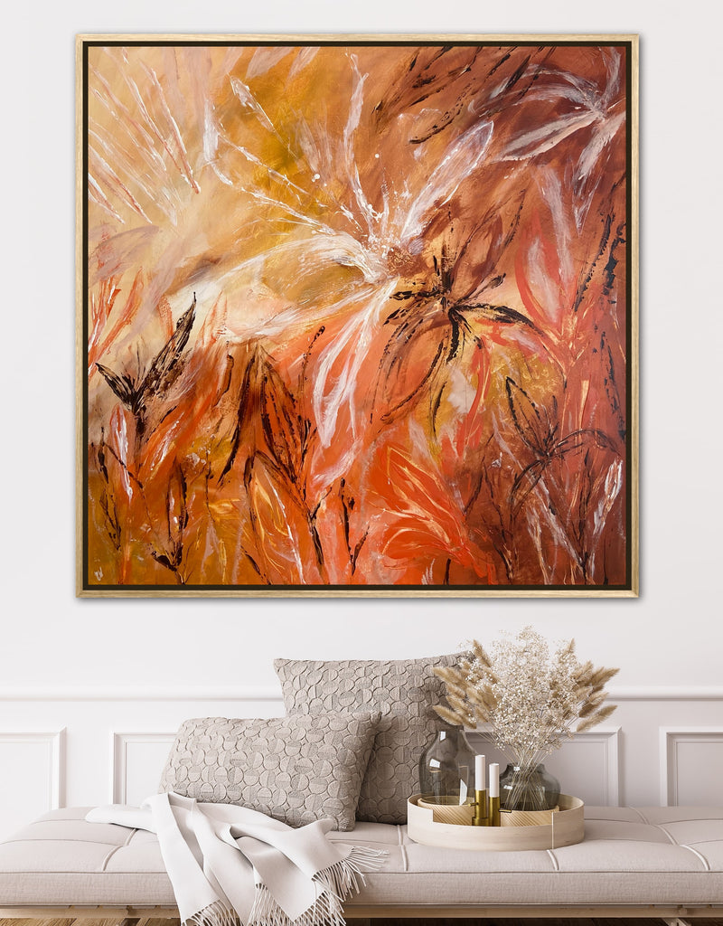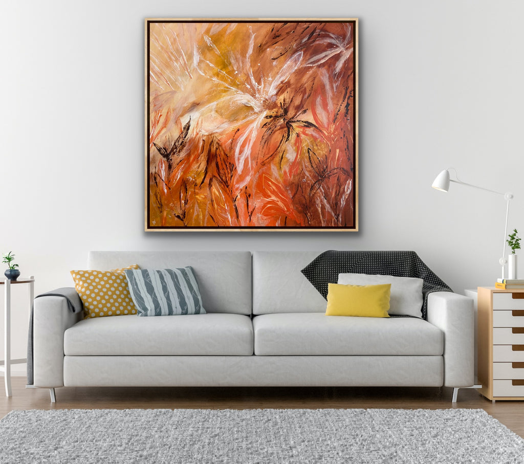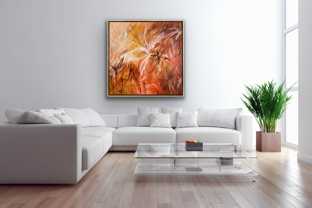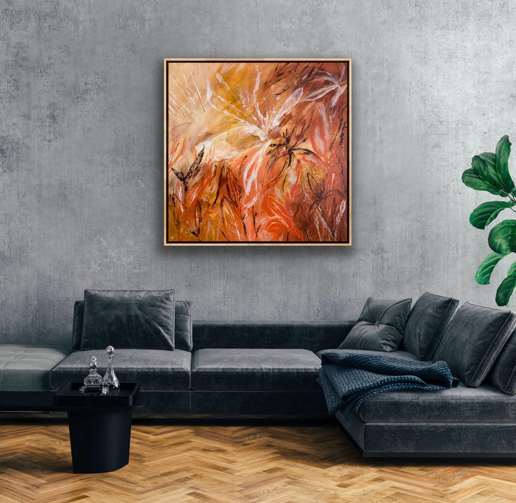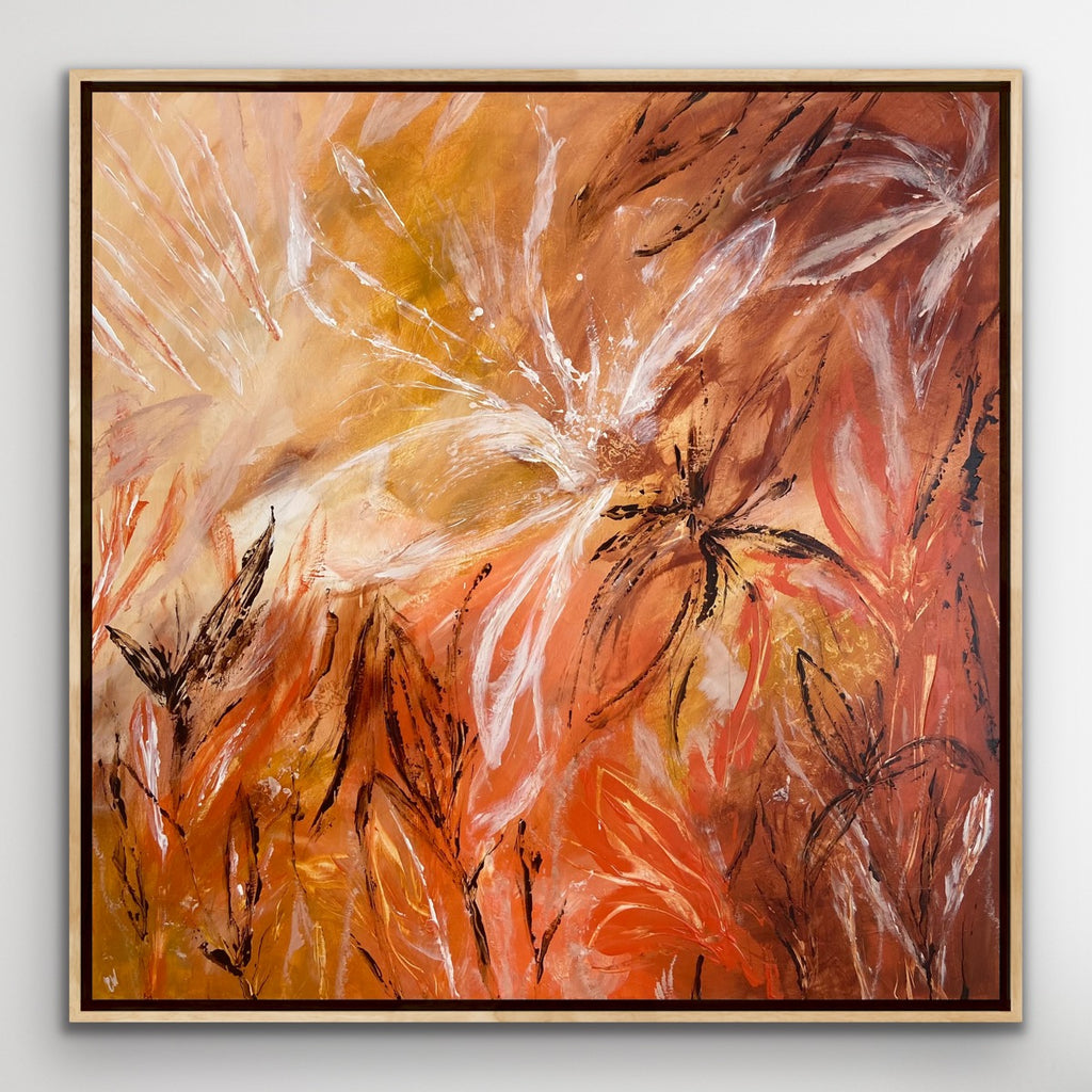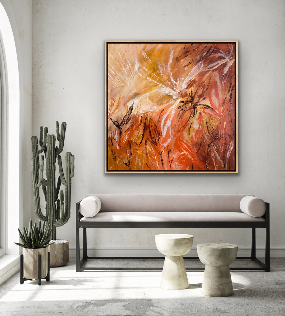 Sunshine is a beautiful tropical abstract botanical piece. 101.6 x 101.6 x 5 cm. Acrylic on canvas, ready to hang.  Frame not included. No returns on original artworks so please choose carefully.