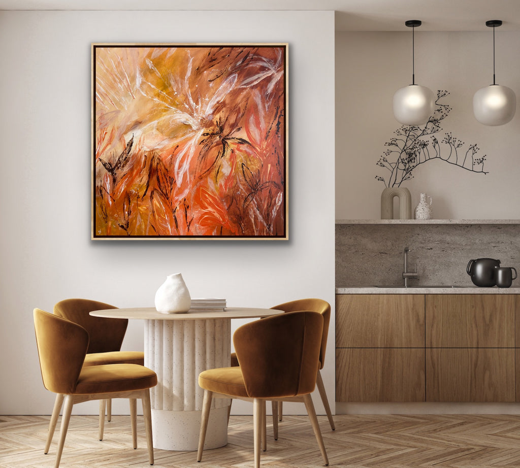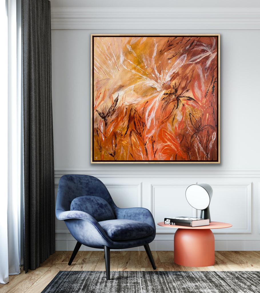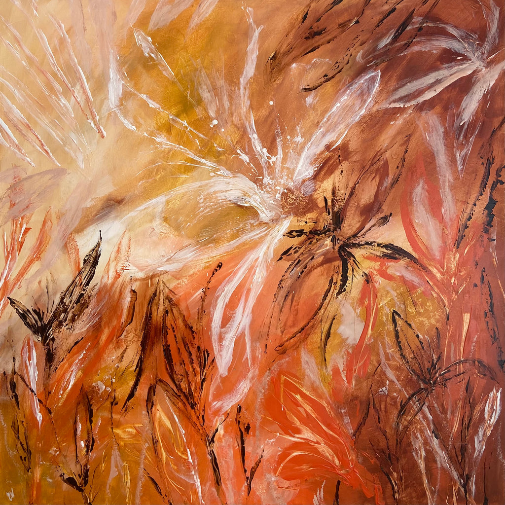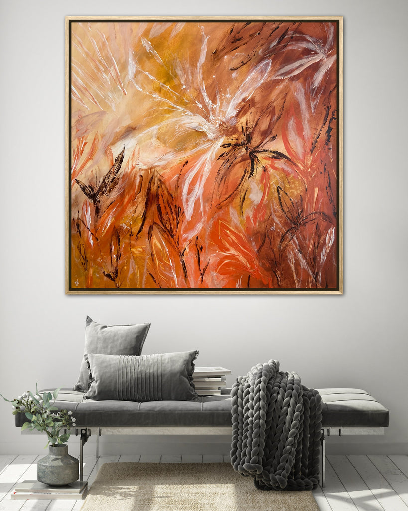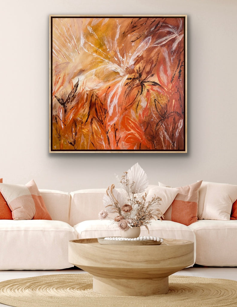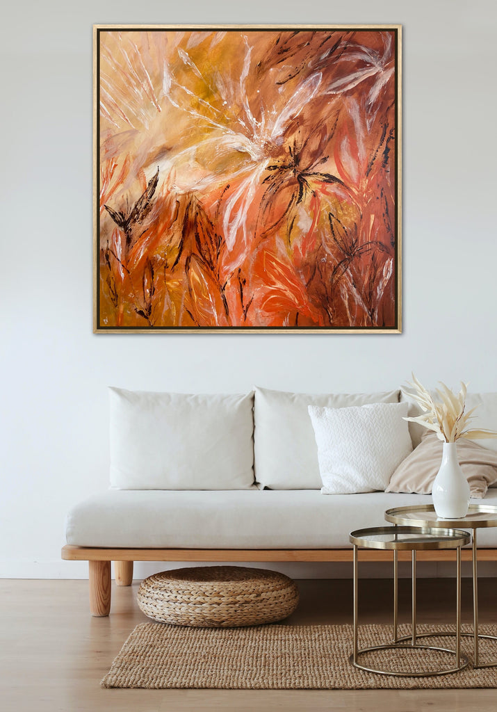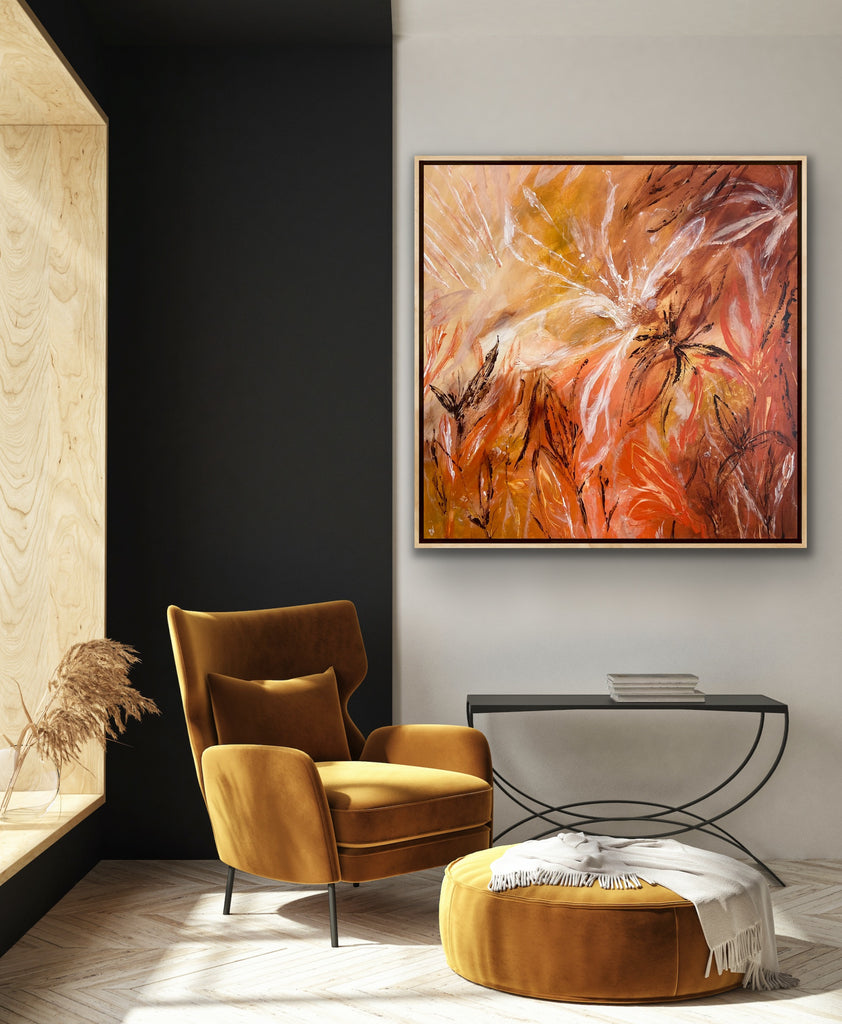 Sunshine is a beautiful tropical abstract botanical piece. 101.6 x 101.6 x 5 cm. Acrylic on canvas, ready to hang.  Frame not included. No returns on original artworks so please choose carefully.