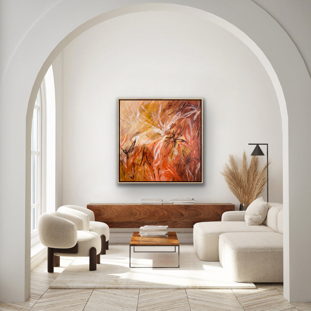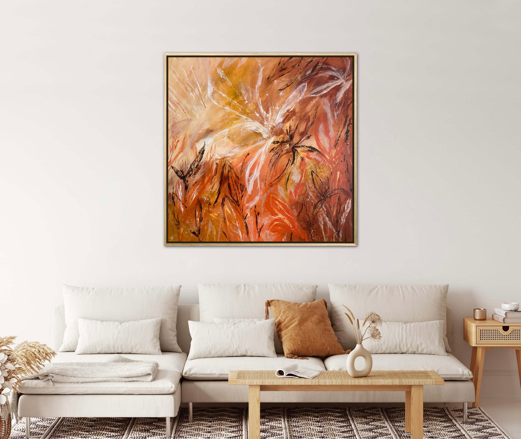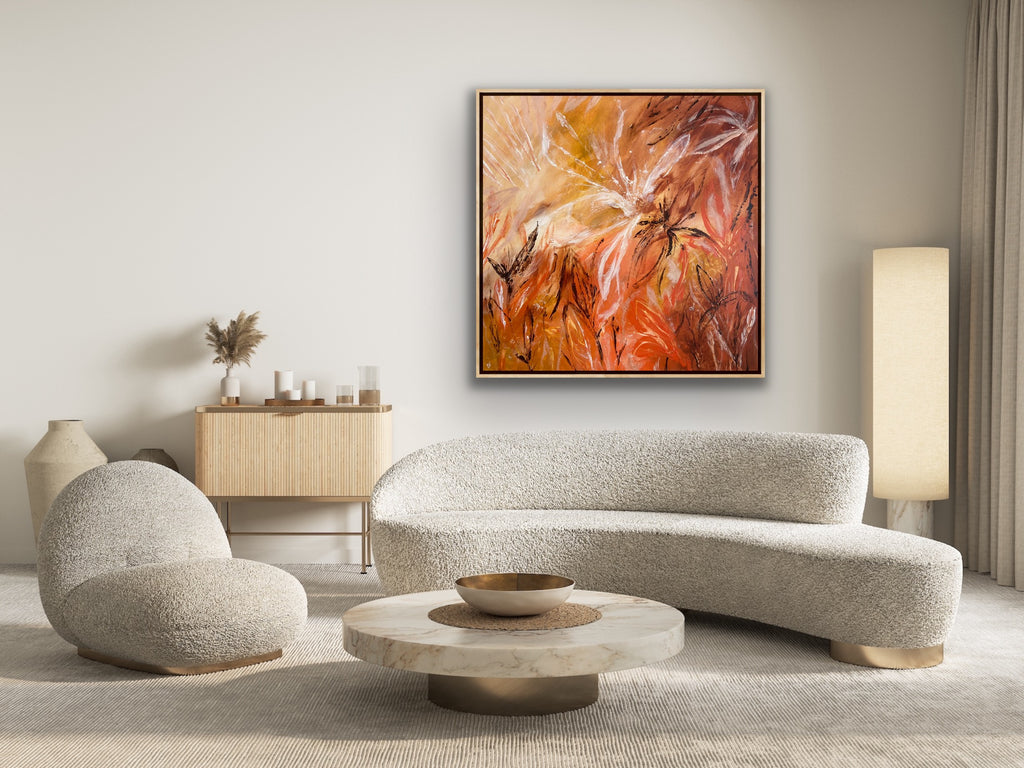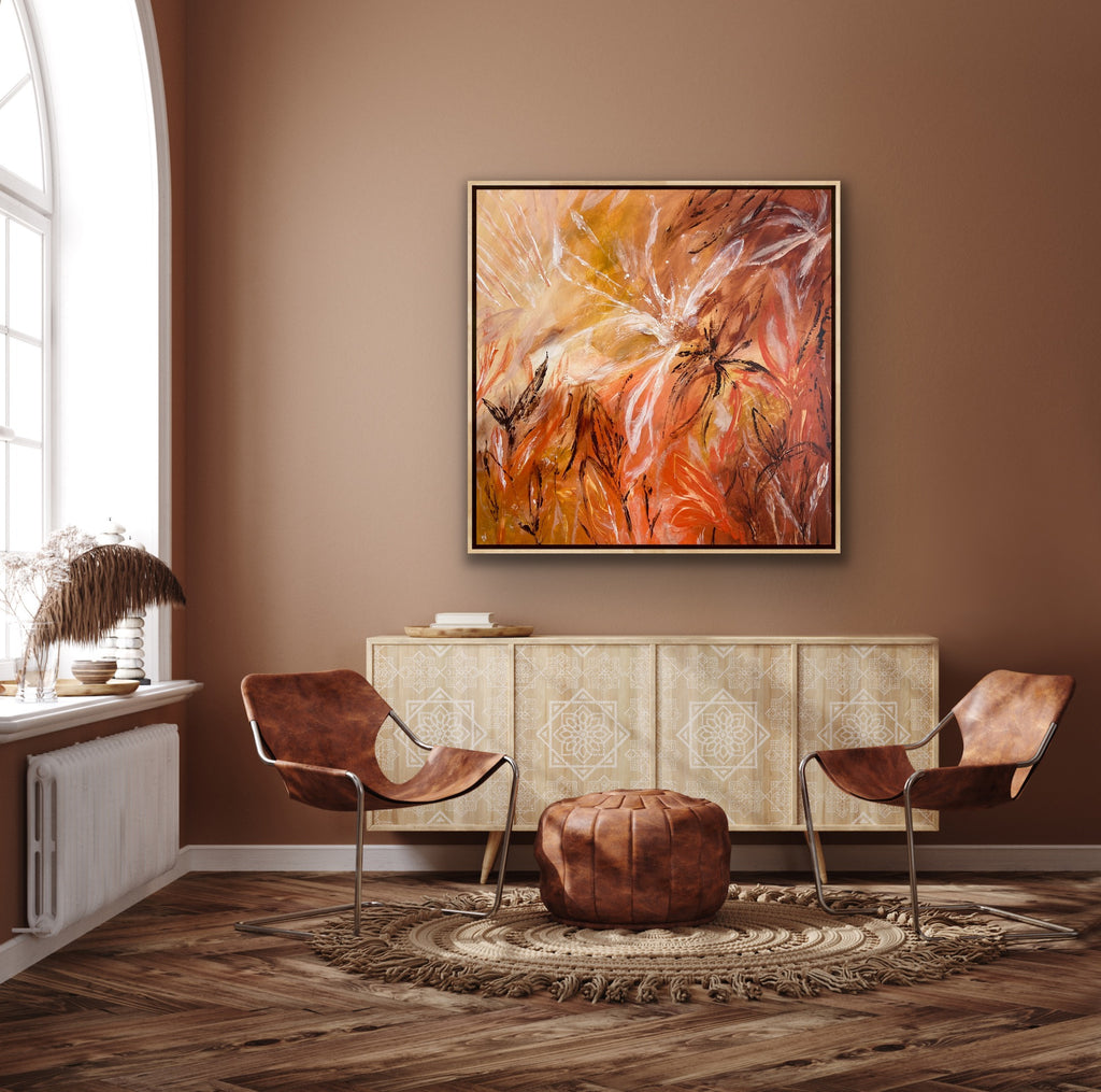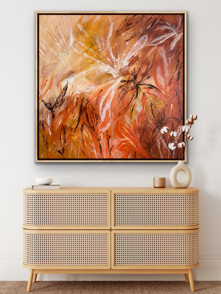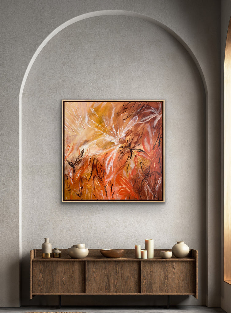 Sunshine is a beautiful tropical abstract botanical piece. 101.6 x 101.6 x 5 cm. Acrylic on canvas, ready to hang.  Frame not included. No returns on original artworks so please choose carefully.