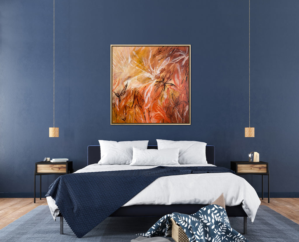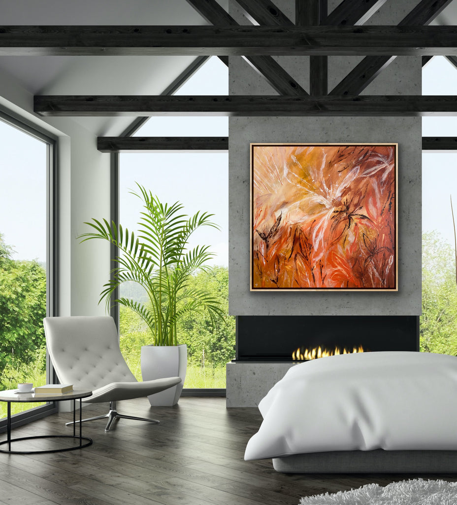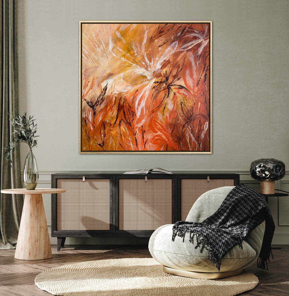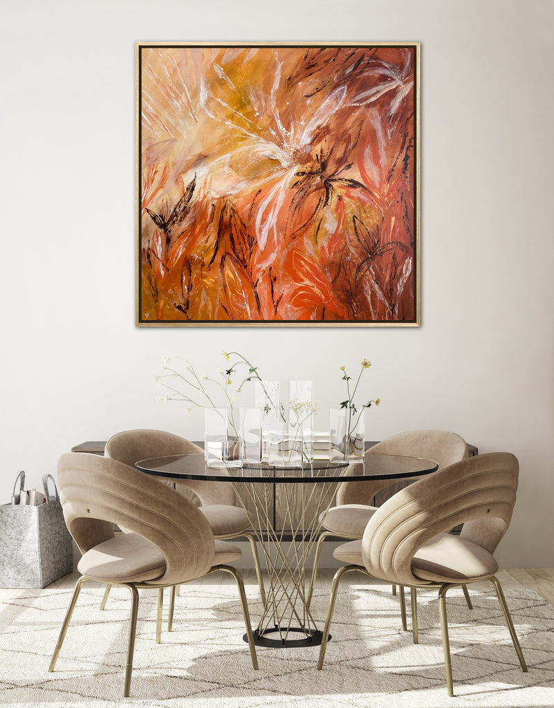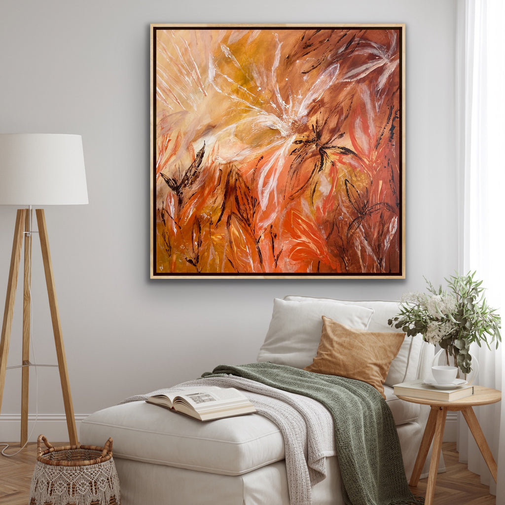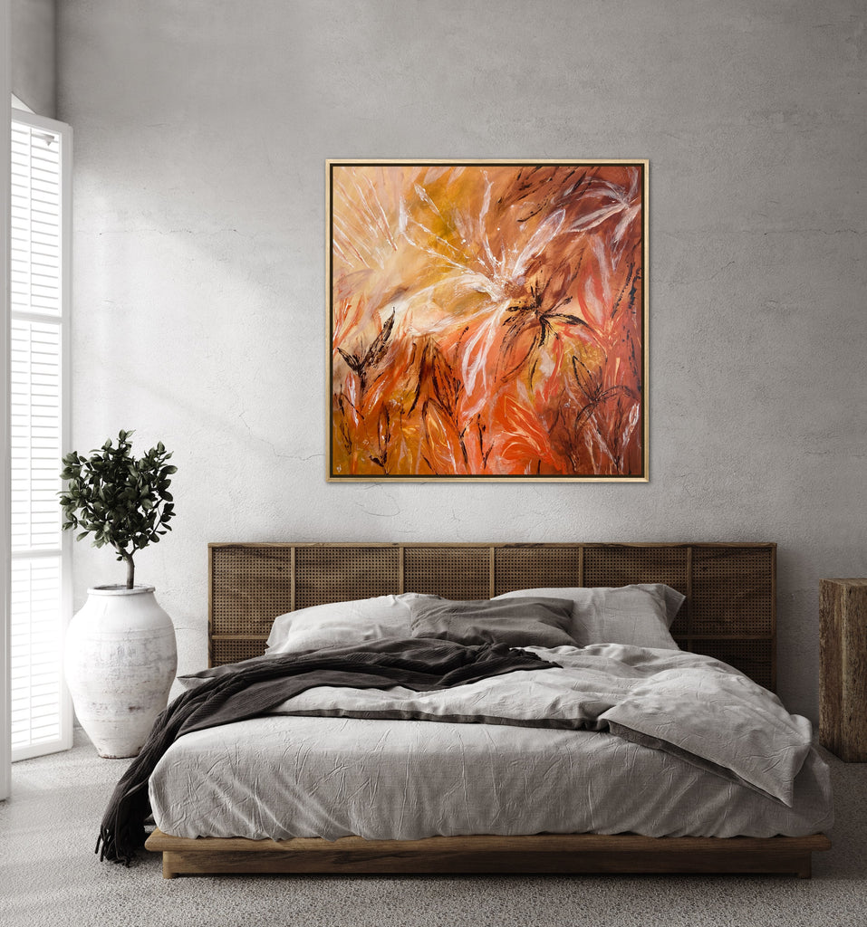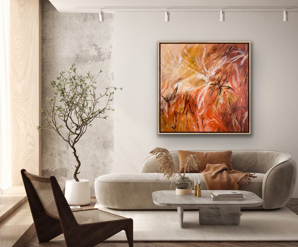Sunshine is a beautiful tropical abstract botanical piece. 101.6 x 101.6 x 5 cm. Acrylic on canvas, ready to hang.  Frame not included. No returns on original artworks so please choose carefully.