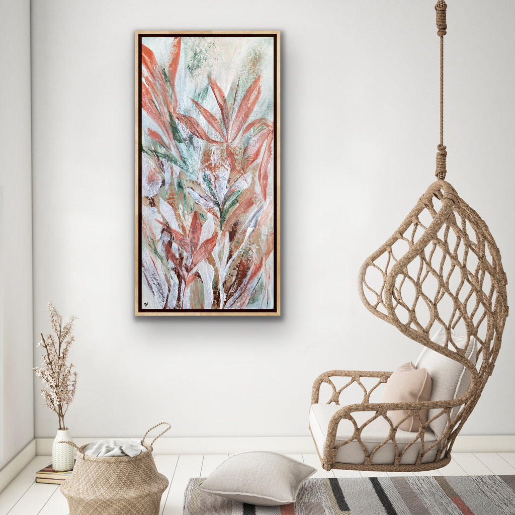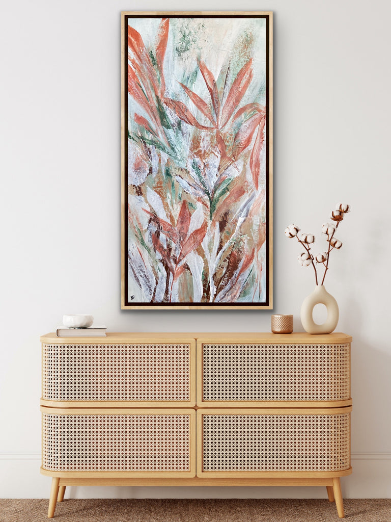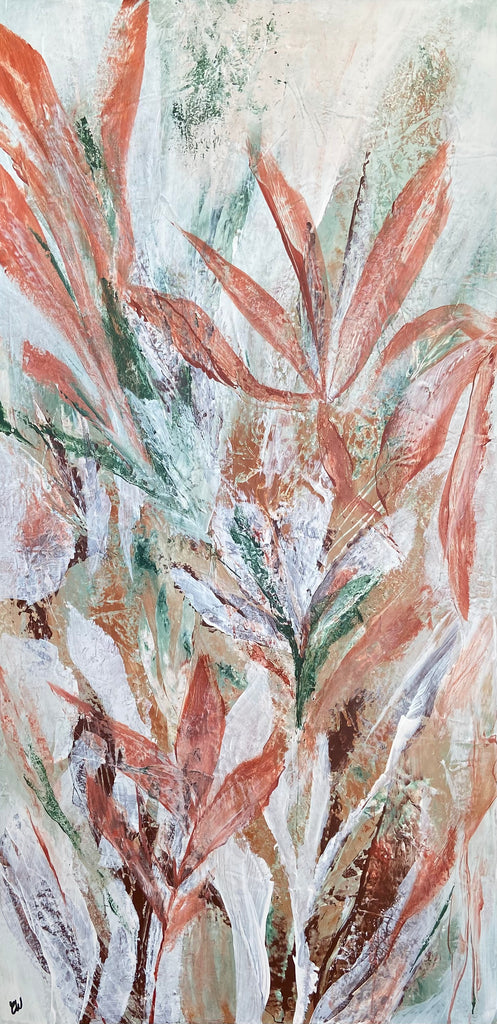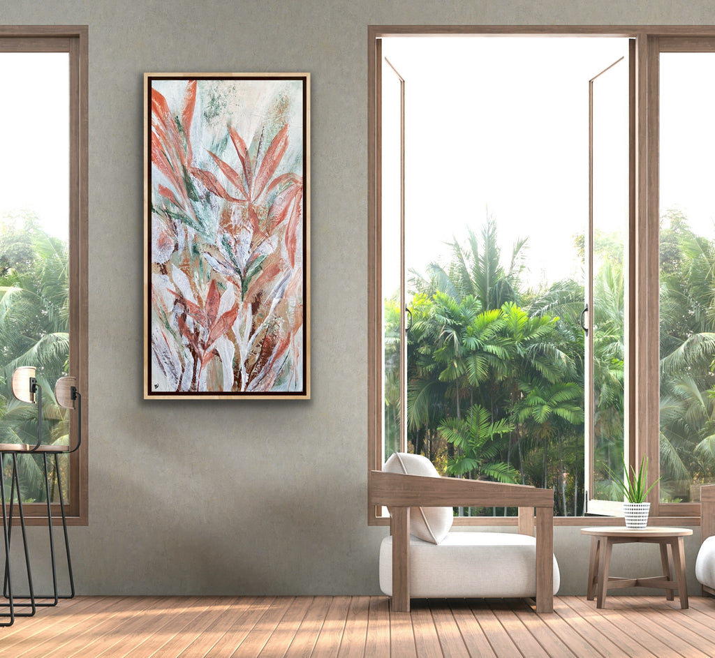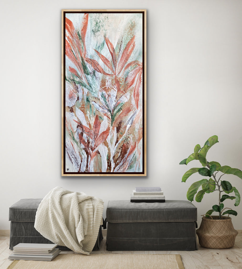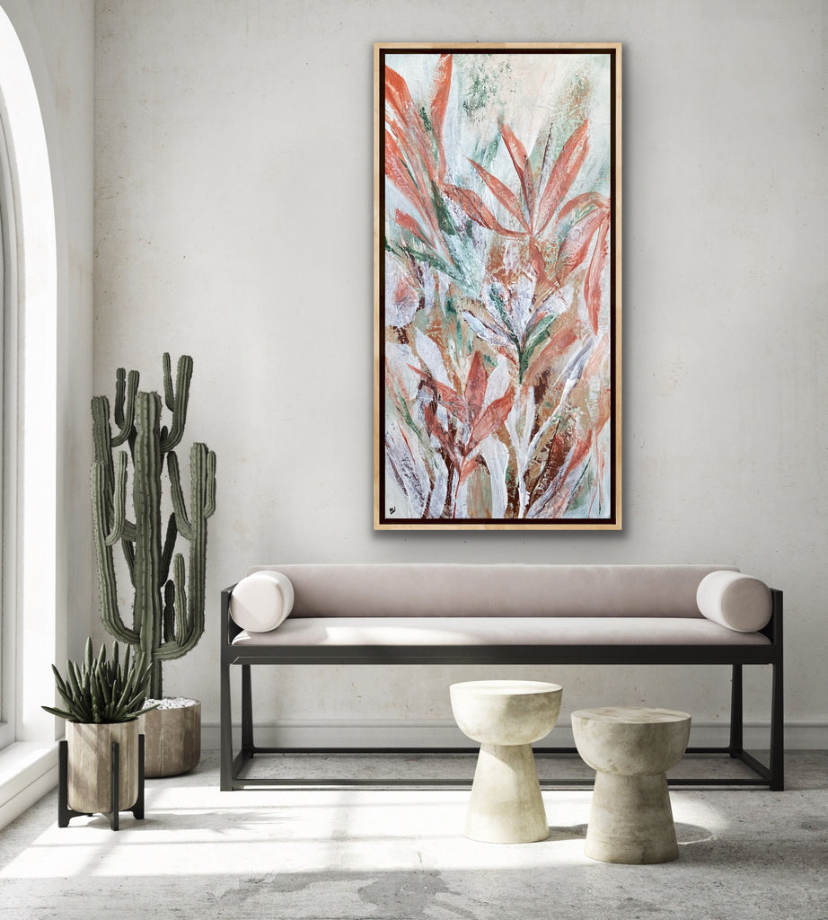 Tropical Retreat is a textured, beautiful abstract botanical painting. 101.6 x 50.8 cm. Acrylic on canvas, ready to hang. Frame is not included. No returns on original artworks so please choose carefully.