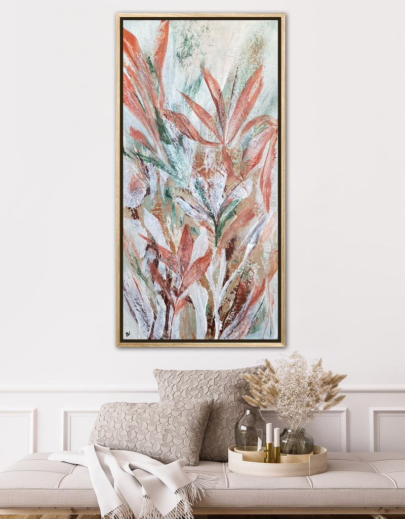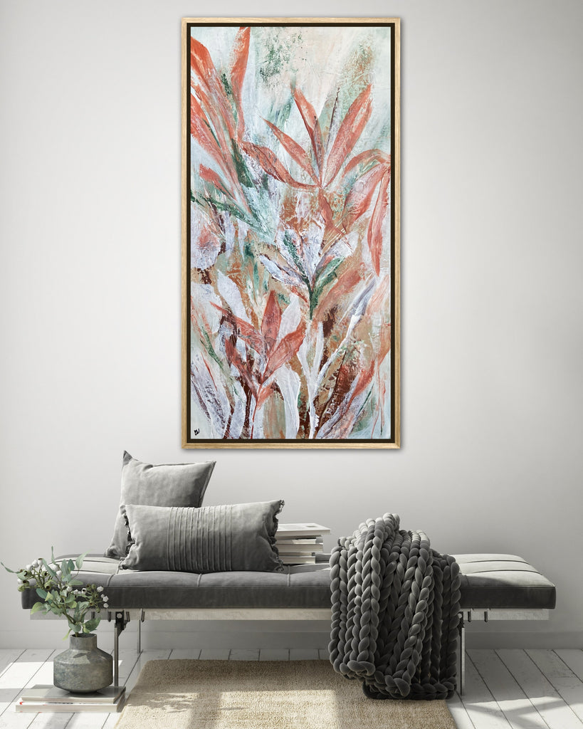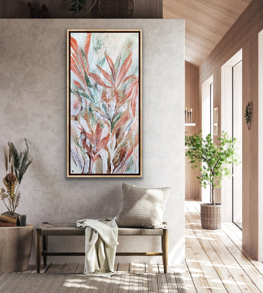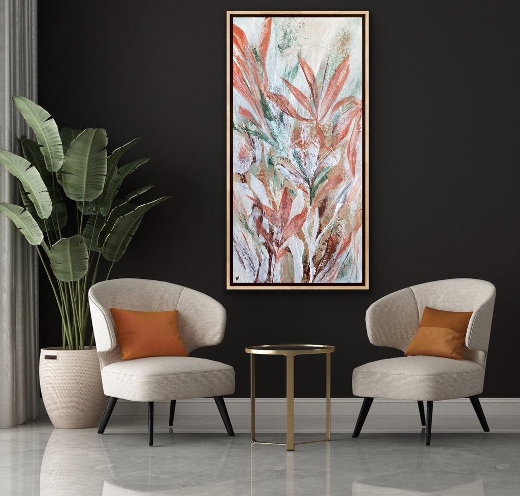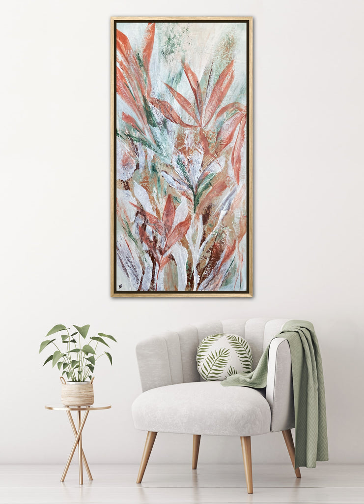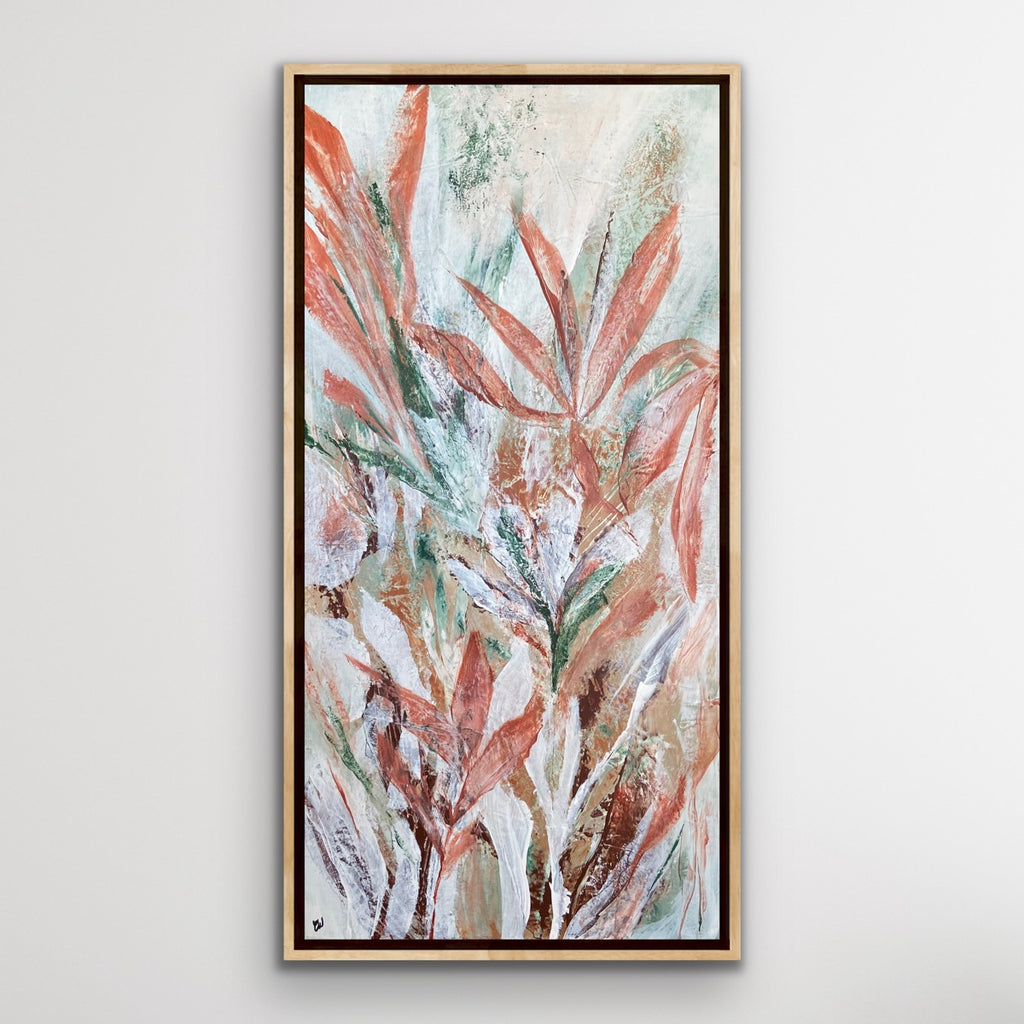 Tropical Retreat is a textured, beautiful abstract botanical painting. 101.6 x 50.8 cm. Acrylic on canvas, ready to hang. Frame is not included. No returns on original artworks so please choose carefully.