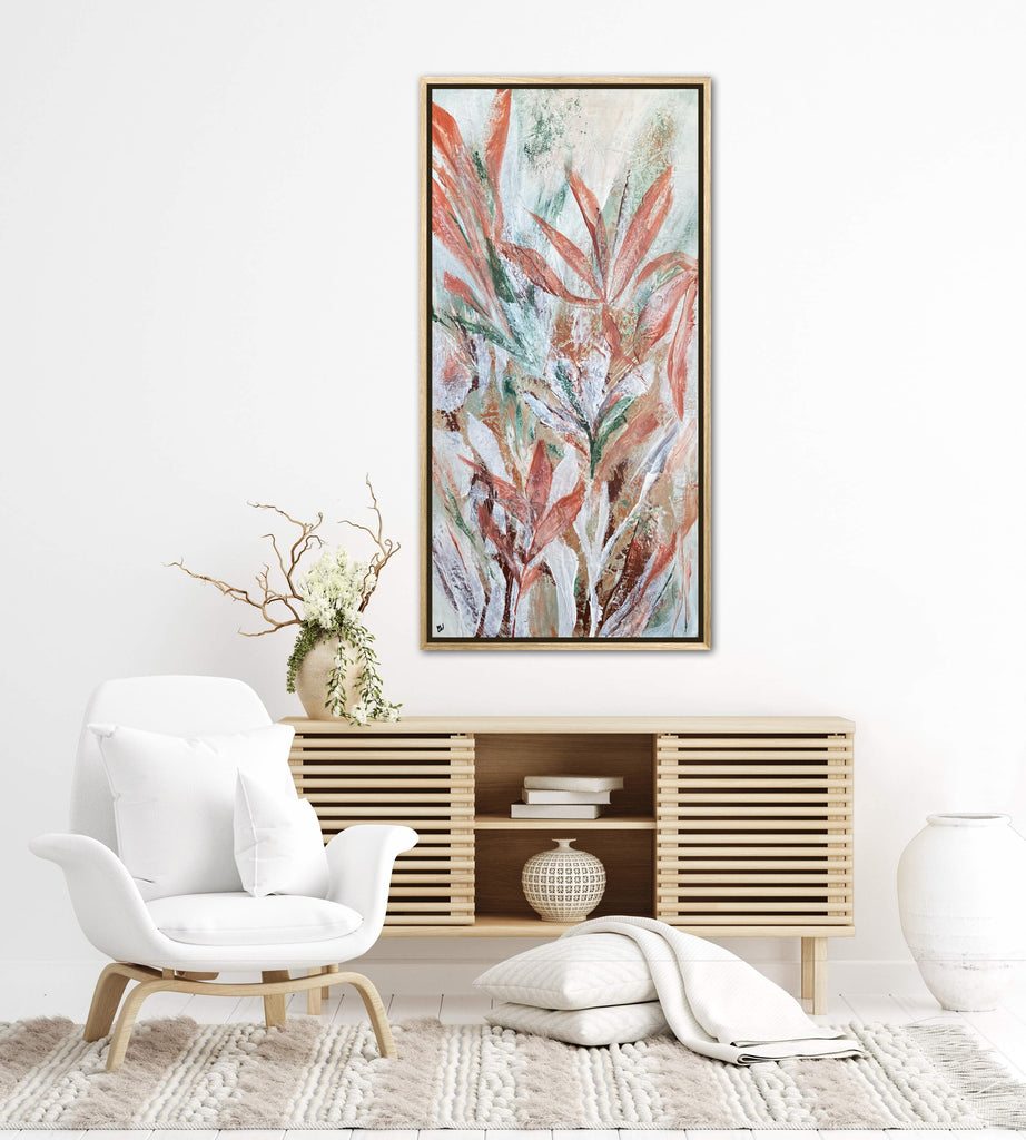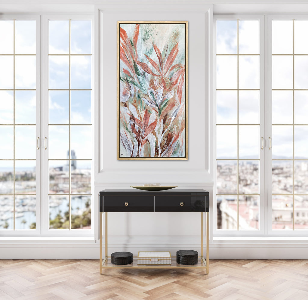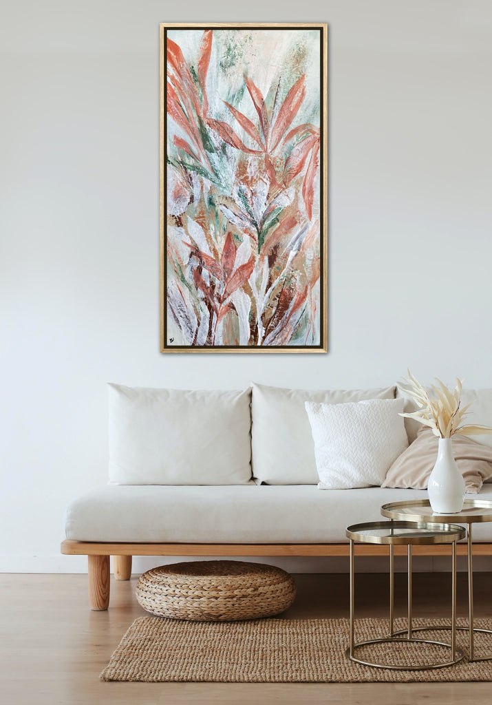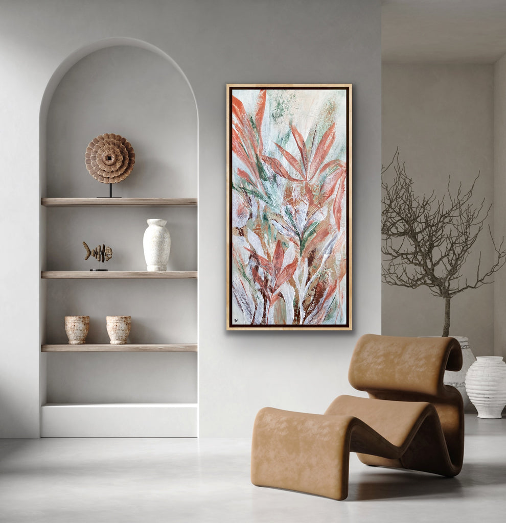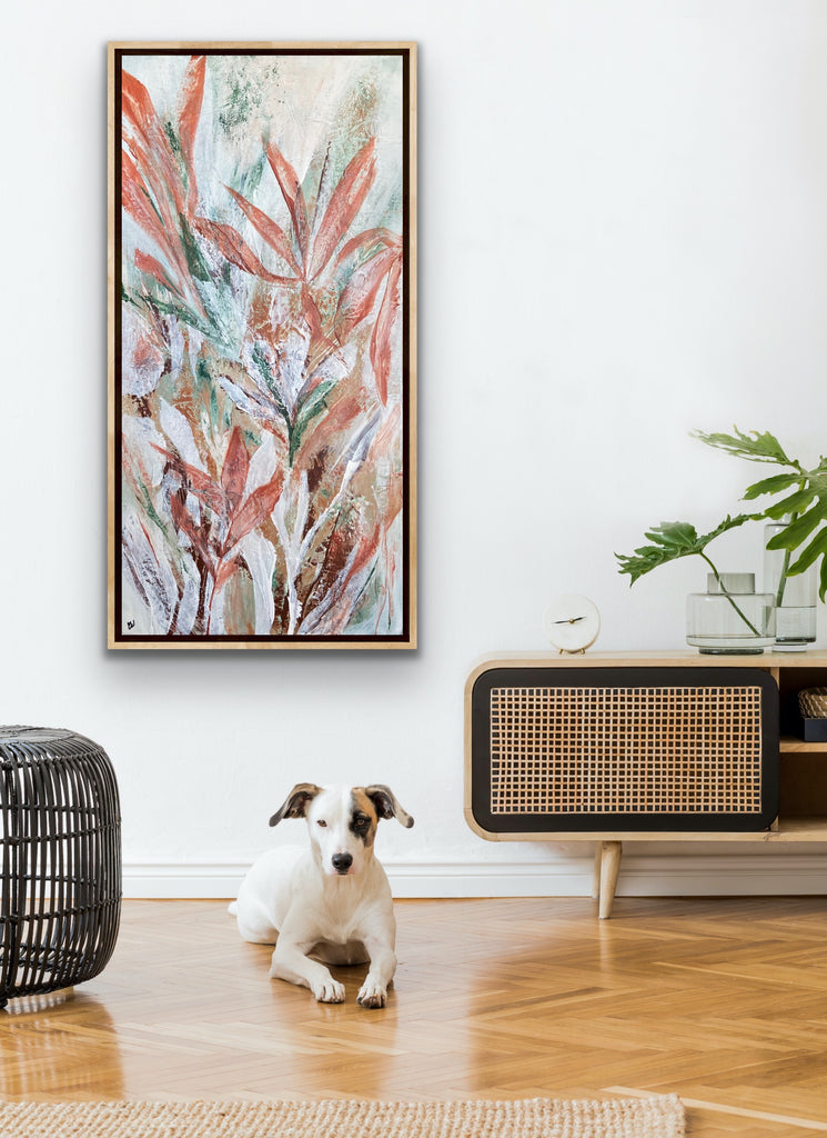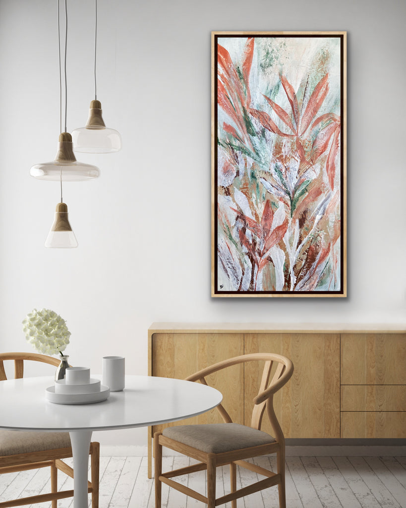Tropical Retreat is a textured, beautiful abstract botanical painting. 101.6 x 50.8 cm. Acrylic on canvas, ready to hang. Frame is not included. No returns on original artworks so please choose carefully.