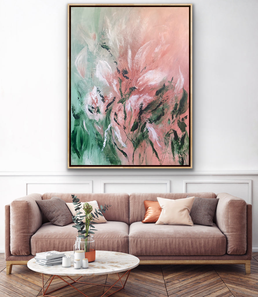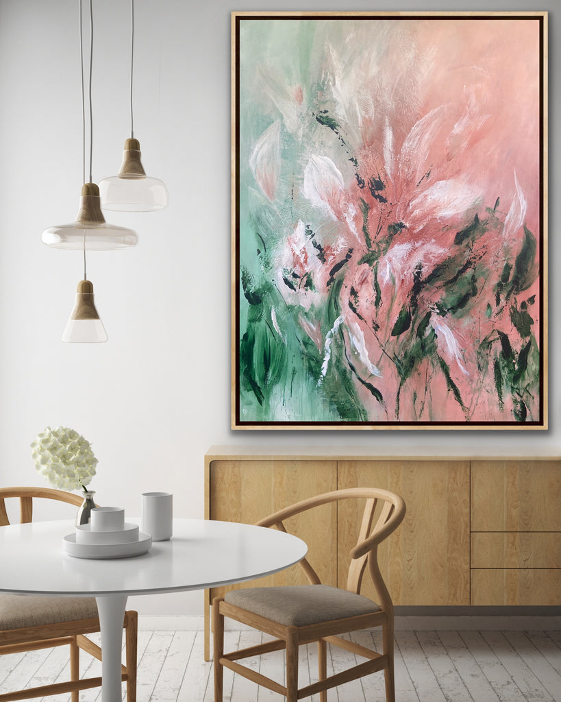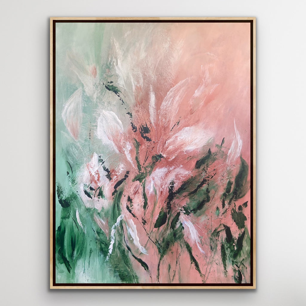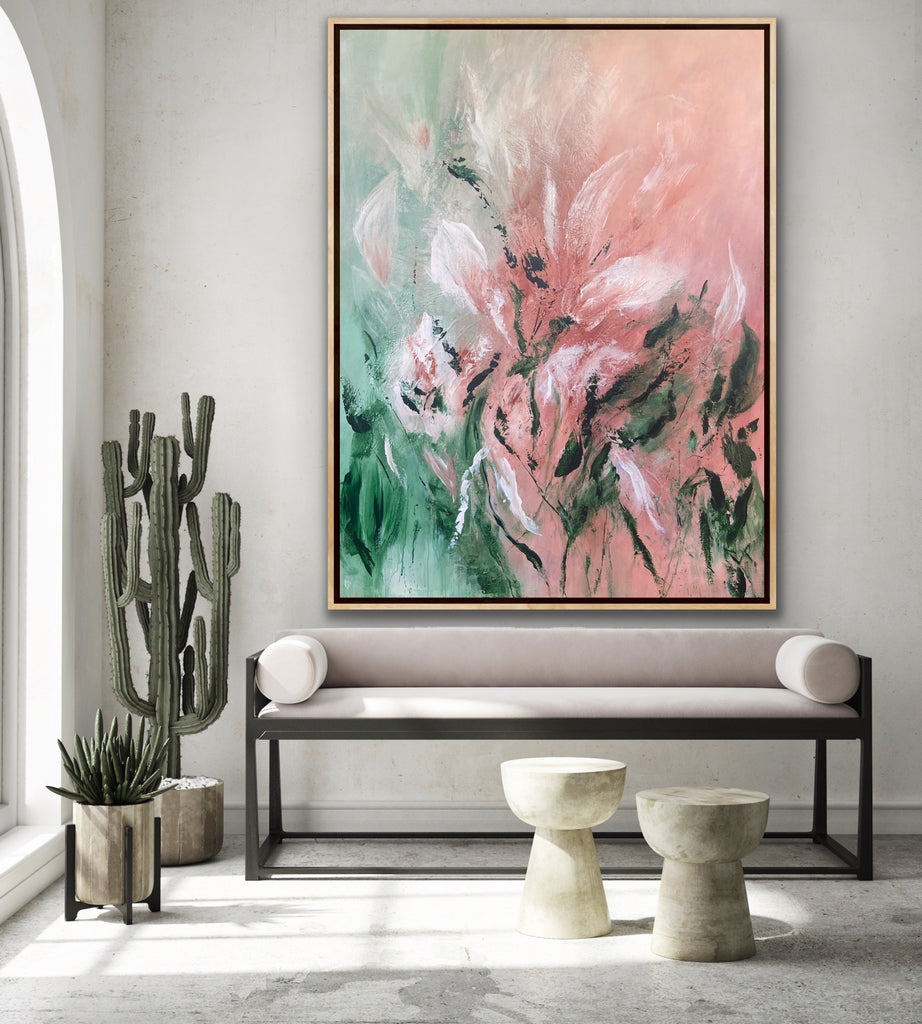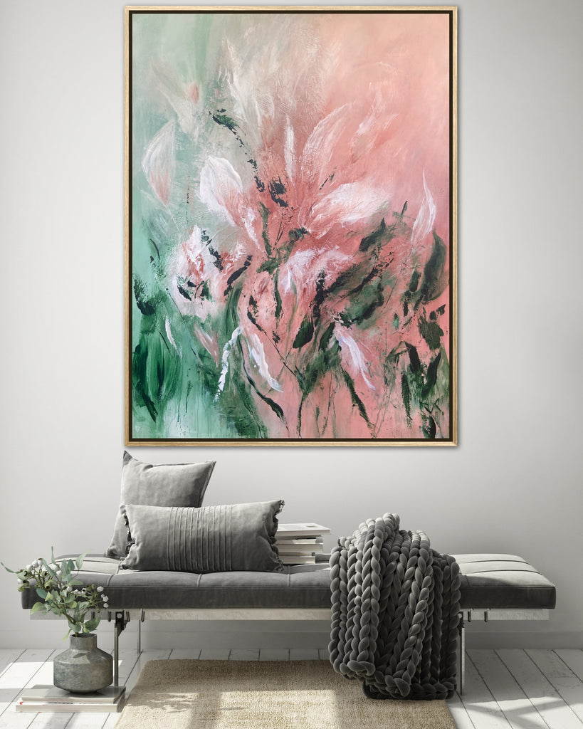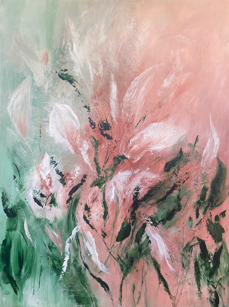 Velvet Petals is a beautifully textured abstract botanical painting. 91.4 x 121.9 cm. Acrylic on canvas, ready to hang. Frame not included. No returns on original artworks so please choose carefully.