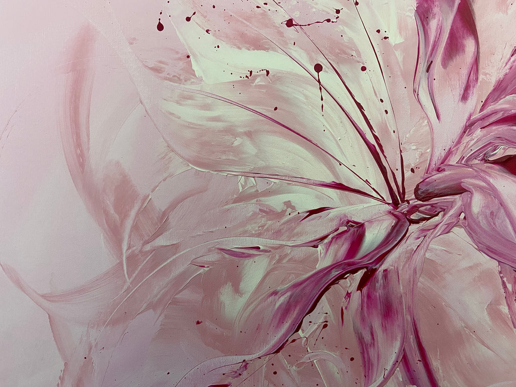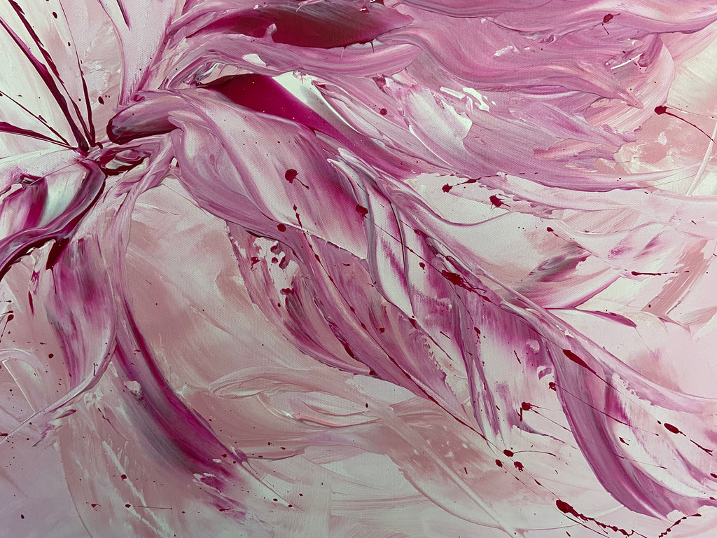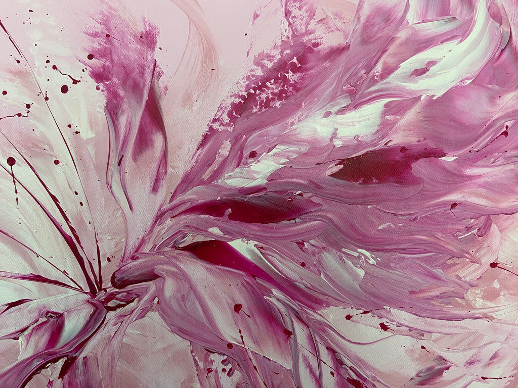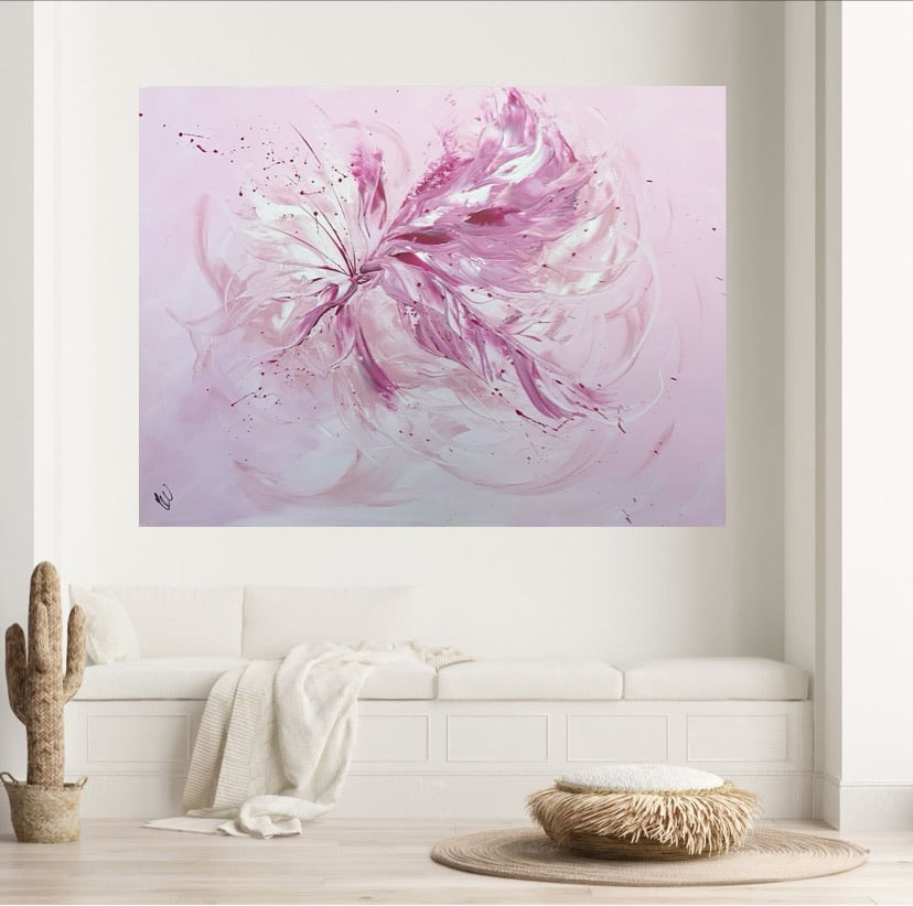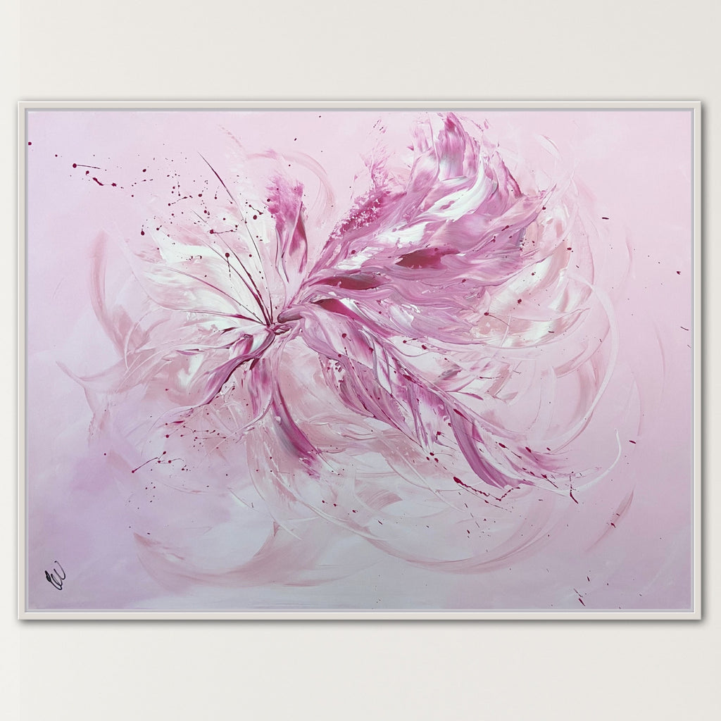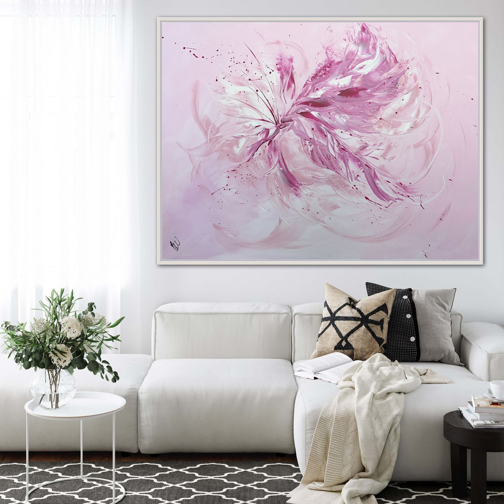 Whimsical by Carrie Welsh -  A light, pretty blush abstract piece that will definitely brighten any room in your home or office. Acrylic on canvas. Ready to hang. 91.4 x 121.9 x 2cm.  Some images show what this painting will look like framed. Frames not included. No returns on original artworks so please choose carefully.
