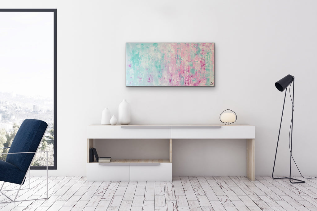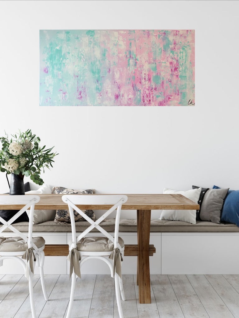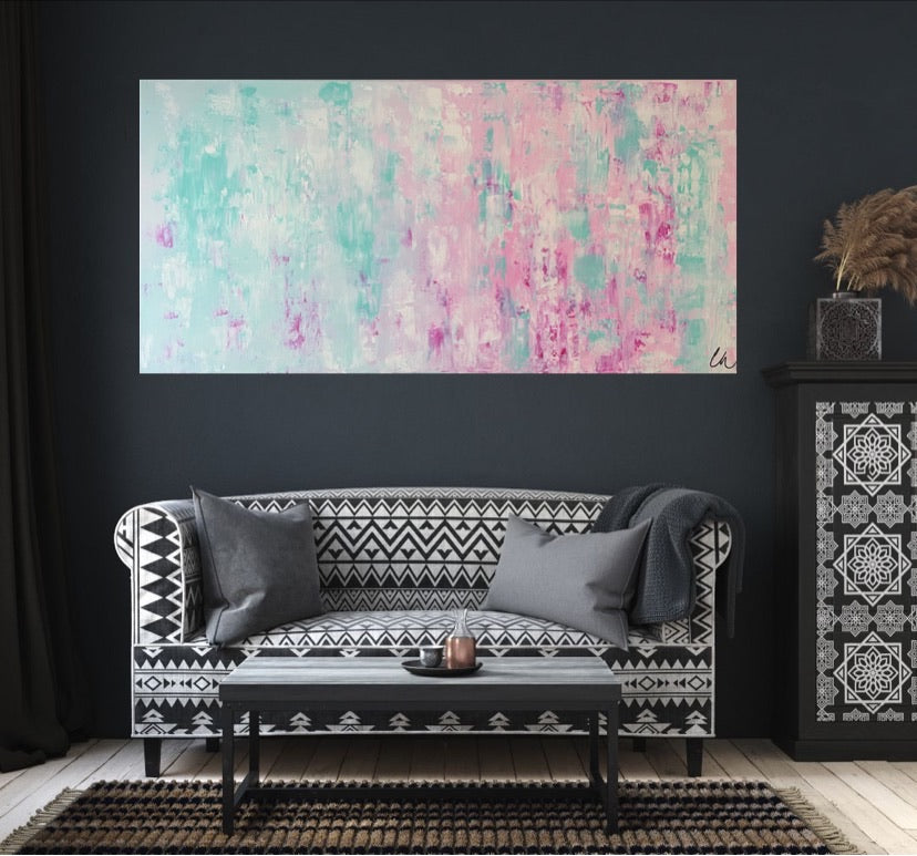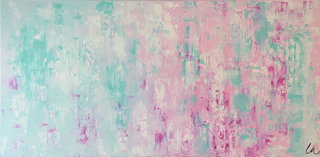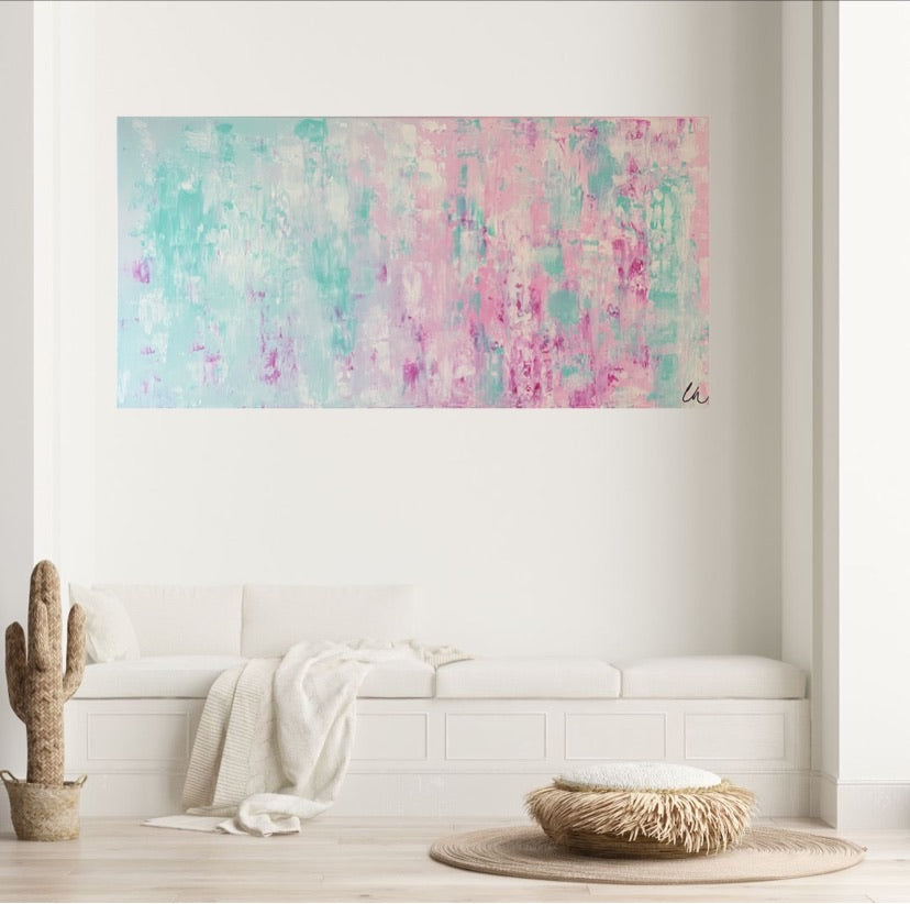 Whispered is an textured abstract piece with beautiful soft pastel colours, pinks aquas and white. This would look great in any space. 101.6 x 50.8 x 2 cm. Acrylic on canvas, ready to hang. No returns on original artworks so please choose carefully.