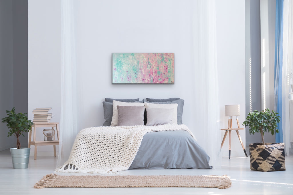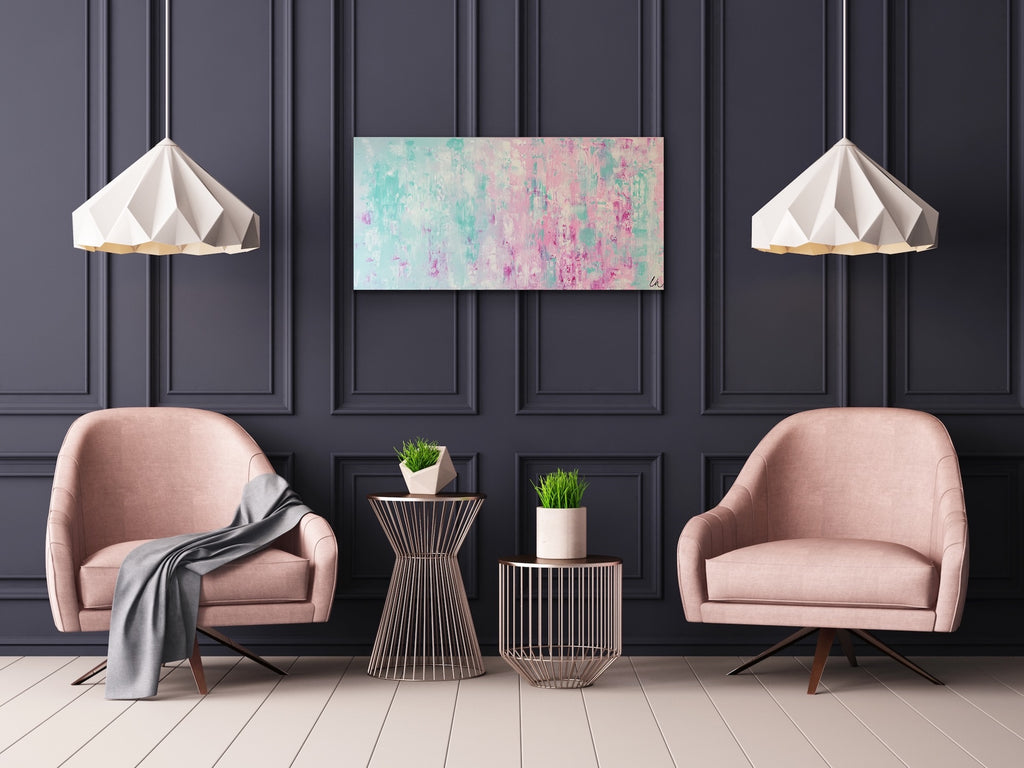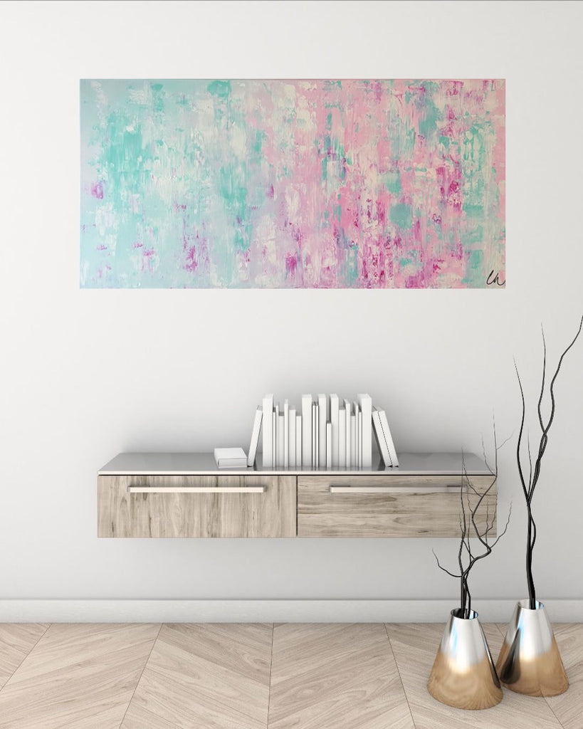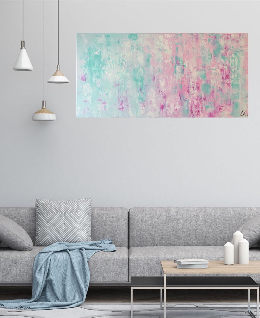 Whispered is an textured abstract piece with beautiful soft pastel colours, pinks aquas and white. This would look great in any space. 101.6 x 50.8 x 2 cm. Acrylic on canvas, ready to hang. No returns on original artworks so please choose carefully.