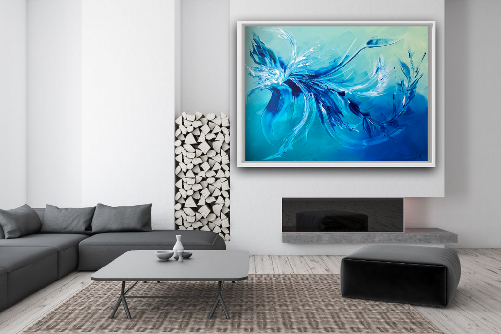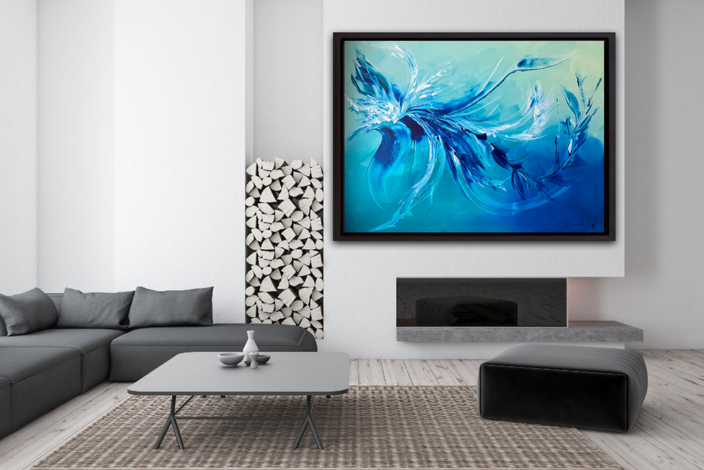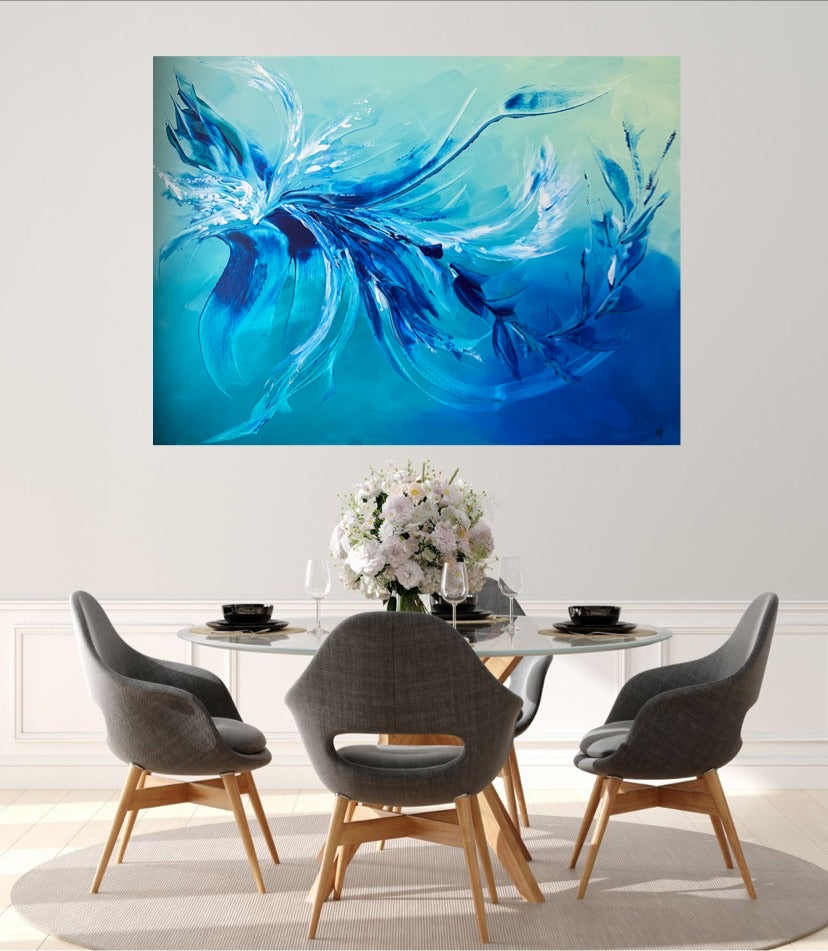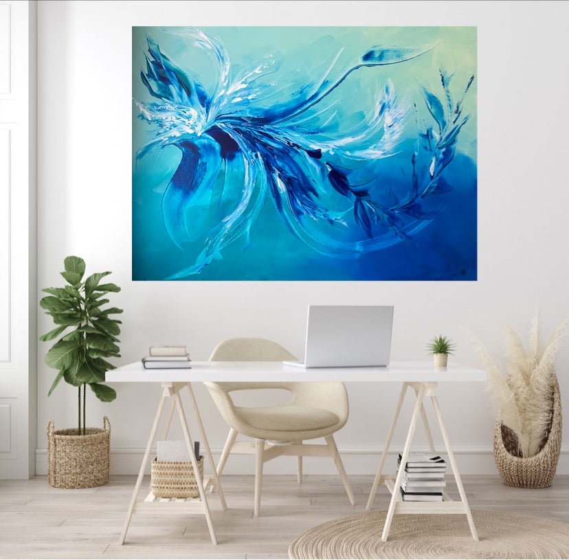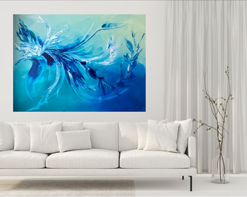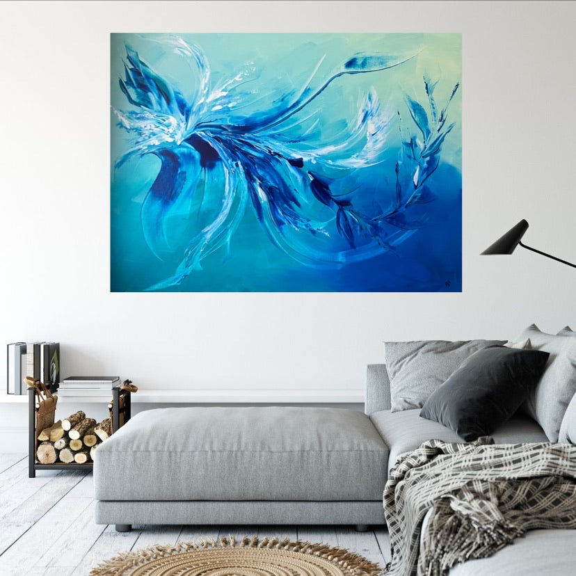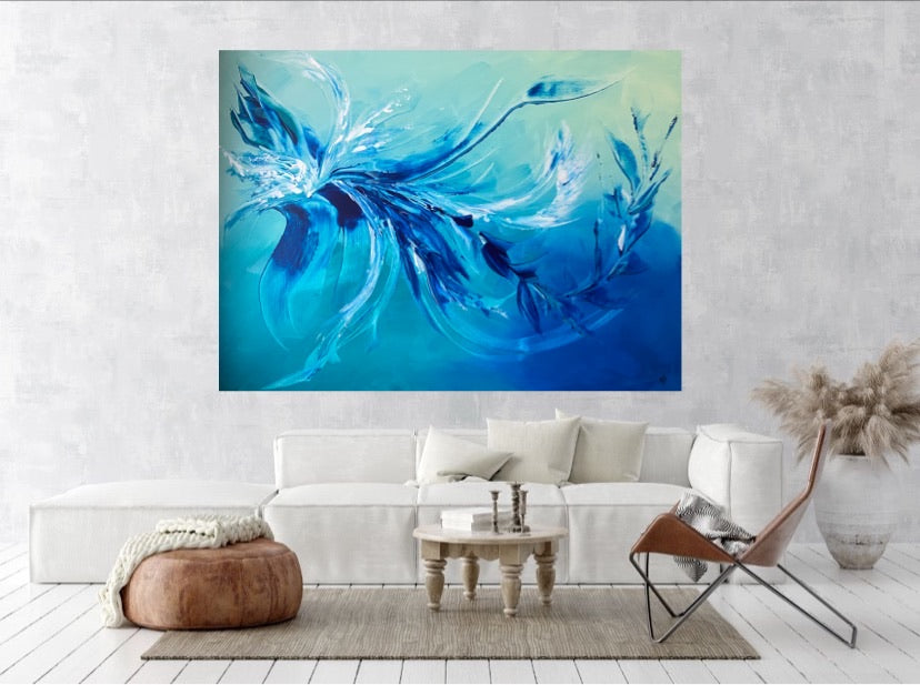 Wild At Sea is a breathtaking and beautiful piece with a free feeling to it. Movement and deep colours make this a stunning piece to liven up any room. 121.9 x 91.4 x 2cm. Acrylic on canvas, ready to hang. Some images show what this painting will look like framed. Frames not included. No returns on original artworks so please choose carefully.