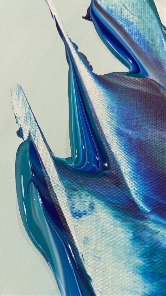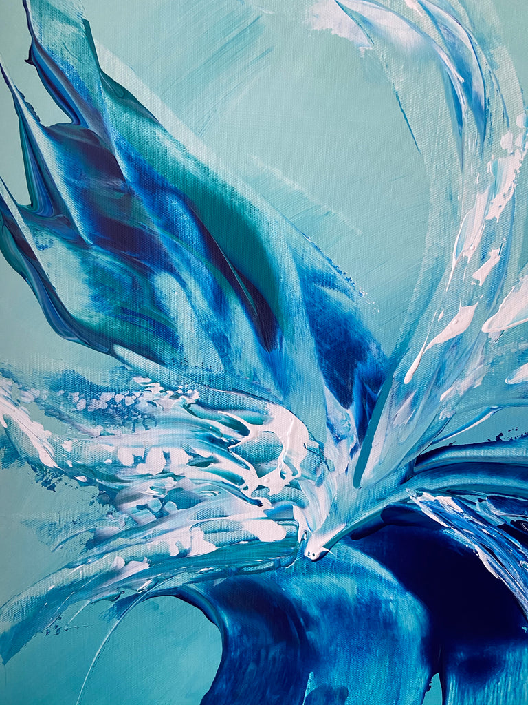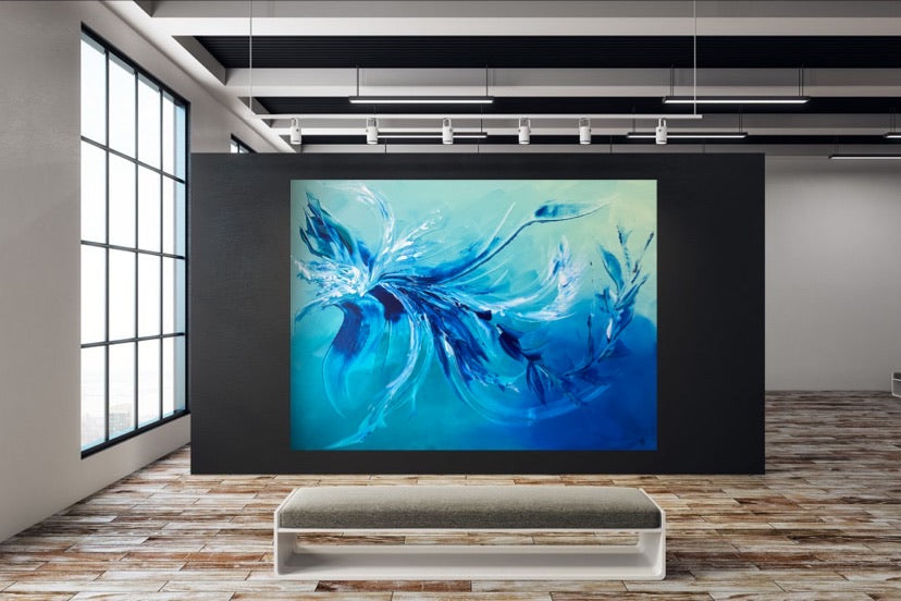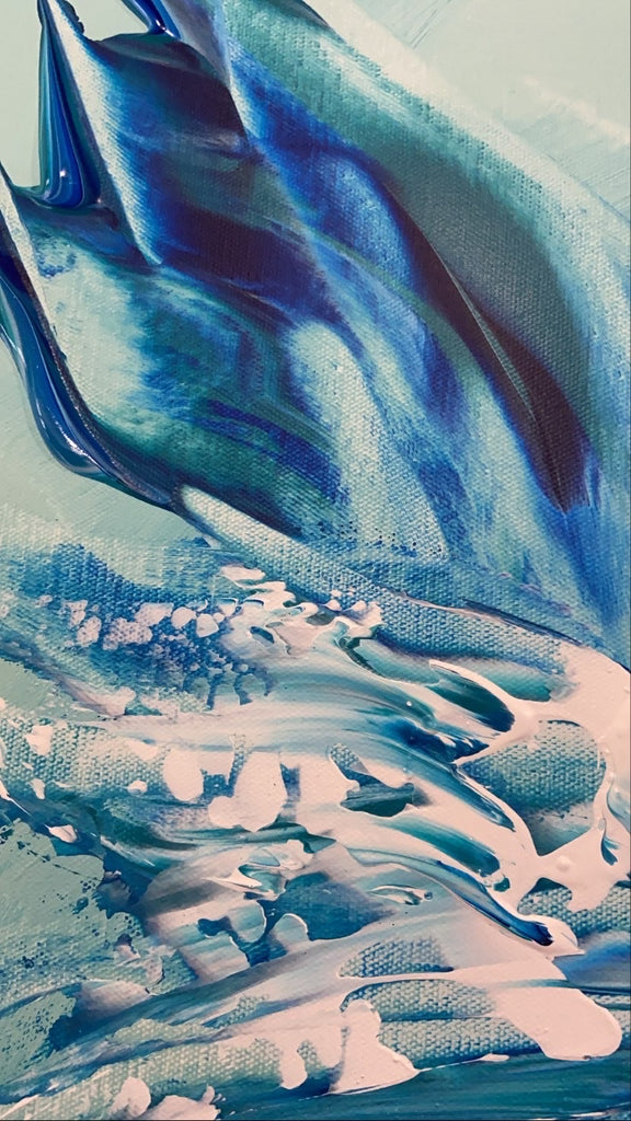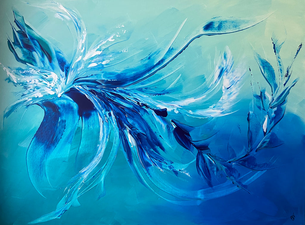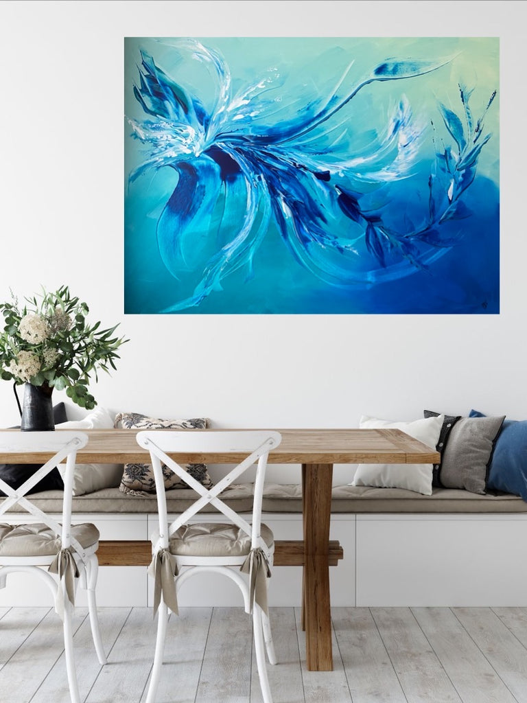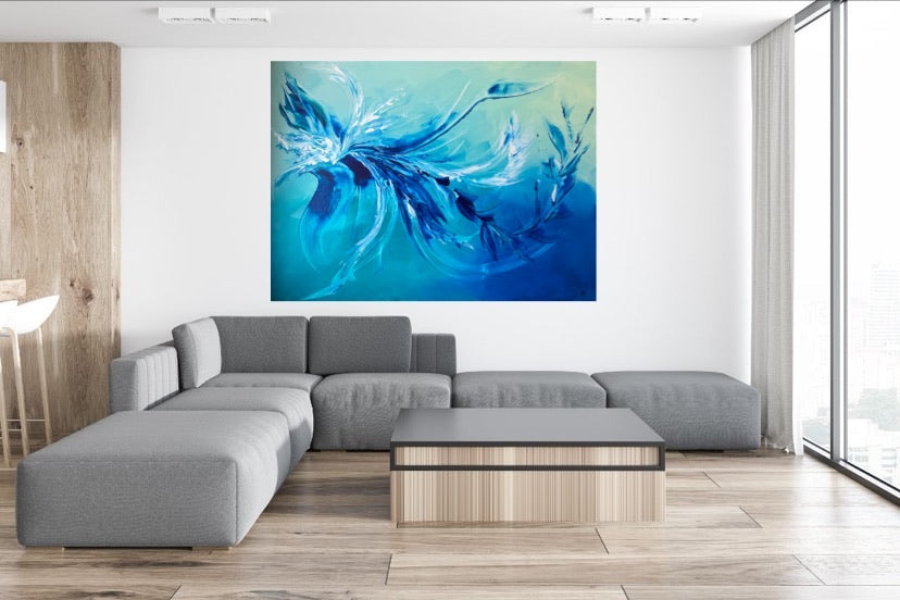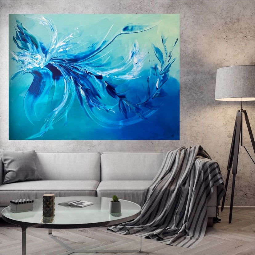 Wild At Sea is a breathtaking and beautiful piece with a free feeling to it. Movement and deep colours make this a stunning piece to liven up any room. 121.9 x 91.4 x 2cm. Acrylic on canvas, ready to hang. Some images show what this painting will look like framed. Frames not included. No returns on original artworks so please choose carefully.