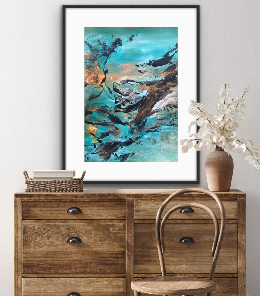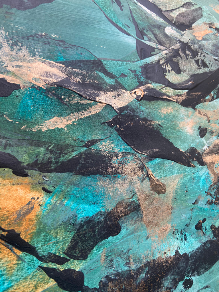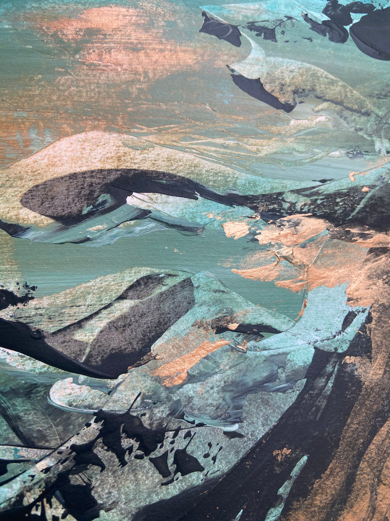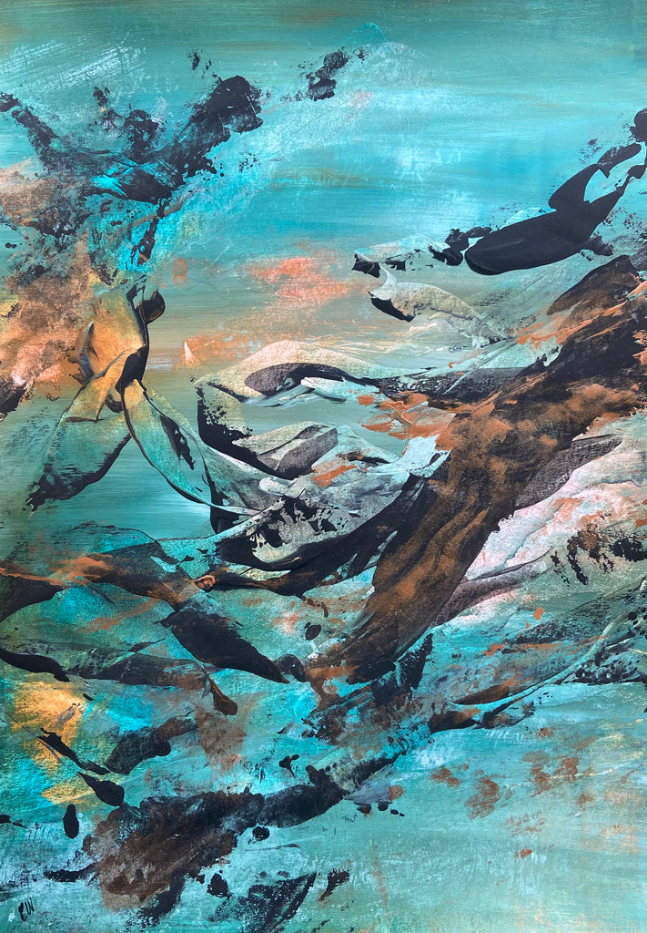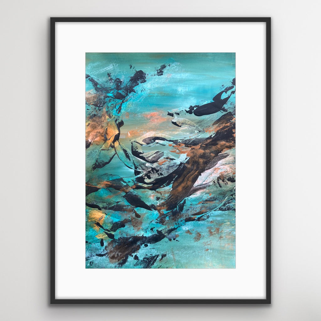 Cathartic is a beautiful abstract painting full of captured movement. It has stunning metallic accents that shimmer in the light. 59.4 x 42 cm (A2 size) Acrylic on paper. Frame not included . Requires framing. No returns on original artworks so please choose carefully.