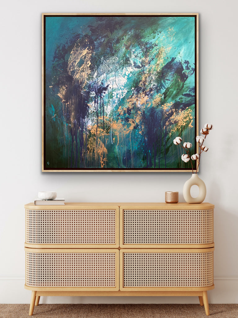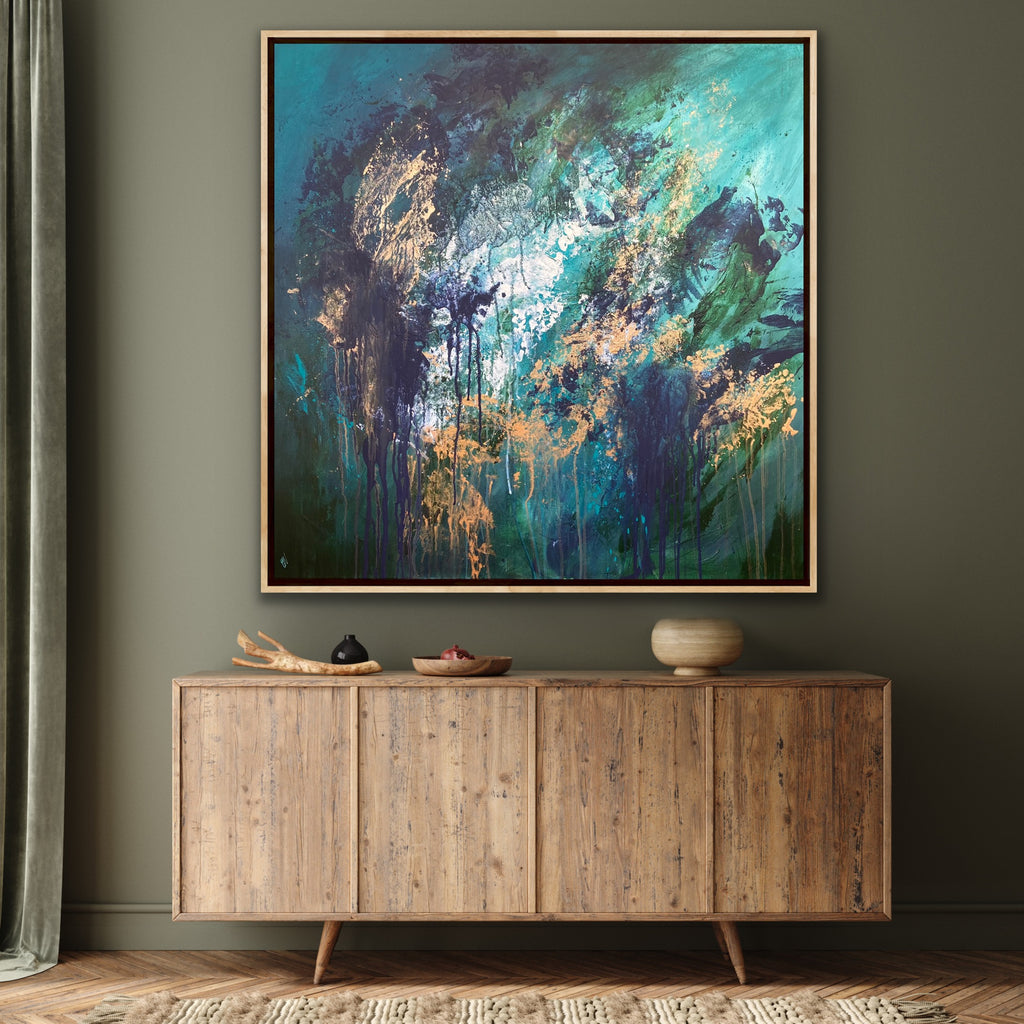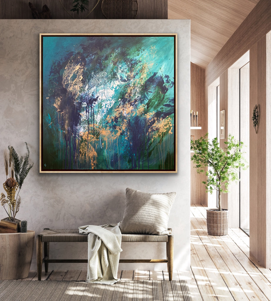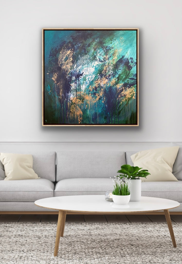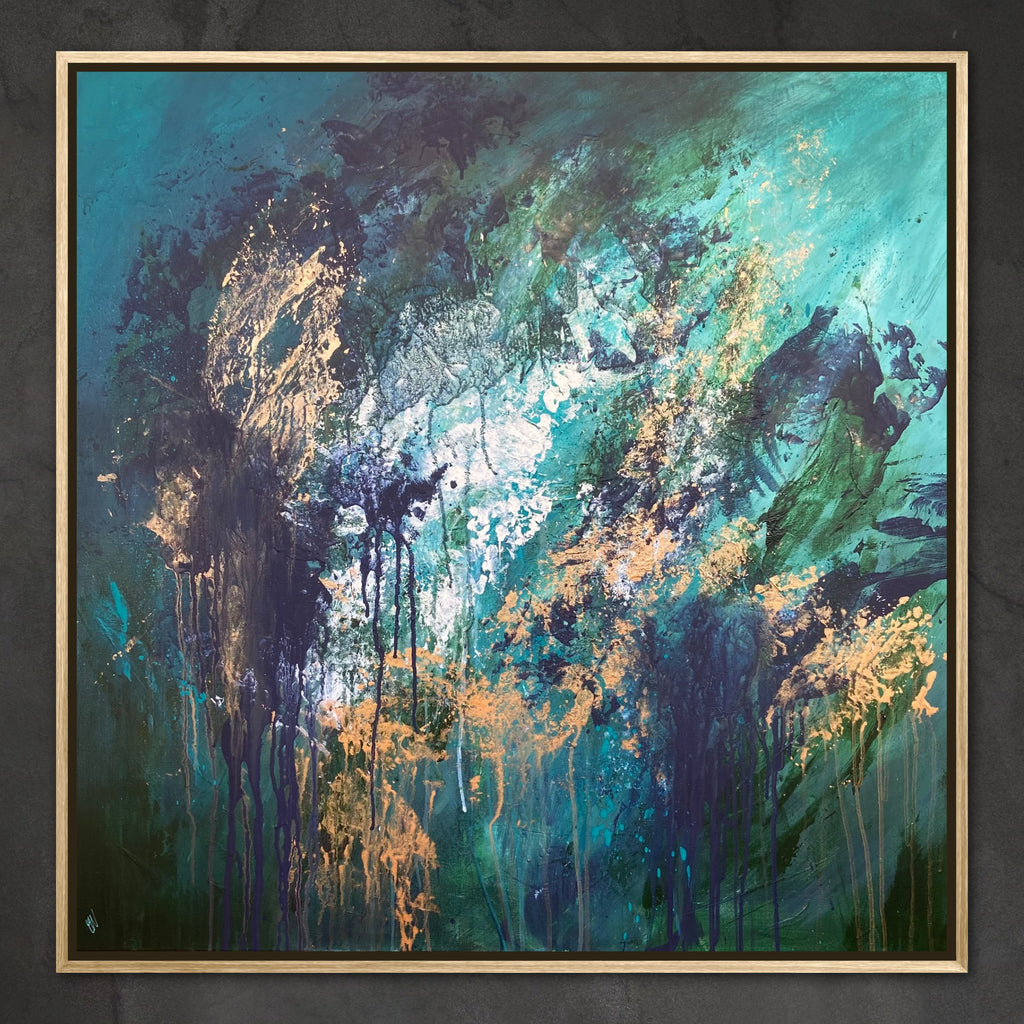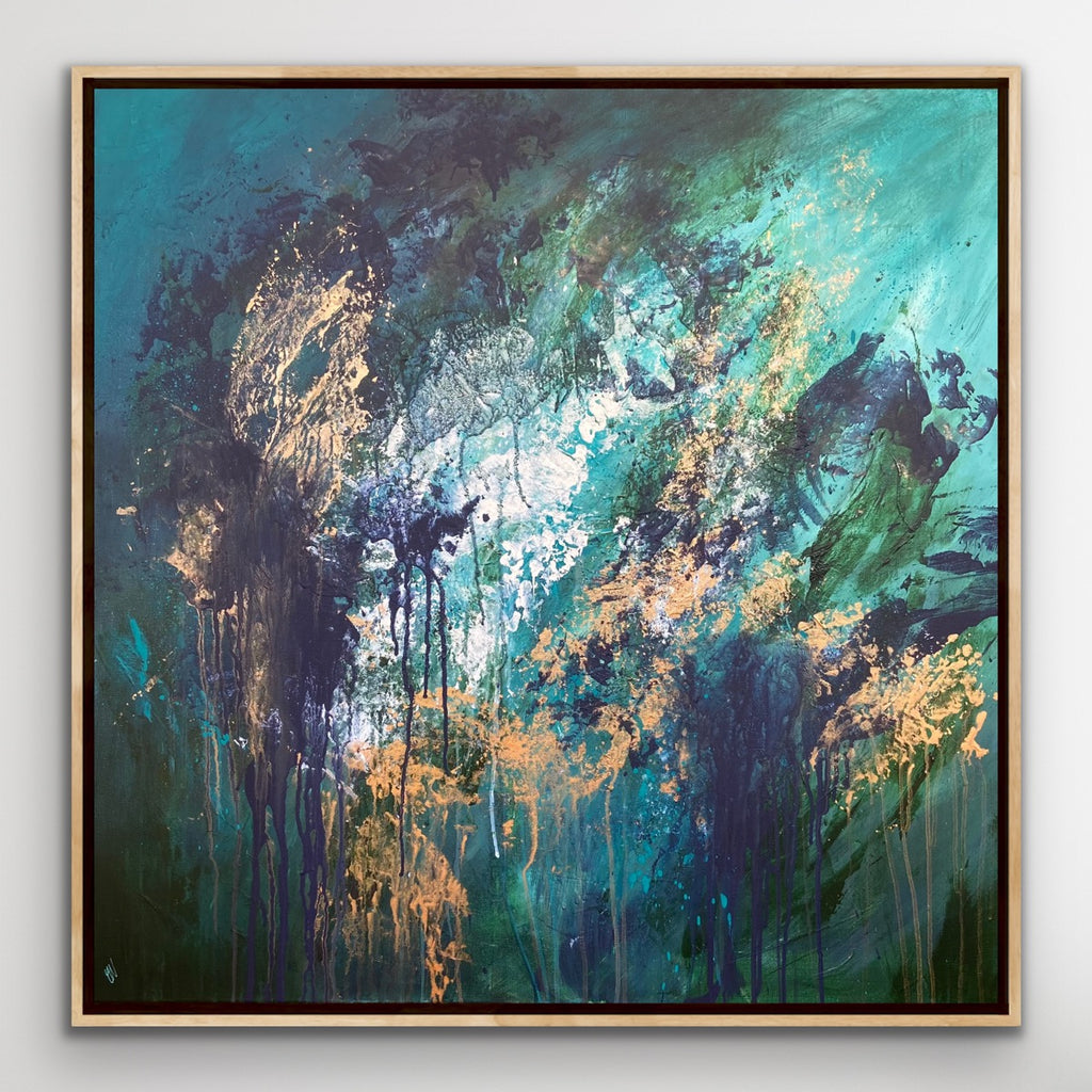Deep Down is a beautifully textured abstract piece with striking blues, greens and shimmering metallics. 91.4 x 91.4 x 2 cm. Acrylic on canvas, ready to hang. Frame not included. No returns on original artworks so please choose carefully.