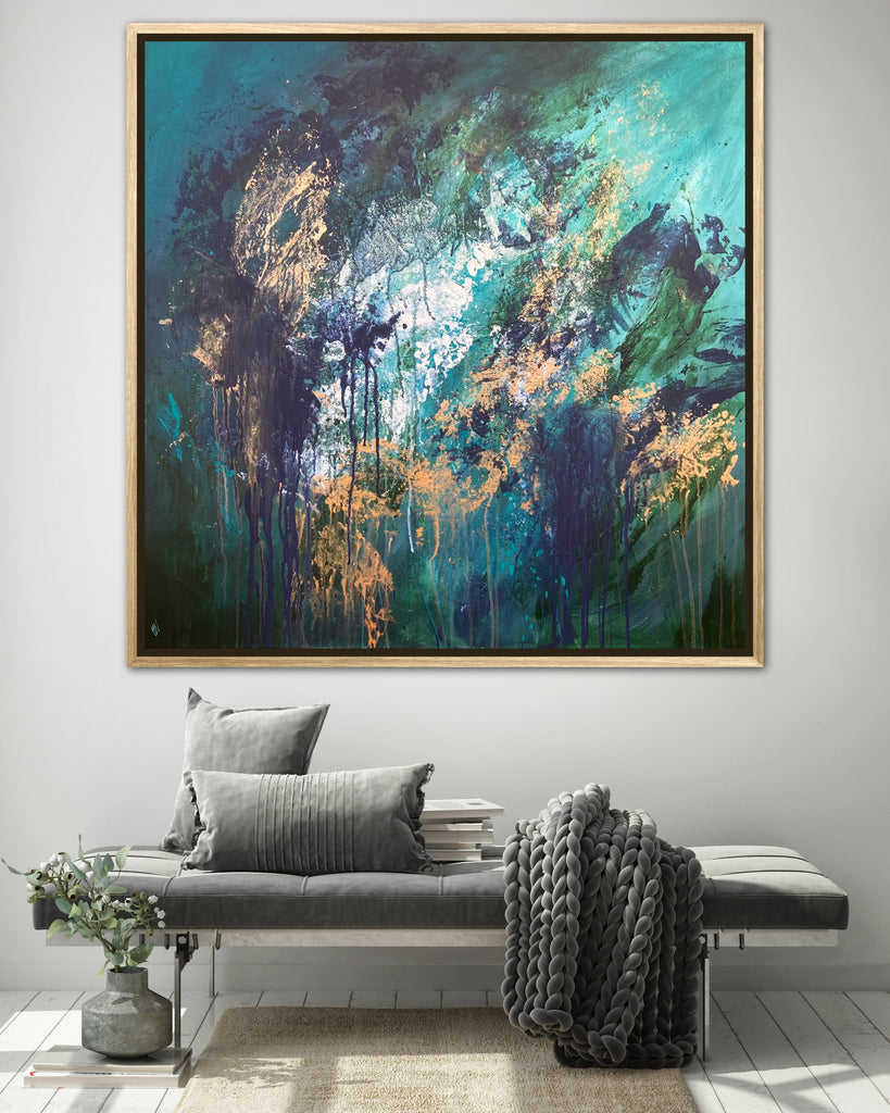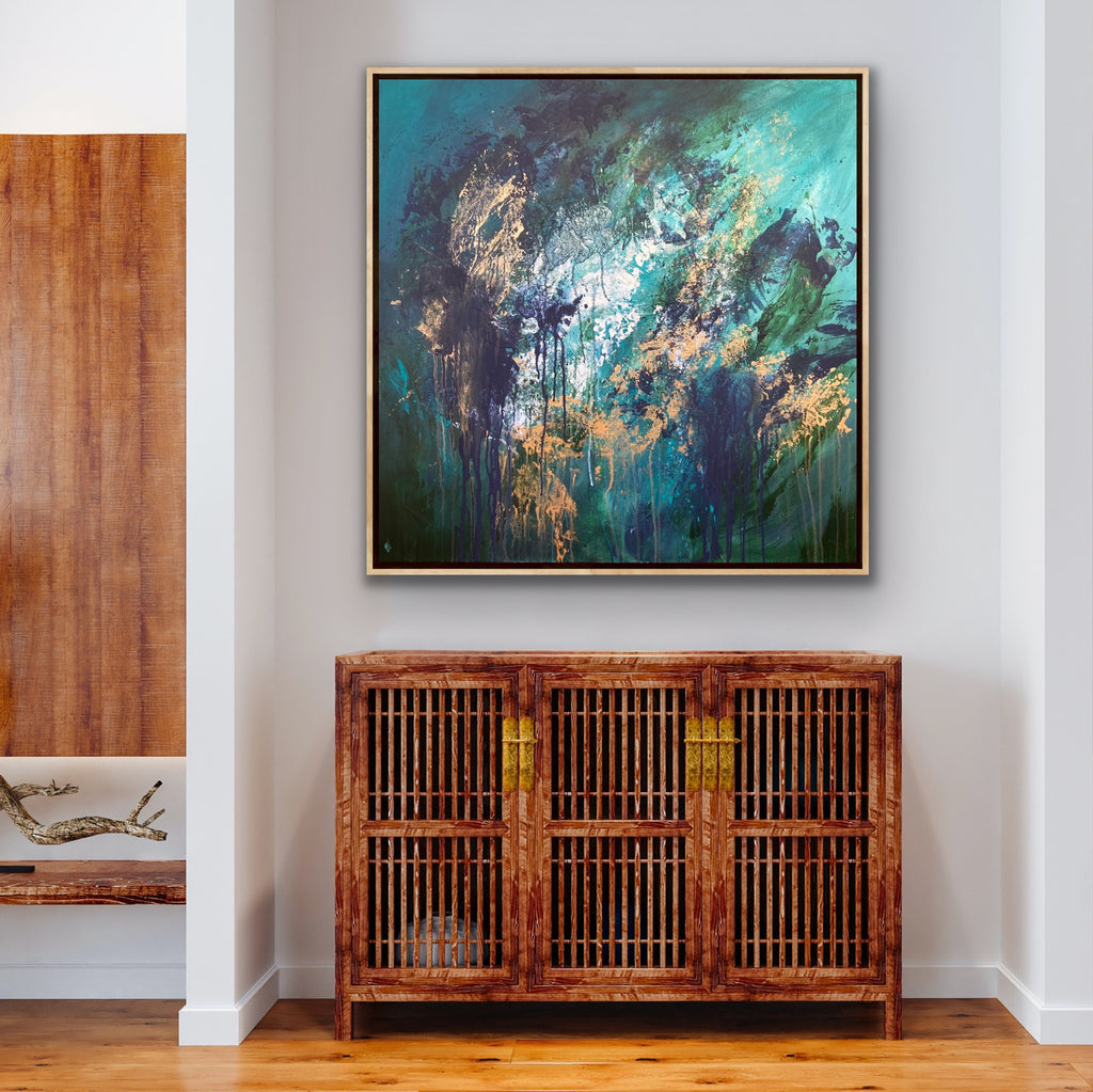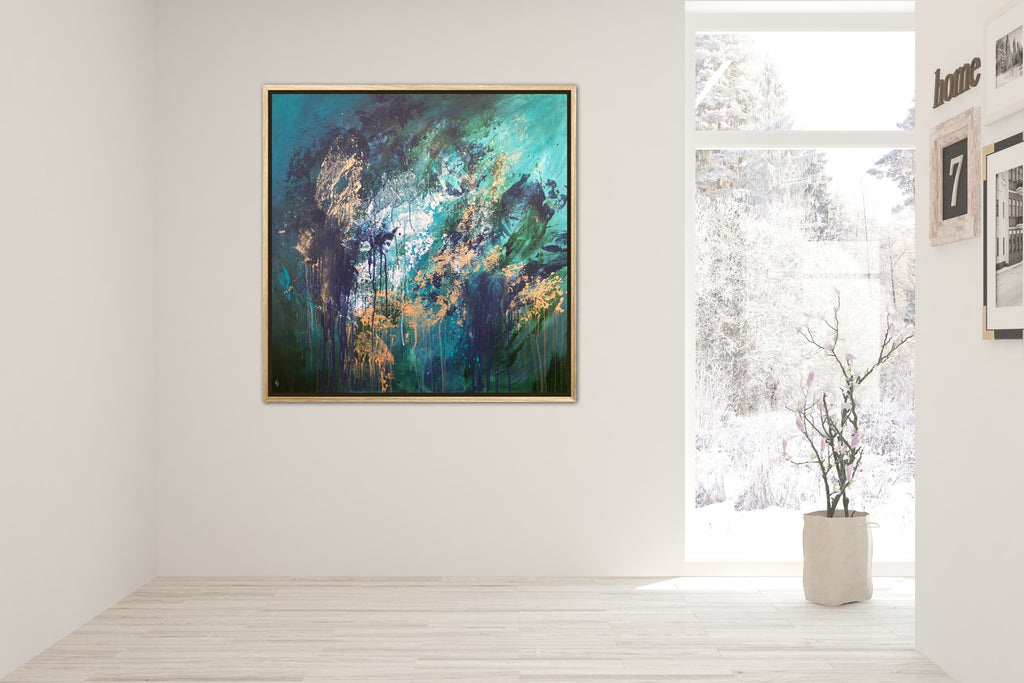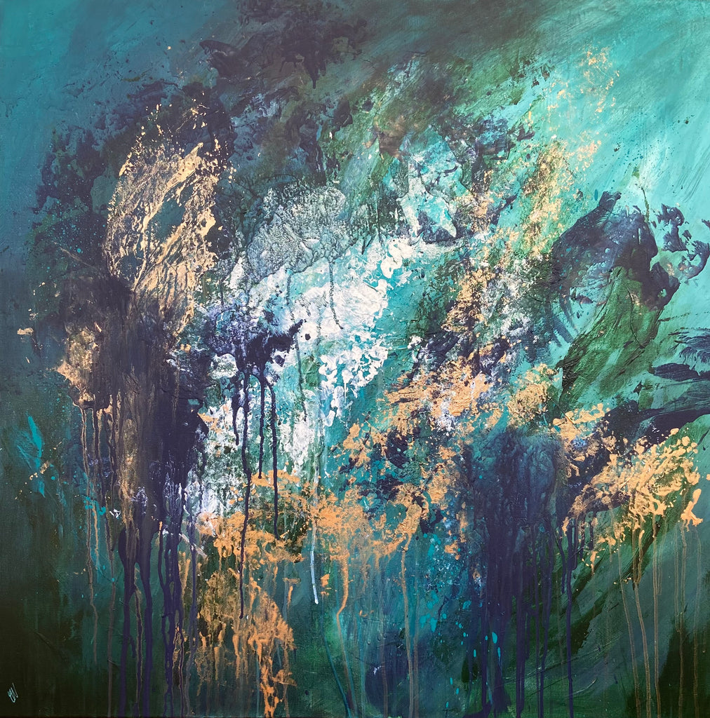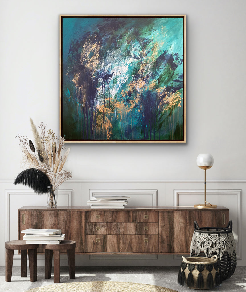 Deep Down is a beautifully textured abstract piece with striking blues, greens and shimmering metallics. 91.4 x 91.4 x 2 cm. Acrylic on canvas, ready to hang. Frame not included. No returns on original artworks so please choose carefully.