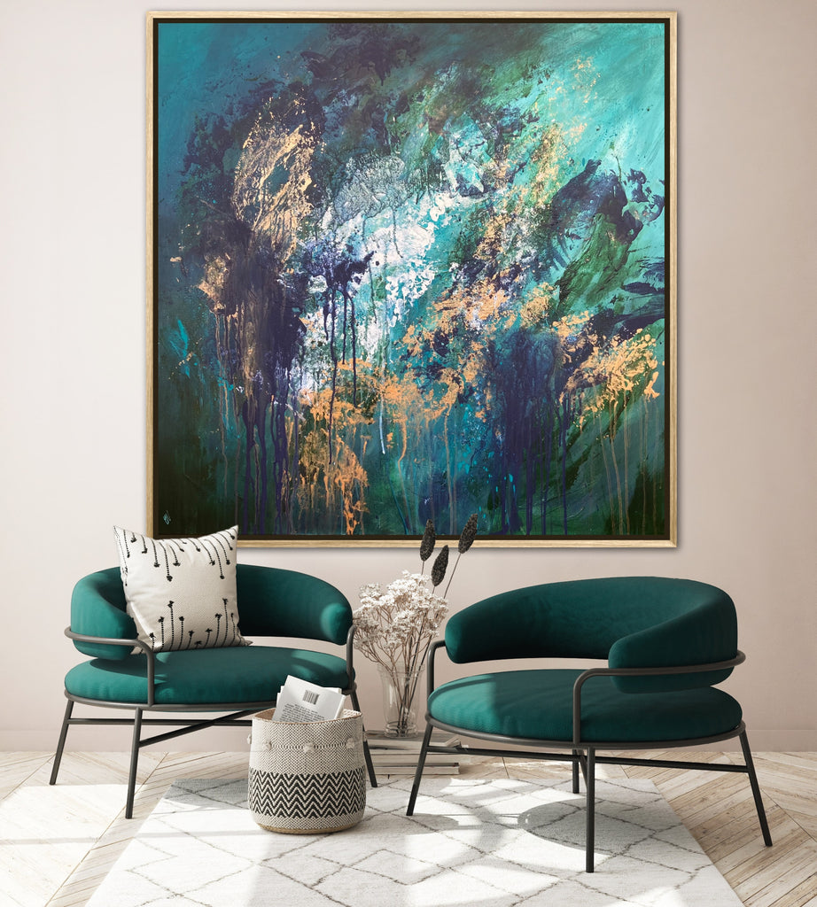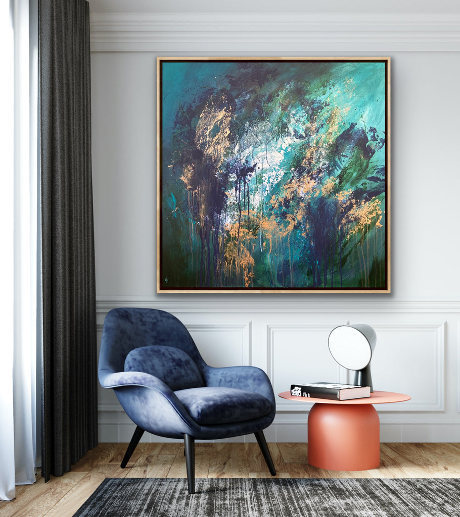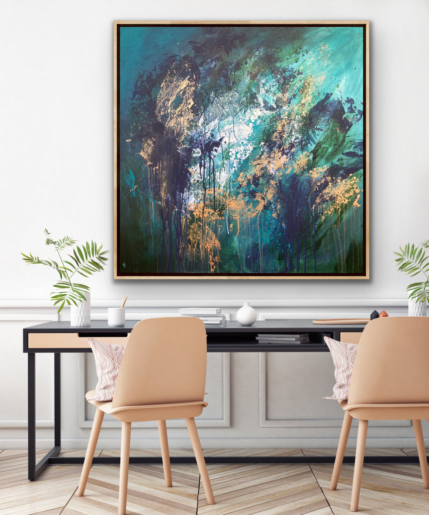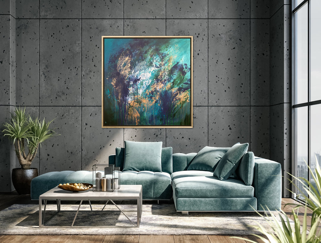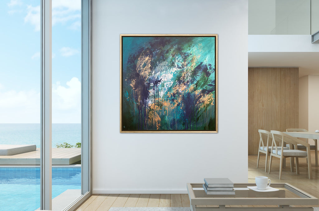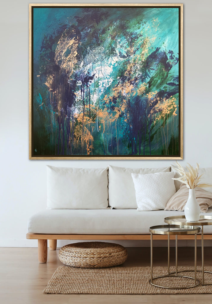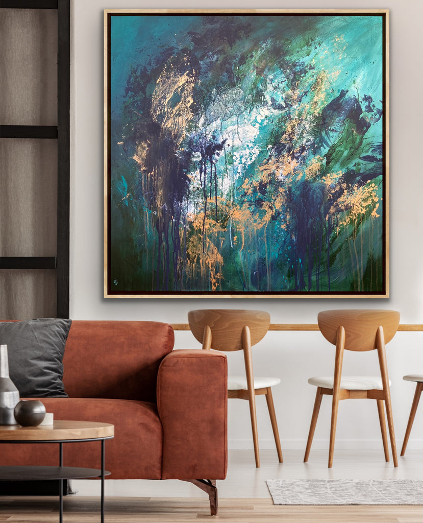 Deep Down is a beautifully textured abstract piece with striking blues, greens and shimmering metallics. 91.4 x 91.4 x 2 cm. Acrylic on canvas, ready to hang. Frame not included. No returns on original artworks so please choose carefully.