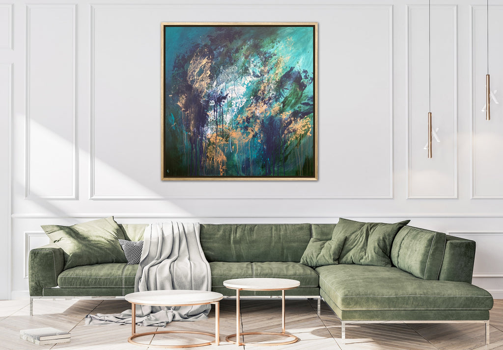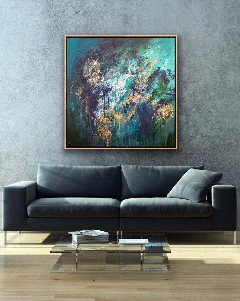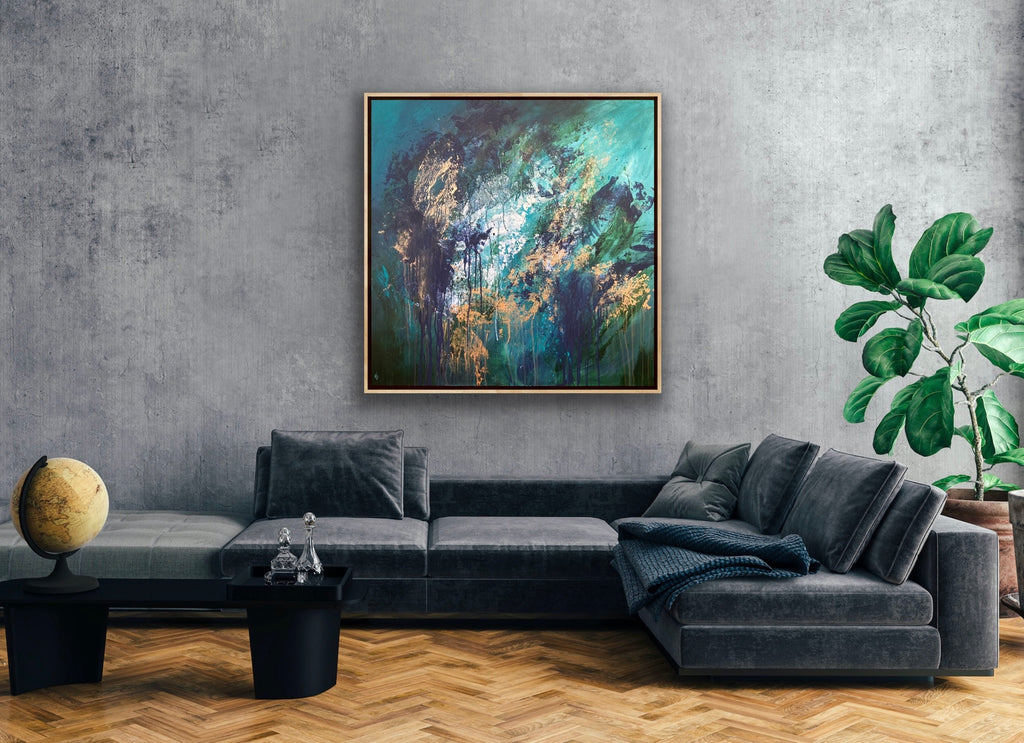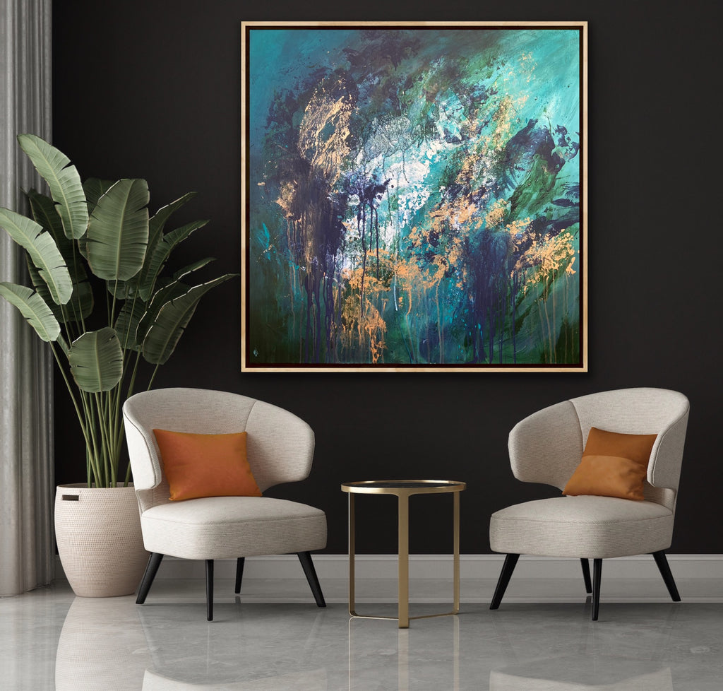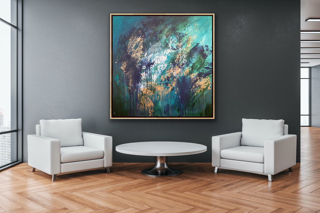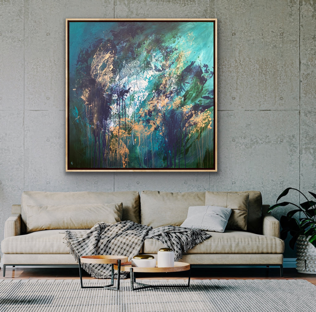 Deep Down is a beautifully textured abstract piece with striking blues, greens and shimmering metallics. 91.4 x 91.4 x 2 cm. Acrylic on canvas, ready to hang. Frame not included. No returns on original artworks so please choose carefully.