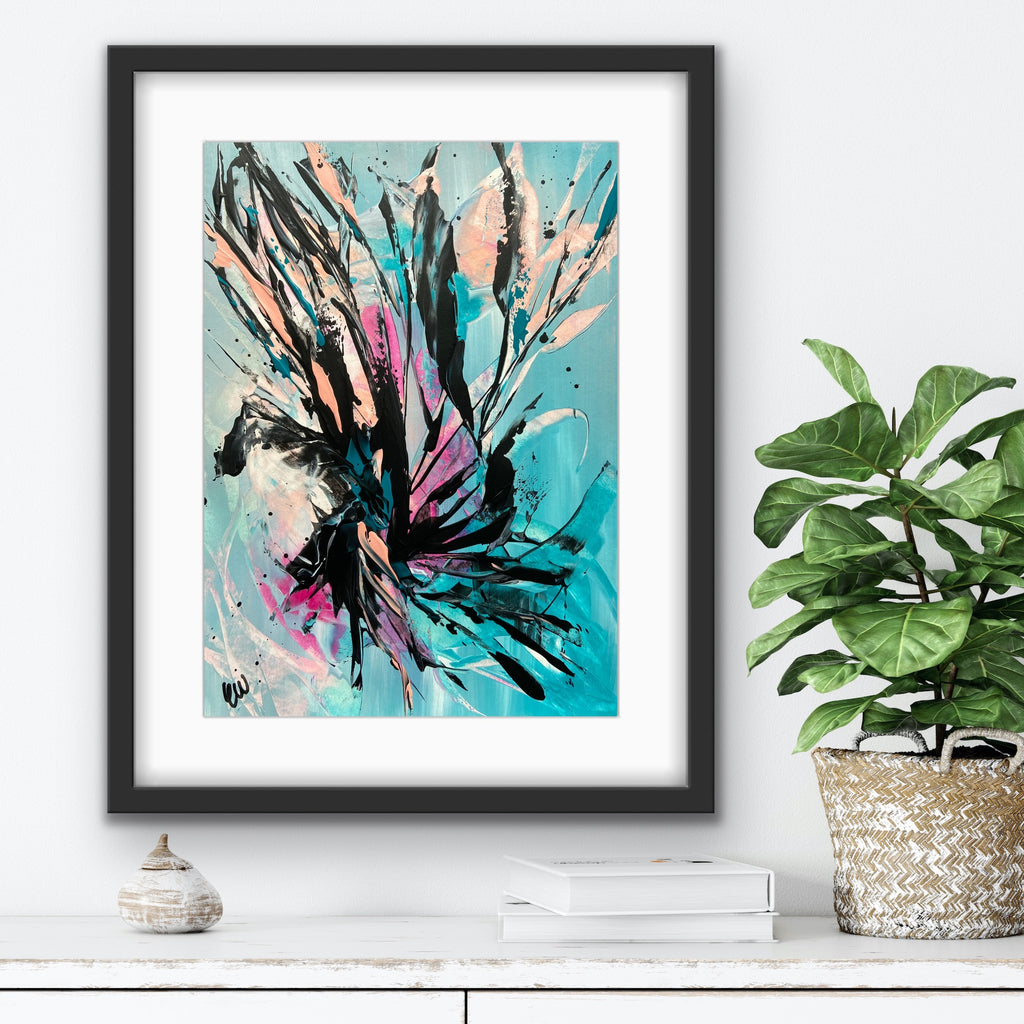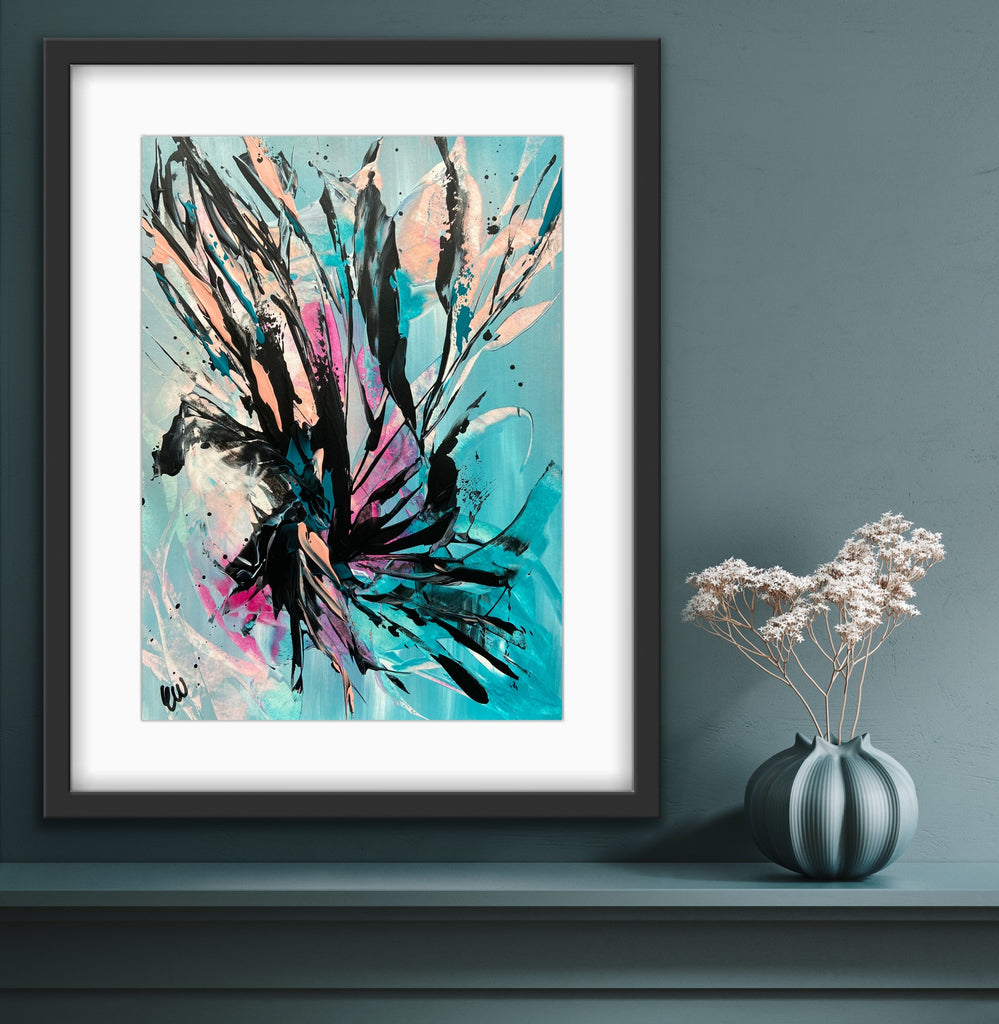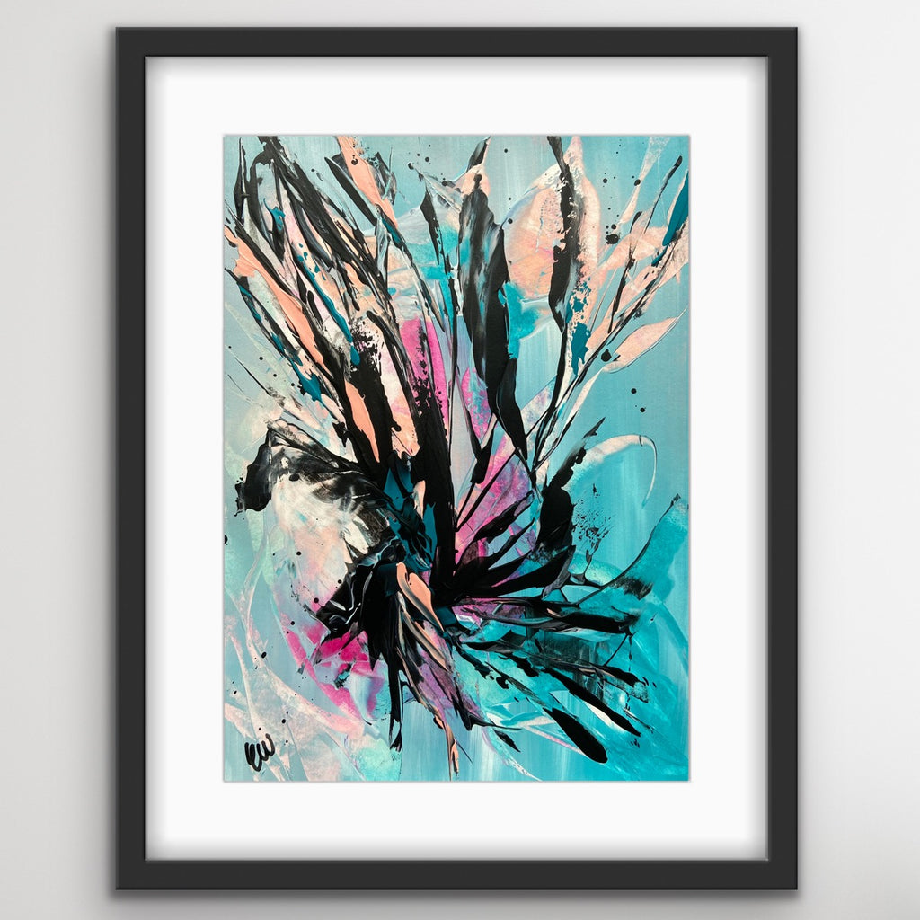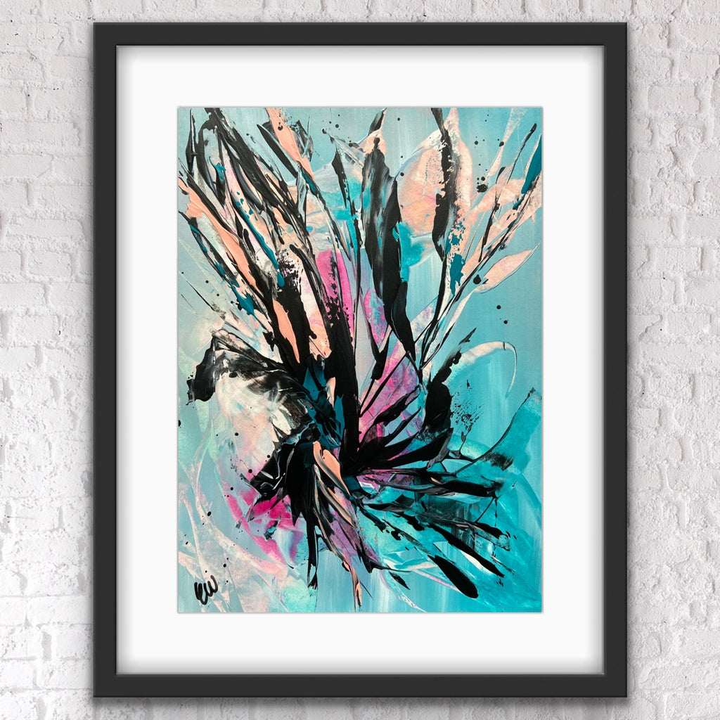 Elated is a very pretty abstract piece that is bursting with joy! Some images show what this piece looks like framed. Frames not included. 29.7 x 42 cm (A3 size) Acrylic on paper. Requires framing. No returns on original artworks so please choose carefully.