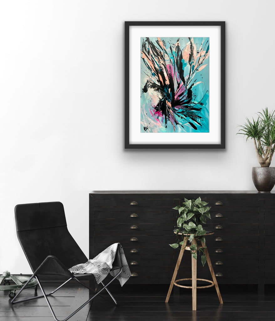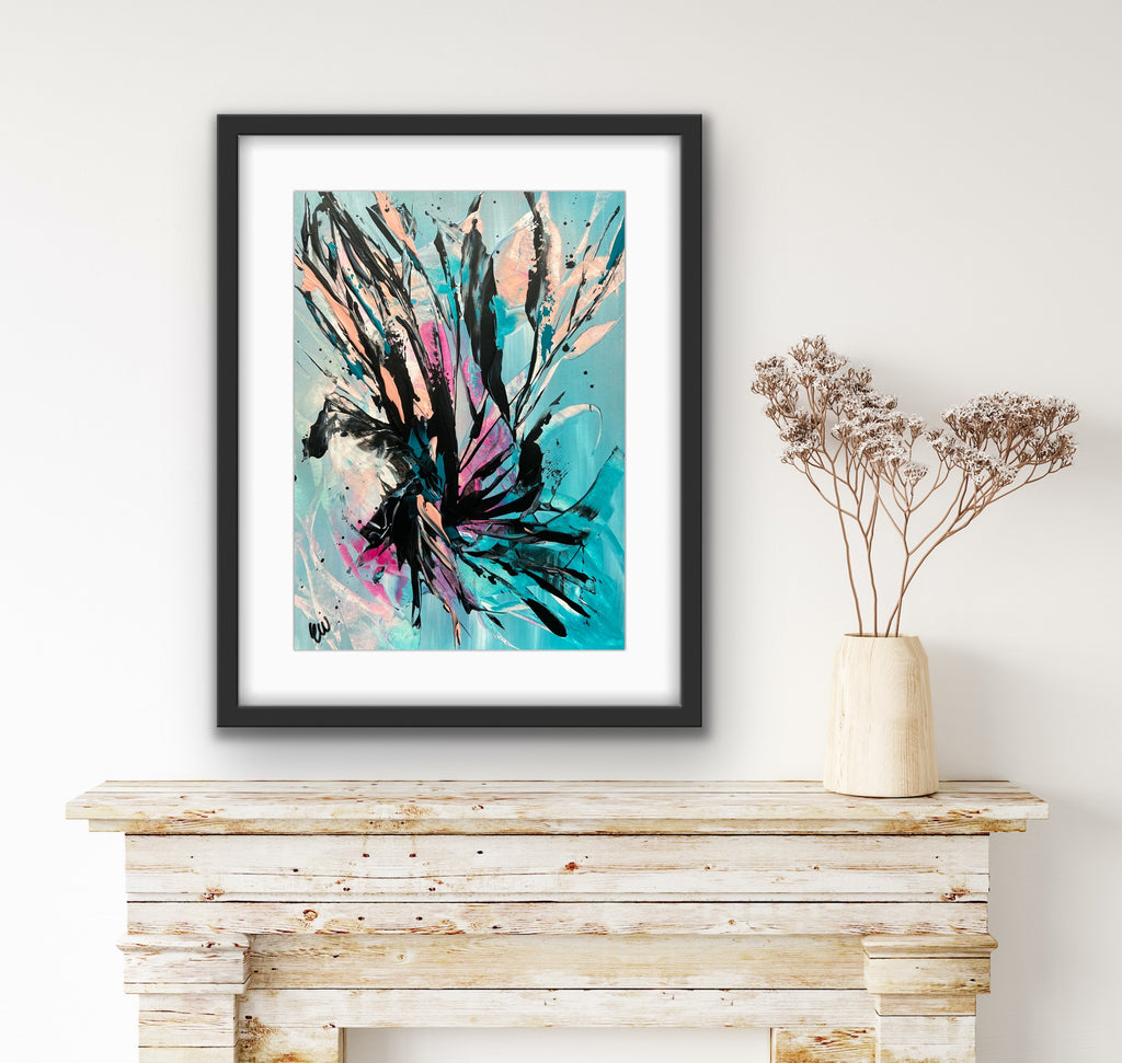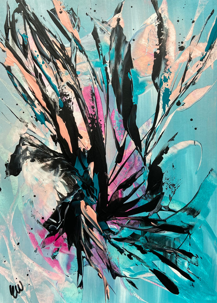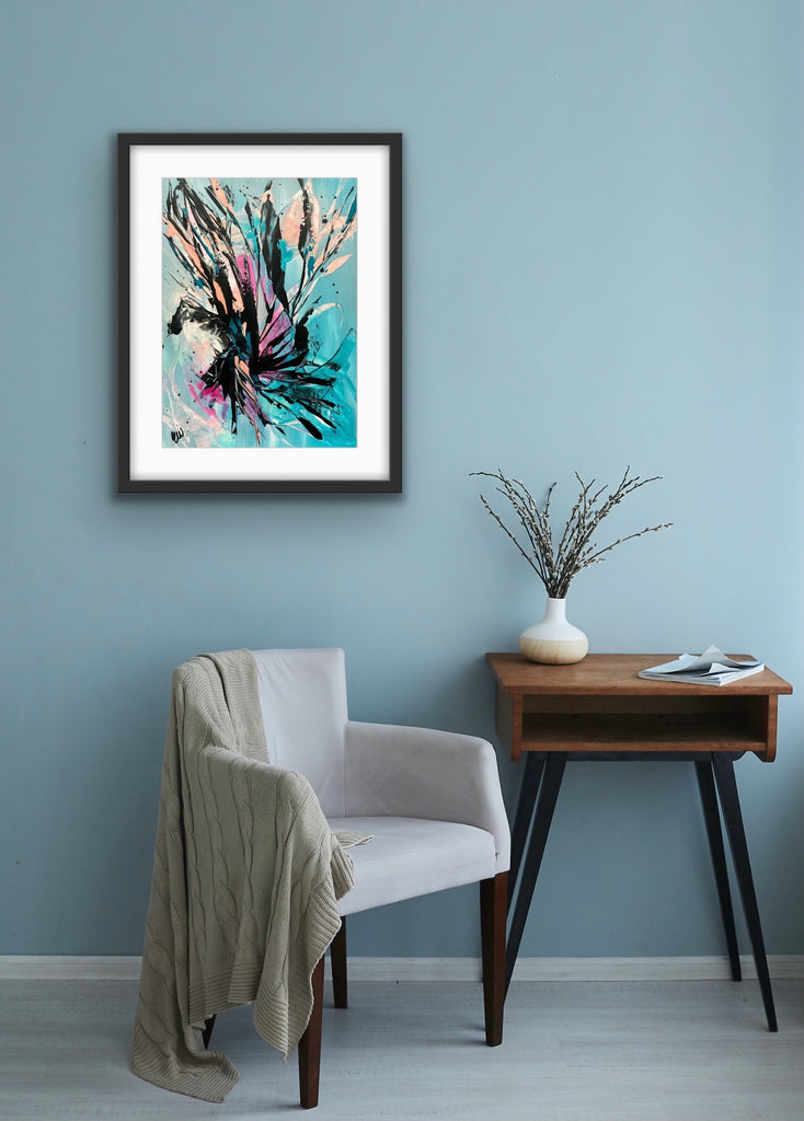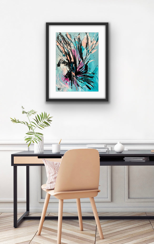 Elated is a very pretty abstract piece that is bursting with joy! Some images show what this piece looks like framed. Frames not included. 29.7 x 42 cm (A3 size) Acrylic on paper. Requires framing. No returns on original artworks so please choose carefully.