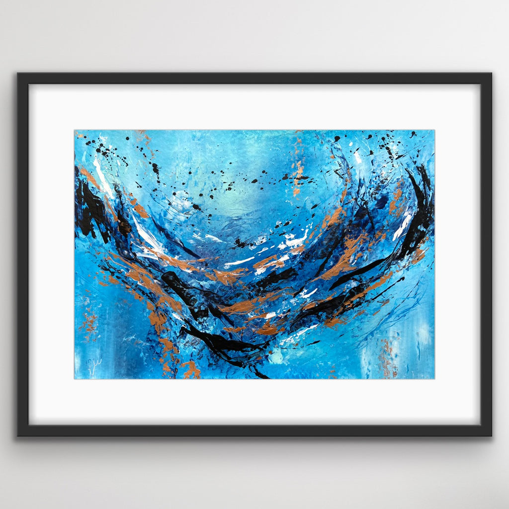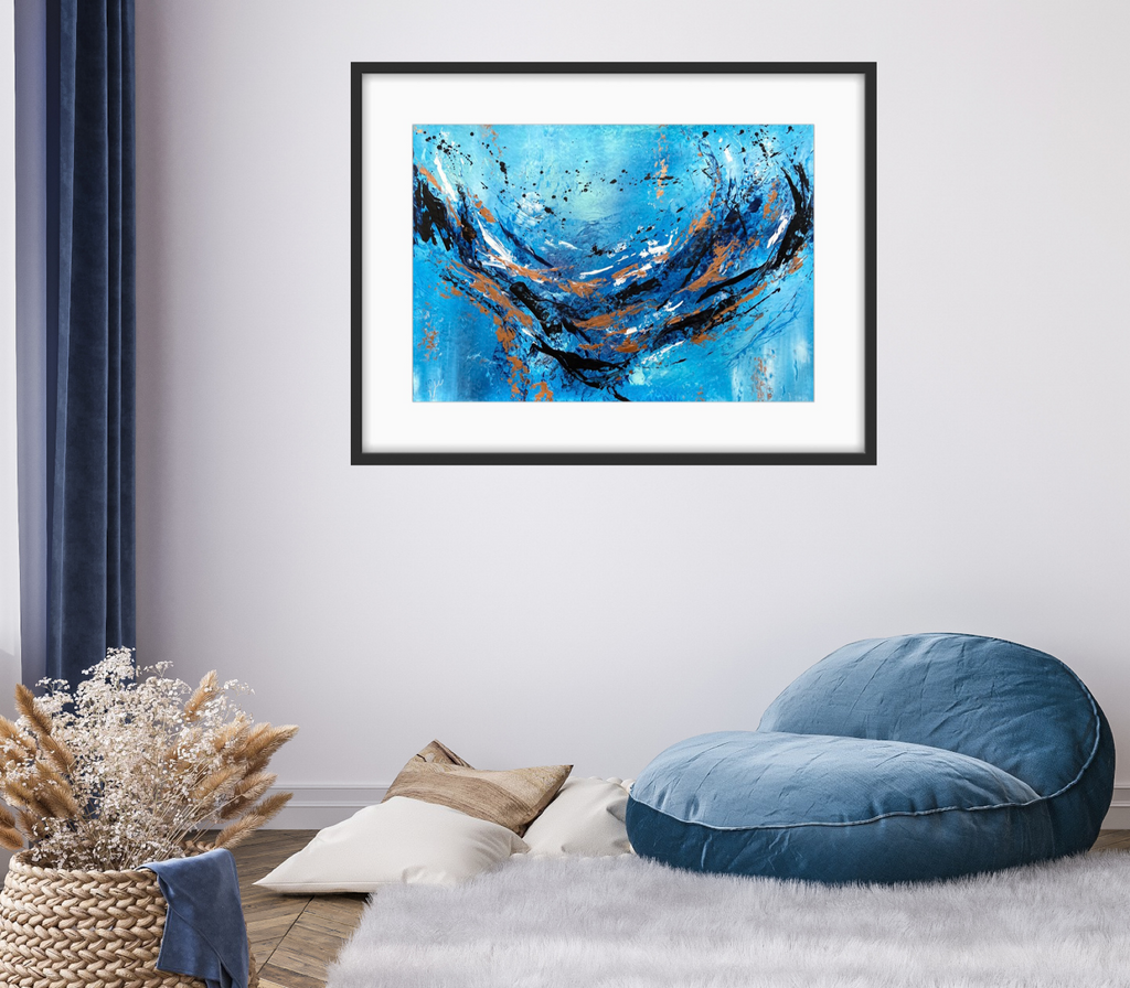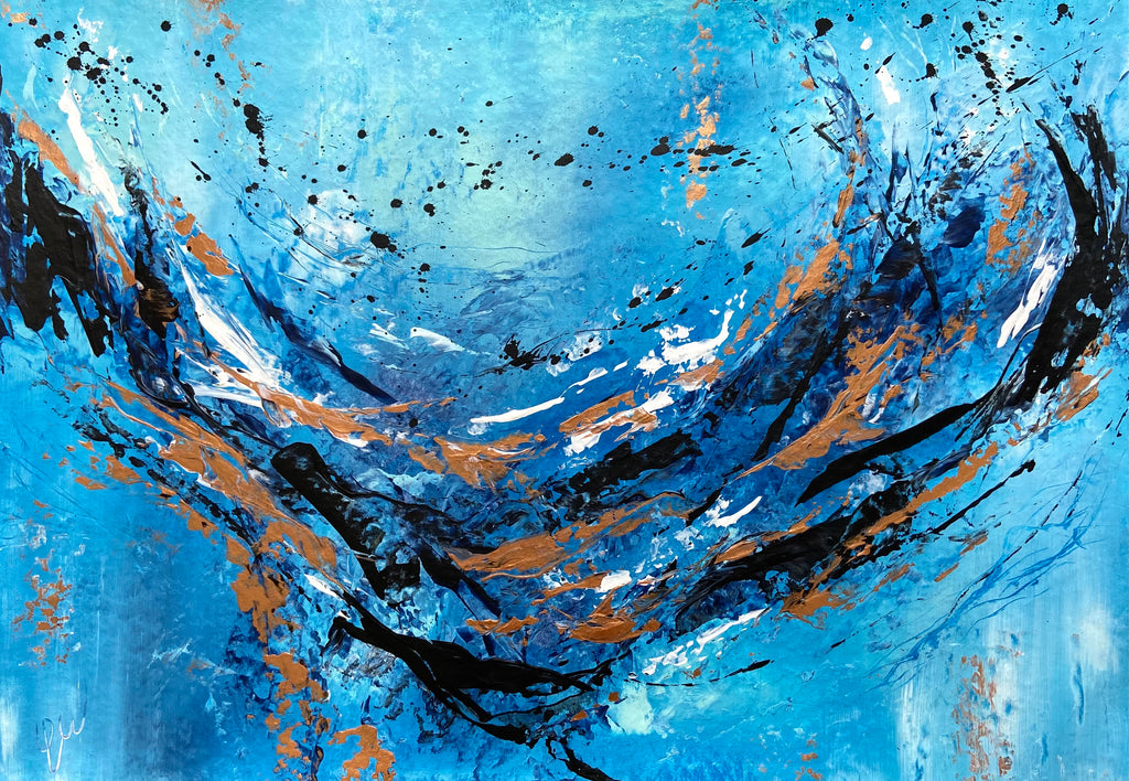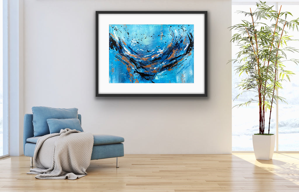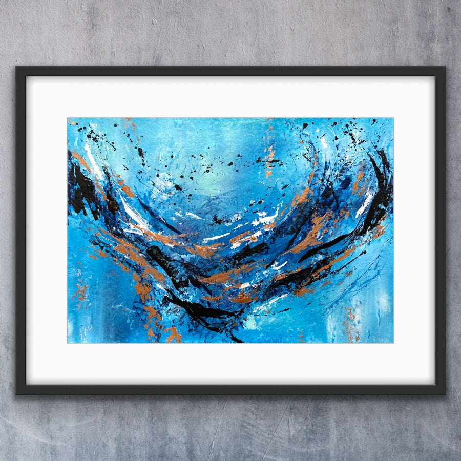 Luminescent is a very lively abstract filled with energy and captured movement. This piece has beautiful shimmering metallic accents. Some images show what this piece looks like framed. Frames not included. 59.4 x 42 cm (A2 size) Acrylic on paper. Requires framing. No returns on original artworks so please choose carefully.