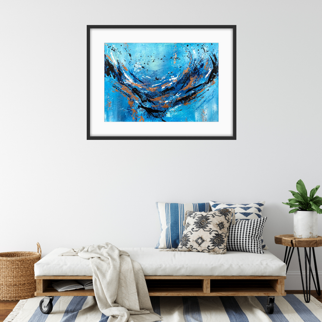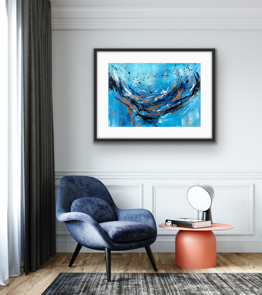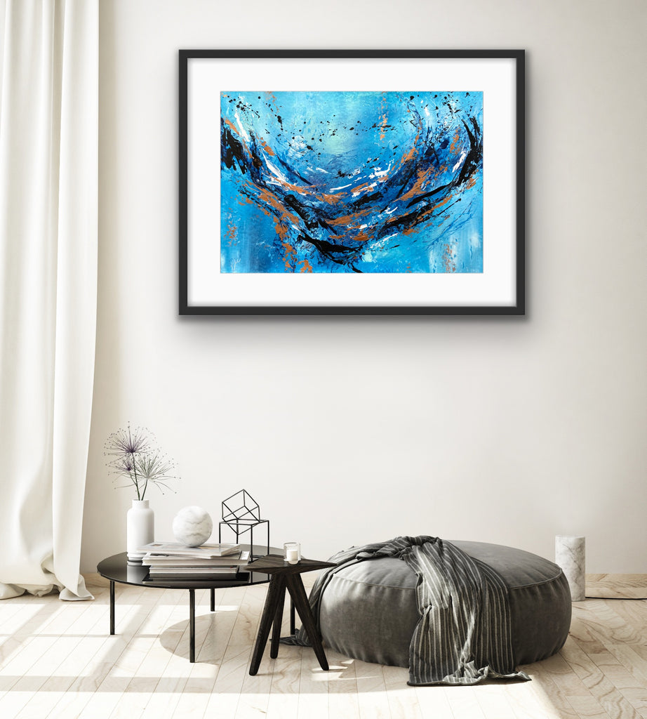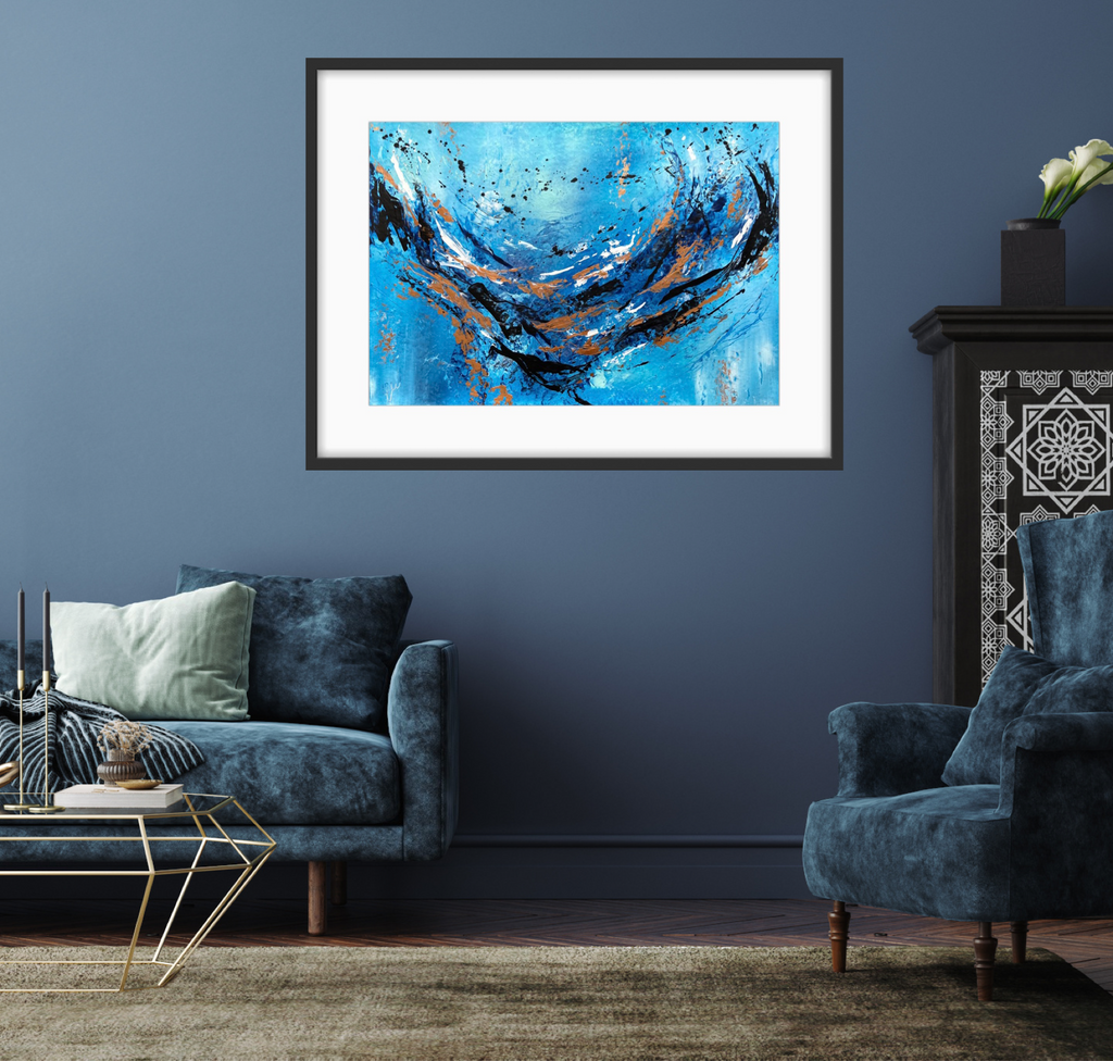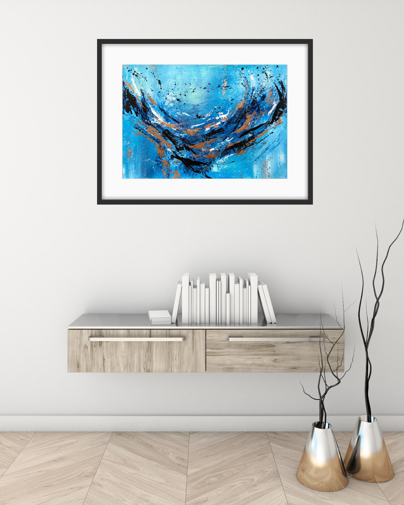 Luminescent is a very lively abstract filled with energy and captured movement. This piece has beautiful shimmering metallic accents. Some images show what this piece looks like framed. Frames not included. 59.4 x 42 cm (A2 size) Acrylic on paper. Requires framing. No returns on original artworks so please choose carefully.